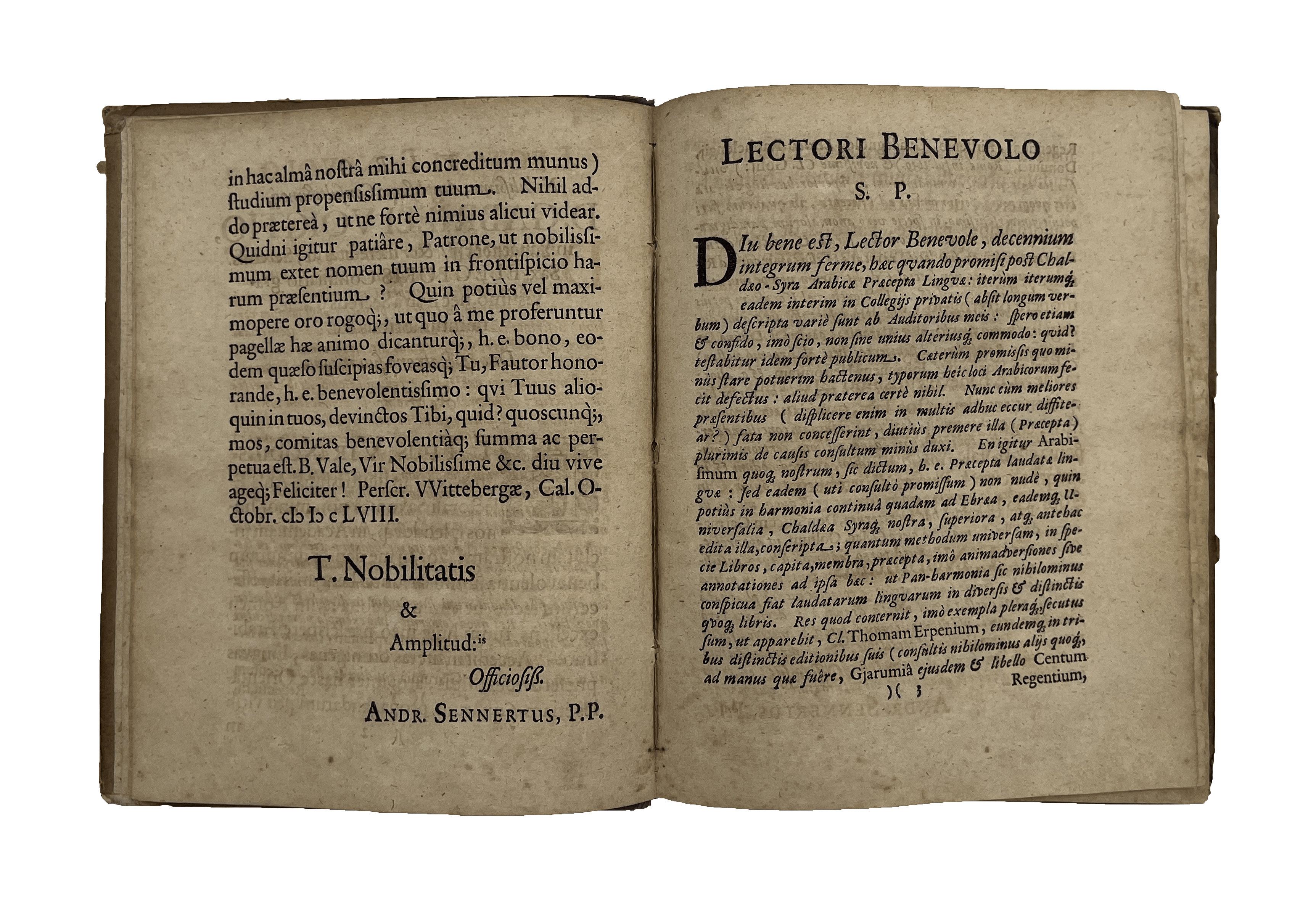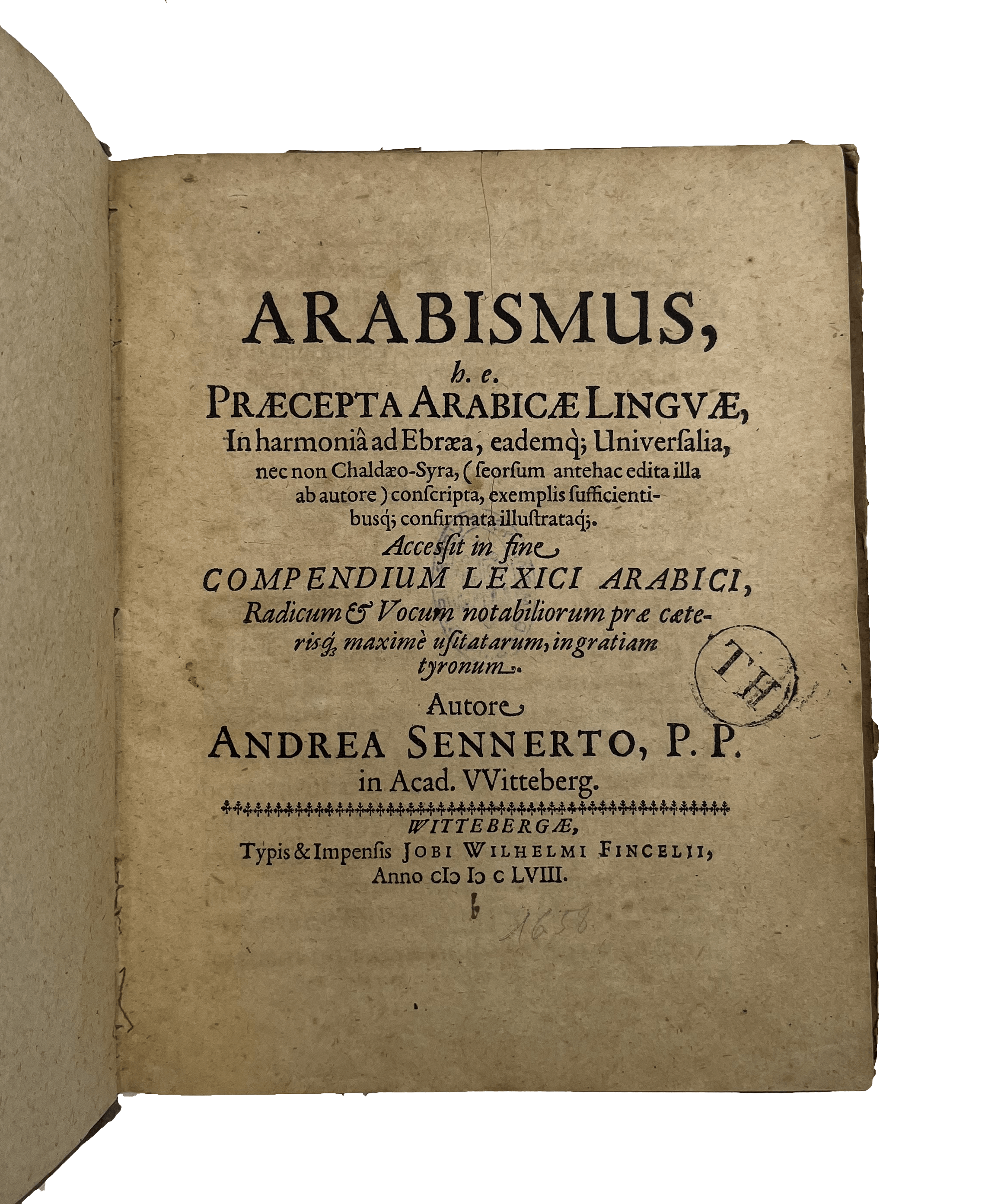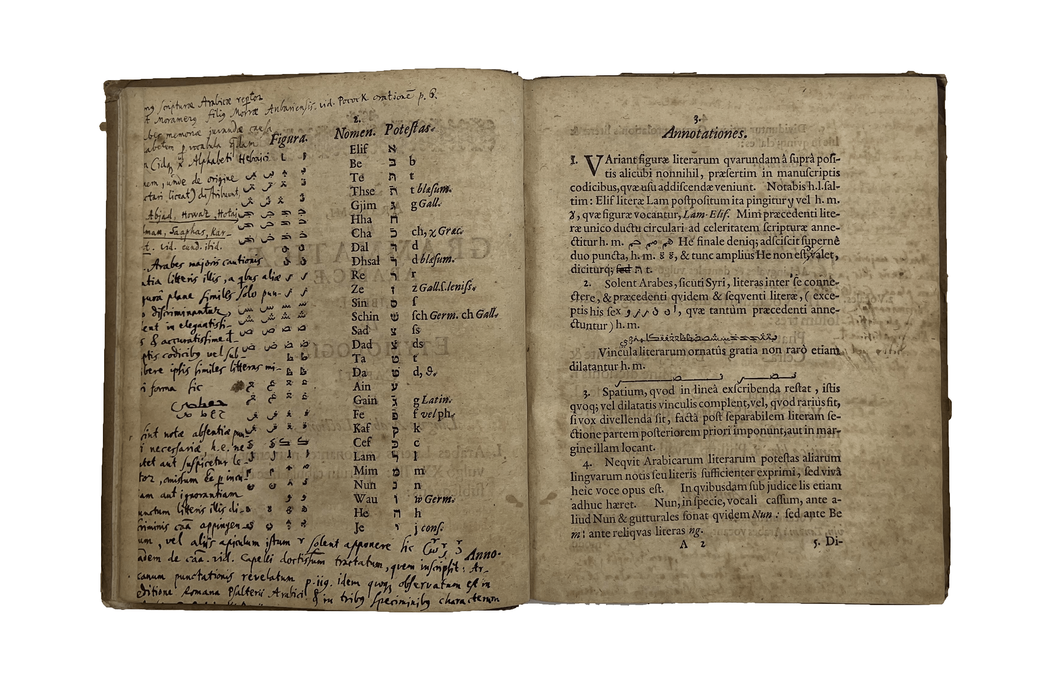 A most interesting copy of the first edition of this famous Arabic grammar printed in Wittenberg – with extensive annotations from a learned scholar c.1680-90. Western annotations in Arabic at this date are most uncommon. Son of the physician Daniel Sennert, Andreas (1606-89) was a pupil of the renowned Arabist Johannes Golius, and professor of Oriental Languages and librarian at Wittenberg from 1640 until his death. ‘[He] had a significant impact in shaping the further course of studies in Hebrew and Oriental languages […]. He had a special interest in Arabic […] not only as an additional philological tool for interpreting the Old Testament but also because of its importance as a still living language and a means for direct access to the scientific writings of the Arabs’ (Miletto, p.17).