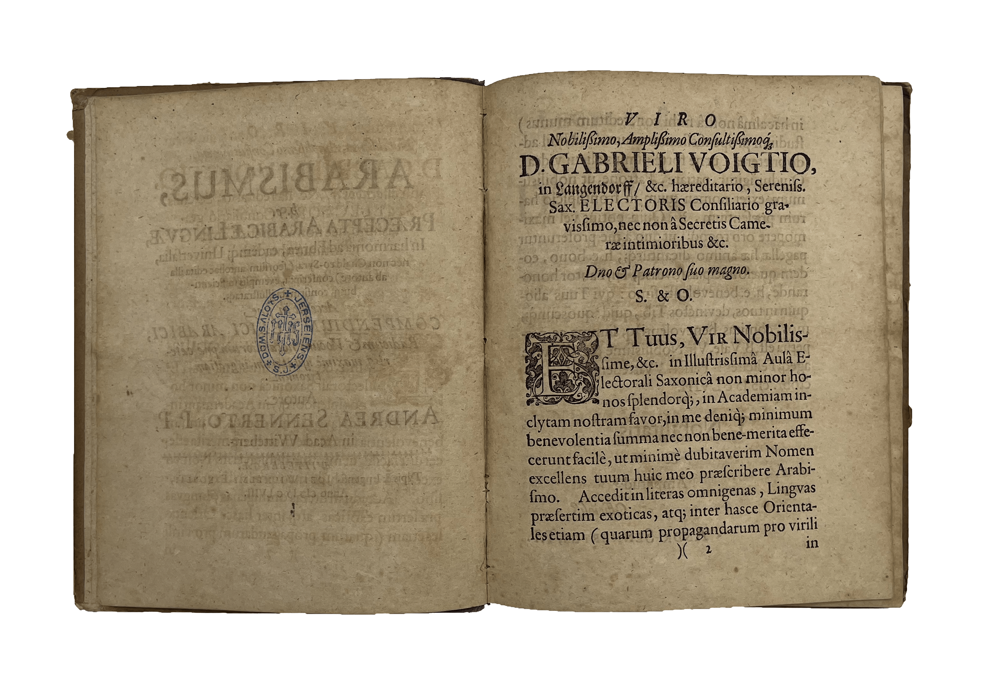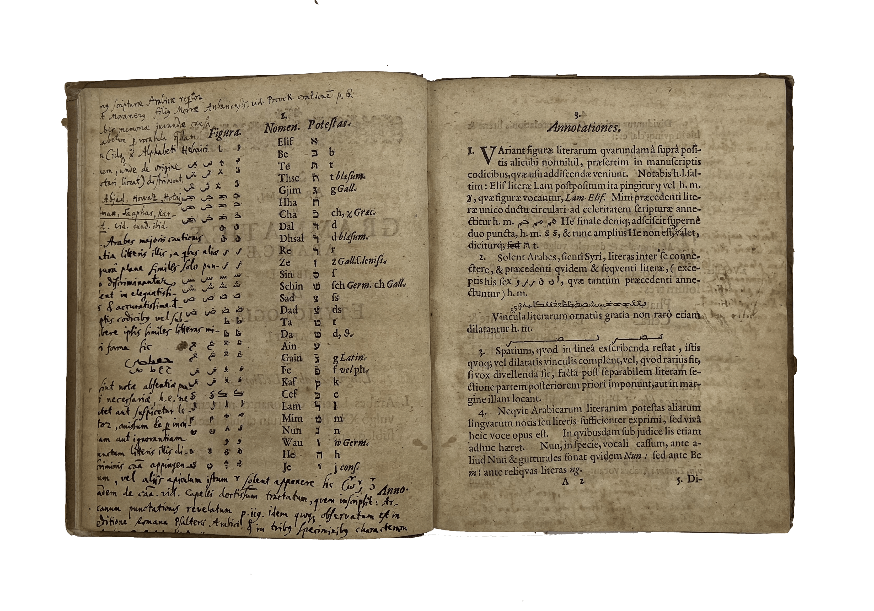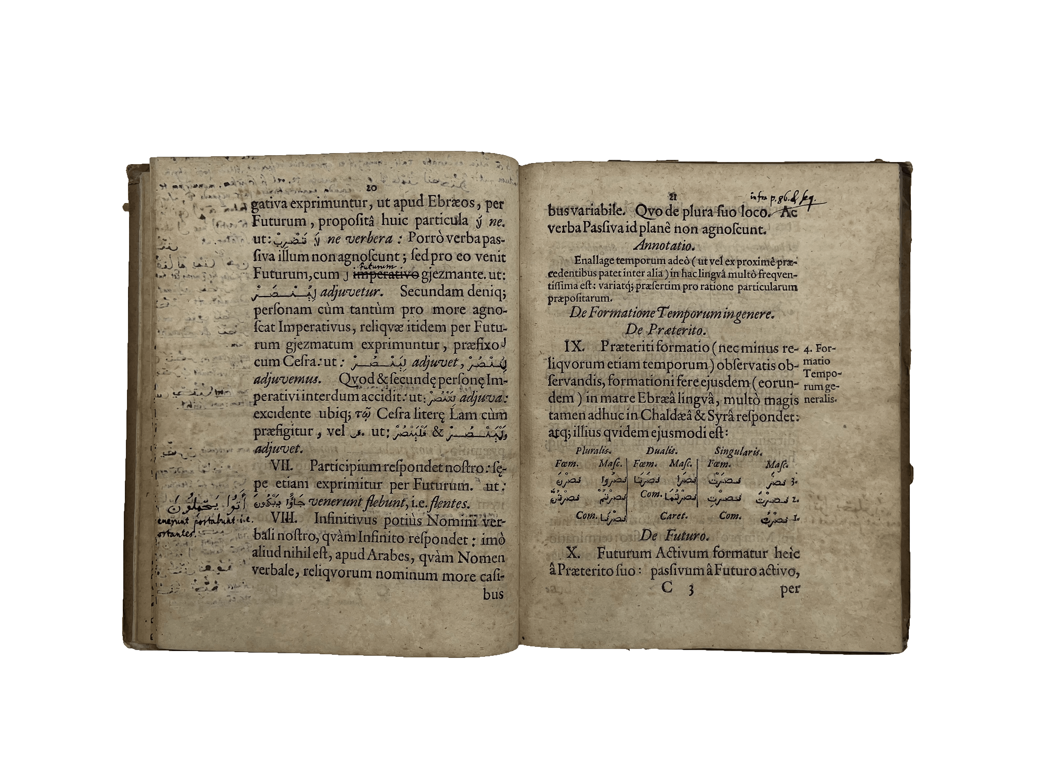 A most interesting copy of the first edition of this famous Arabic grammar printed in Wittenberg – with extensive annotations from a learned scholar c.1680-90. Western annotations in Arabic at this date are most uncommon. Son of the physician Daniel Sennert, Andreas (1606-89) was a pupil of the renowned Arabist Johannes Golius, and professor of Oriental Languages and librarian at Wittenberg from 1640 until his death. ‘[He] had a significant impact in shaping the further course of studies in Hebrew and Oriental languages […]. He had a special interest in Arabic […] not only as an additional philological tool for interpreting the Old Testament but also because of its importance as a still living language and a means for direct access to the scientific writings of the Arabs’ (Miletto, p.17).