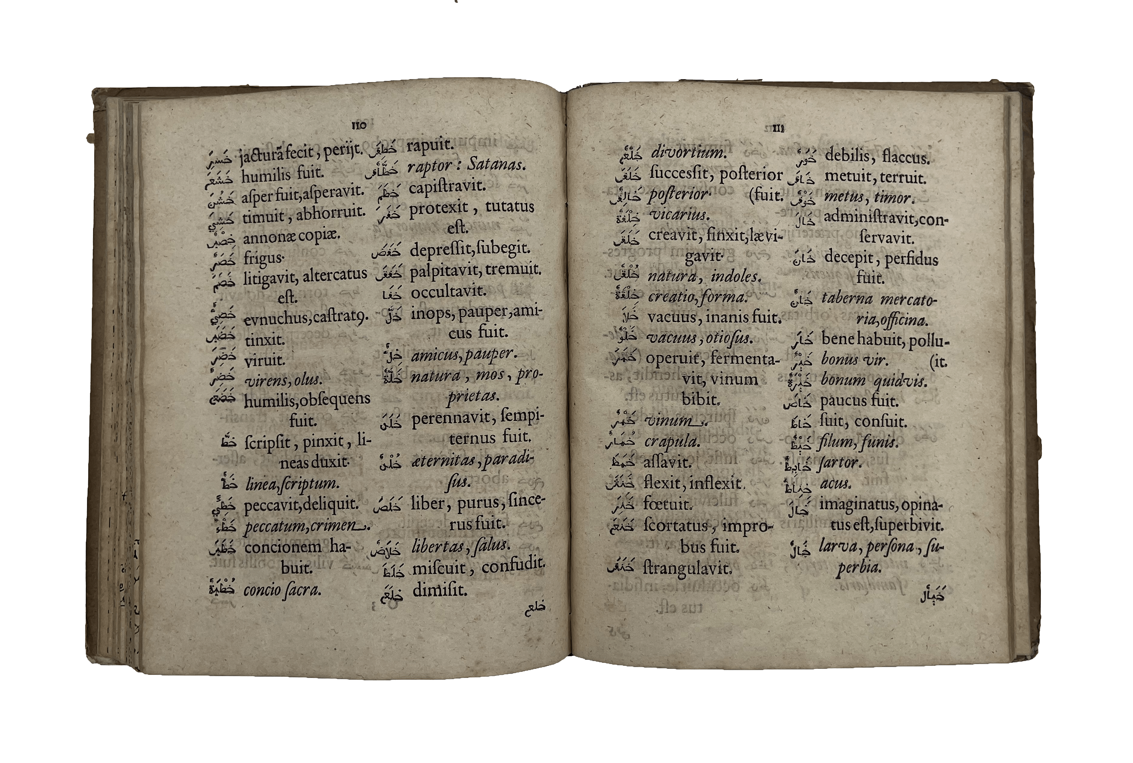 FIRST EDITION. 4to. pp. [8], 166. Arabic letter, with Roman, little Italic. Decorated initials and ornaments. General light browning. c1900 ink stamp of the Jesuit College of Jersey to title recto (faint) and verso, c1800 round ink stamp TH to title. 51 pages with ms annotations in Arabic and Latin in a cursive Germanic hand c.1670-80, a dozen extensively so, slightly trimmed to upper and outer margin but perfectly legible, two C20 paper slips with inked ms notes, one tipped-in, the other pasted to rear pastedown. A good copy in C19 paper boards, gilt label, loss to spine, hinges starting but firm.