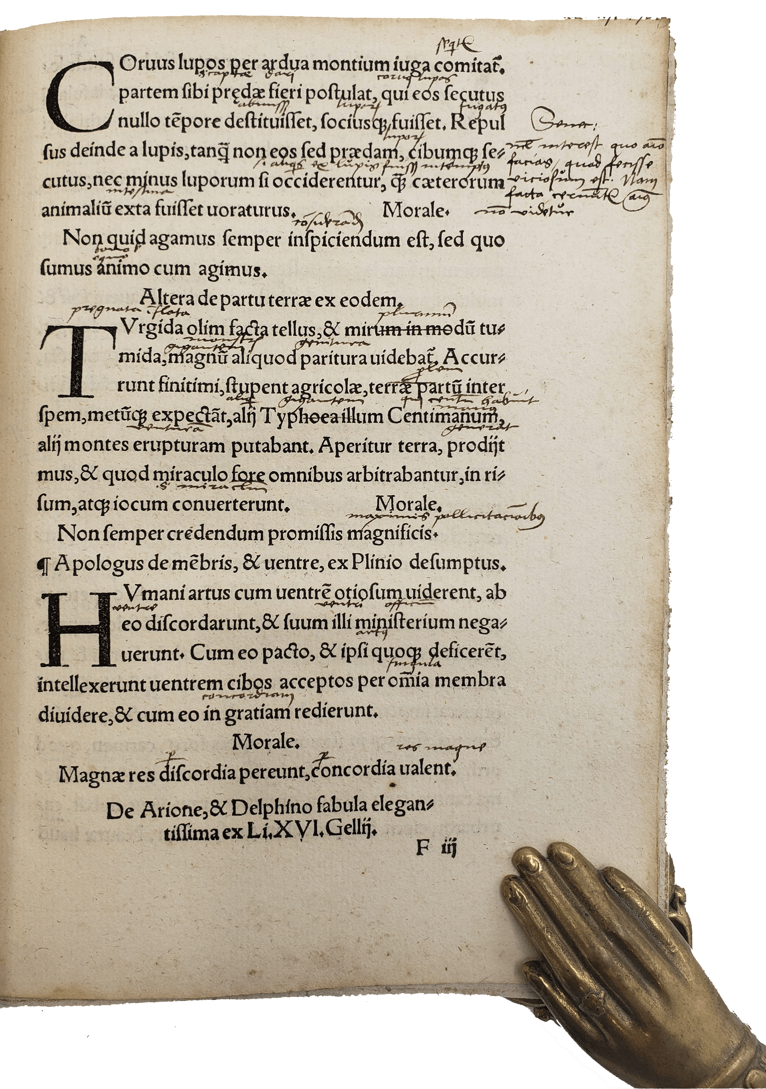 A charmingly-printed, scarce early edition, intended as a textbook, of ancient Latin fables by Aesop, Aulus Gellius, and Pliny, adapted and edited by major humanists such as Erasmus, Politianus, and Crinitus. Short fables were among the fundamental instruments for the teaching and learning of Latin and Greek by humanist educators and scholars. Erasmus considered Aesop’s fables essential as ‘primers’, ‘exercises for composition’, and ‘moral training’ (Reiger, p.52), and was a great promoter of Aesop in the C16. The edition presents each fable plainly and simply, with generous interlinear blank space for annotations.