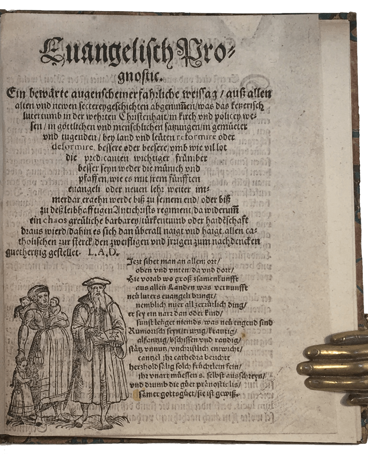 A remarkably clean copy of this German astrological almanac—a rare survival of C16 ephemera. A former Lutheran preacher, Lorenz Albrecht (1540-1606) was the author of German and Latin religious works and re-converted to the Catholic faith in 1567. ‘Evangelisch Prognosticon’ testifies to his disillusionment with the Protestant Reformation—‘the Gospel of Luther’—and his intent to oppose this heresy through the popular genre of the almanac, imitating Johannes Nas’s ‘Practica Practicarum’. As usual in astrological almanacs, it discusses planets, constellations, zodiacal signs and the seasons and their influx on humans with references to ancient authorities like Pliny and Manilius; but the tone is grim and planets are seen as harbingers of vices. The ominous statement by which the seat of the devil is at the centre of the earth and heresy is at the centre of the universe shows how Albrecht’s almanac presented the influence of the cosmos as something that Catholics should resist through will and spiritual exercise so as not to succumb to the Protestant heresy.