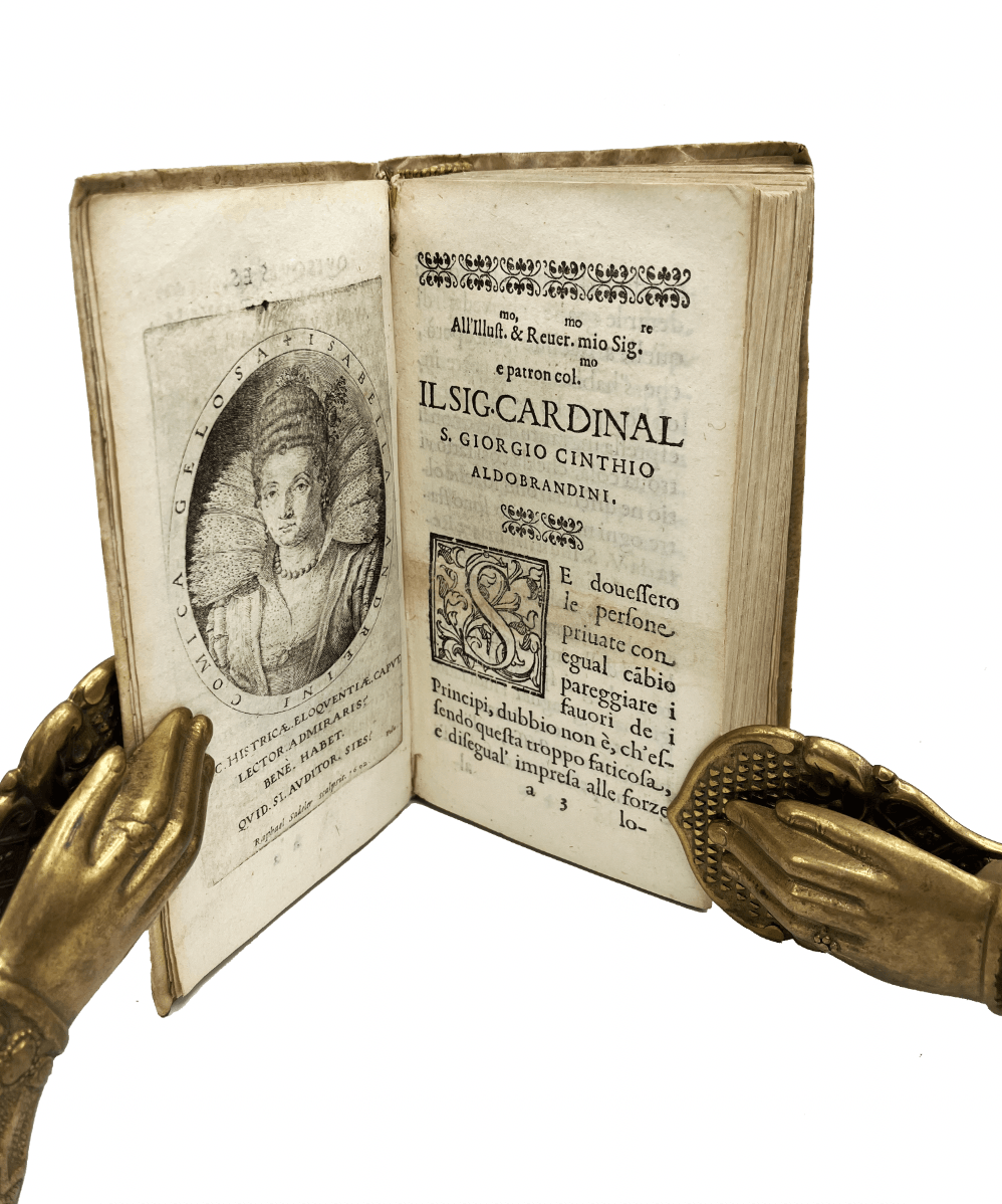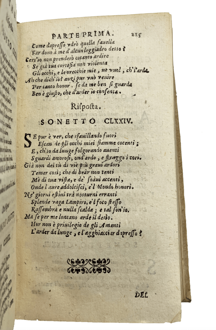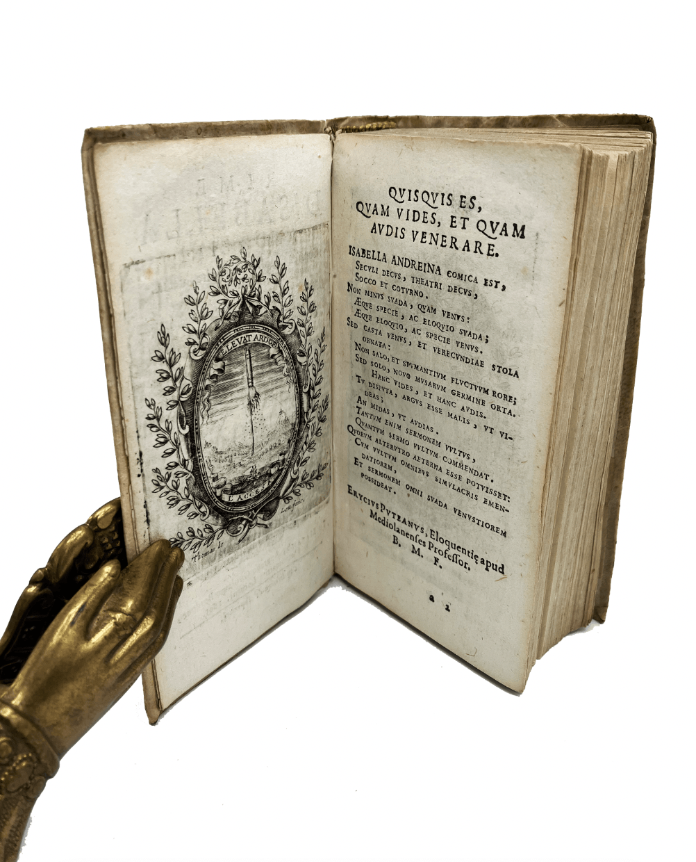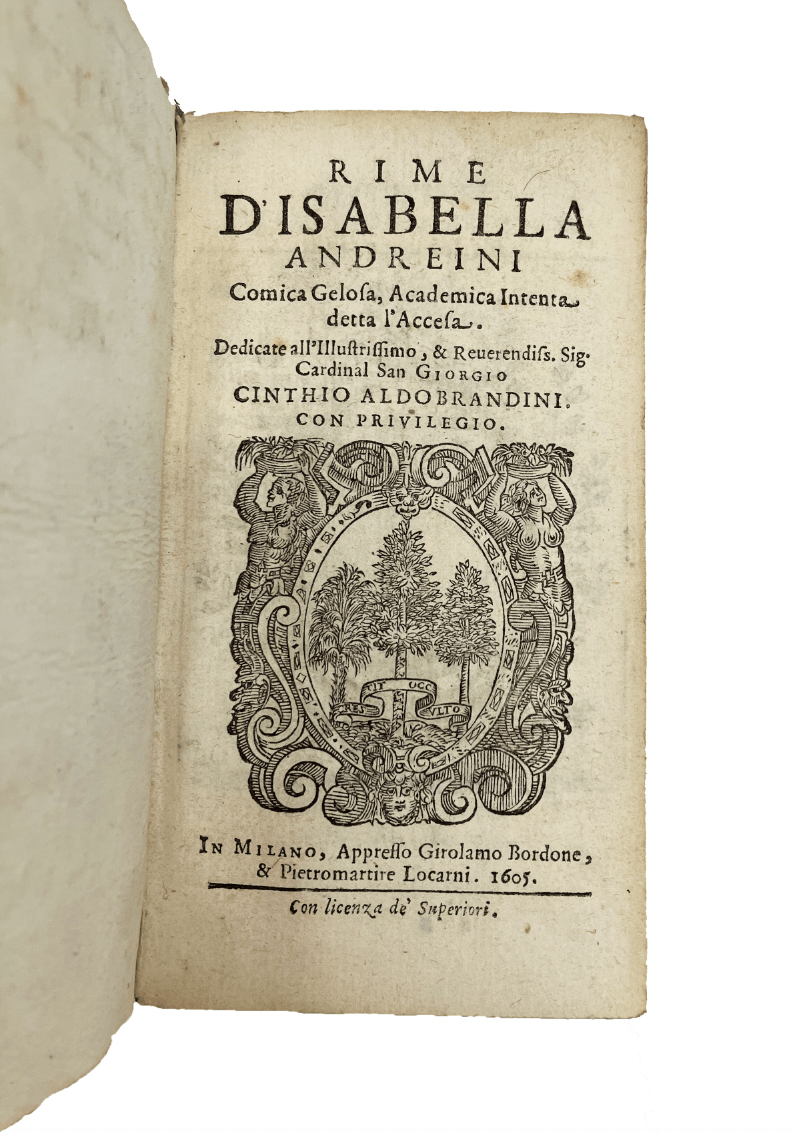Rare second Bordone edition of the collected Rime and Sonetti of Isabella Andreini (1562-1604), first published in 1601; a Parisian edition also appeared in 1603. The first edition to appear after Andreini’s death while travelling from France to Italy, it contains numerous laudatory odes and elegies in Italian and Latin, appearing here for the first time. Andreini was a noted Italian actress of the commedia dell’arte who performed with the Compagnia dei Comici Gelosi, one of the predominant troupes of the time; the stock character of the inamorata Isabella is supposedly named for her. In addition to the plays that she wrote for I Gelosi, Andreini’s poetry earned her a reputation for eloquence, which gained her a place in the Accademia degli Intenti of Pavia (for which she took the name ‘Accessa’, appearing here in the emblematic frontispiece), and which is attested here in the elegiac verses, all by men, many fellow academicians, at the start of the volume. Andreini was chiefly a writer of Petrarchan sonnets, of which there are well over two hundred in this volume. The index of titles further divides Andreini’s poems into madrigali, canzoni, sestine, epithalami, centoni and capitoli, as well as funerary verses and eclogues, the latter describing the love affairs of various shepherds and nymphs.
