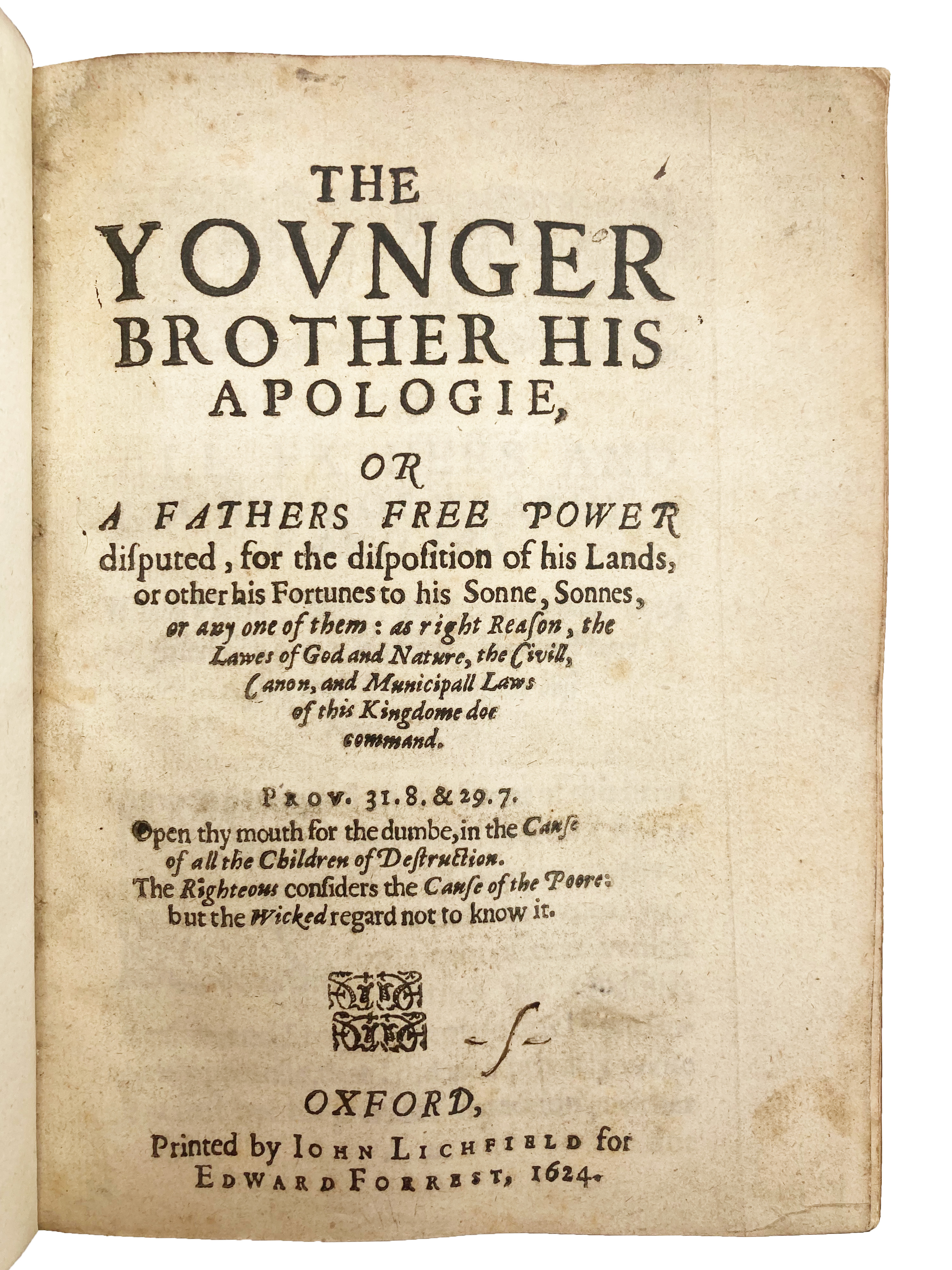 The Younger Brother his Apologie, or a Father’s Free Power Disputed, for the disposition of his Lands.