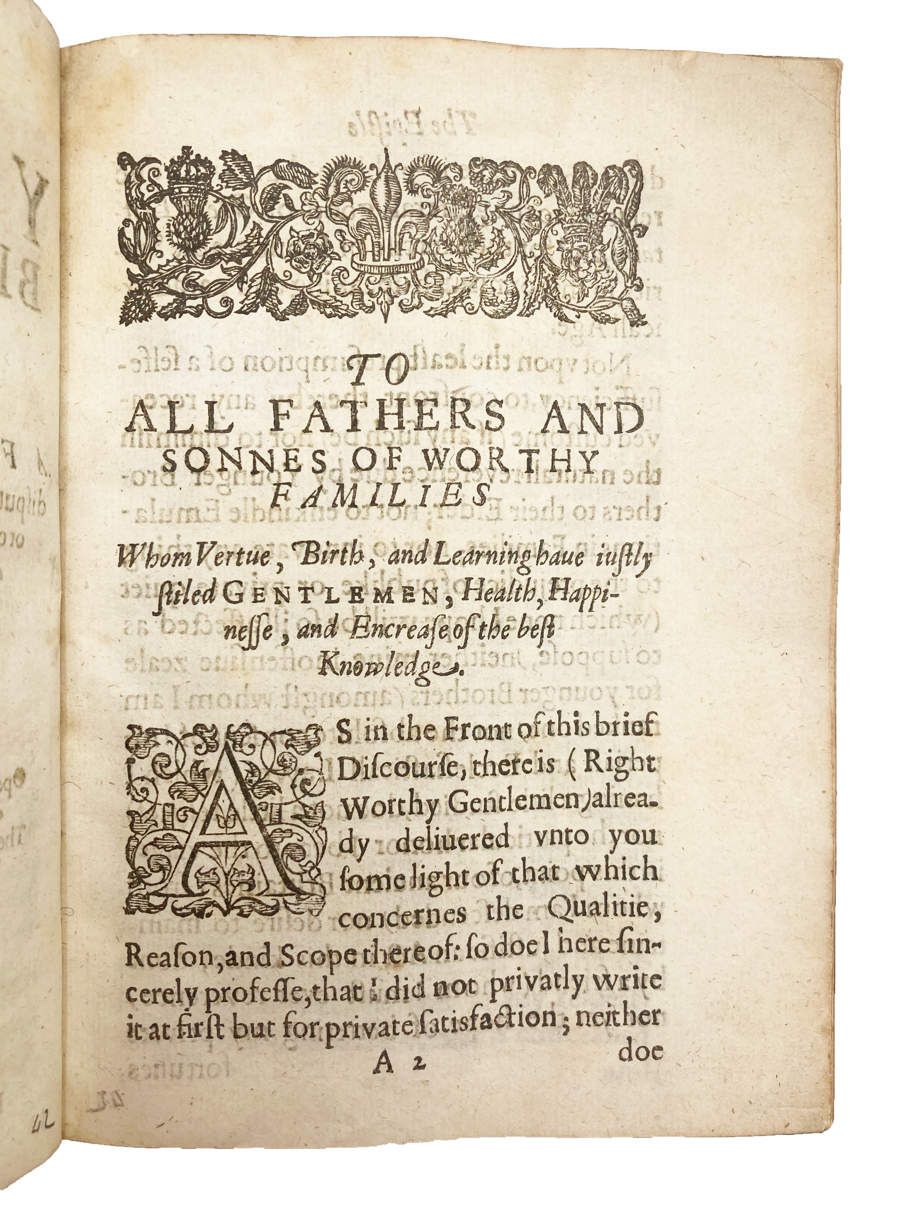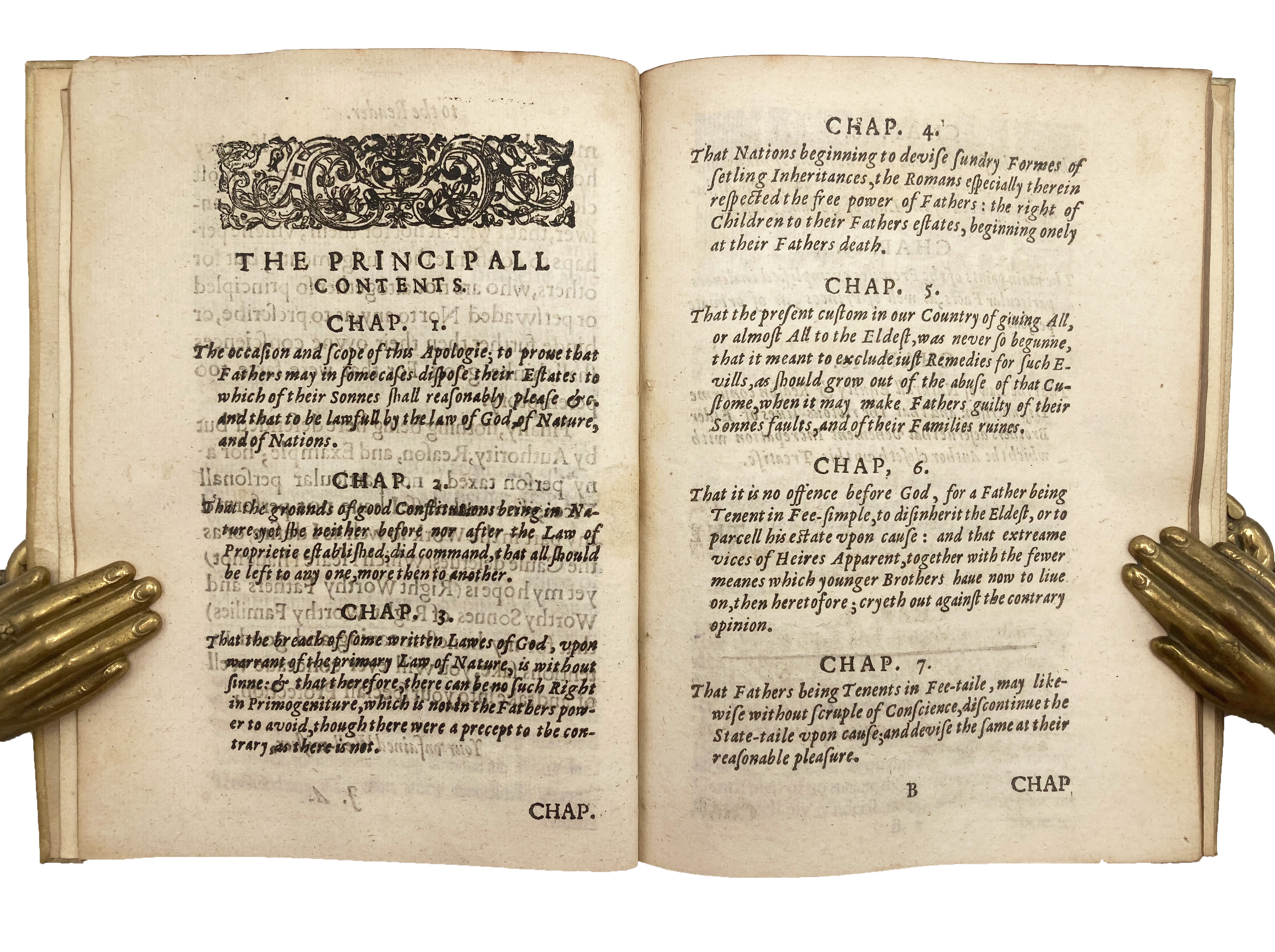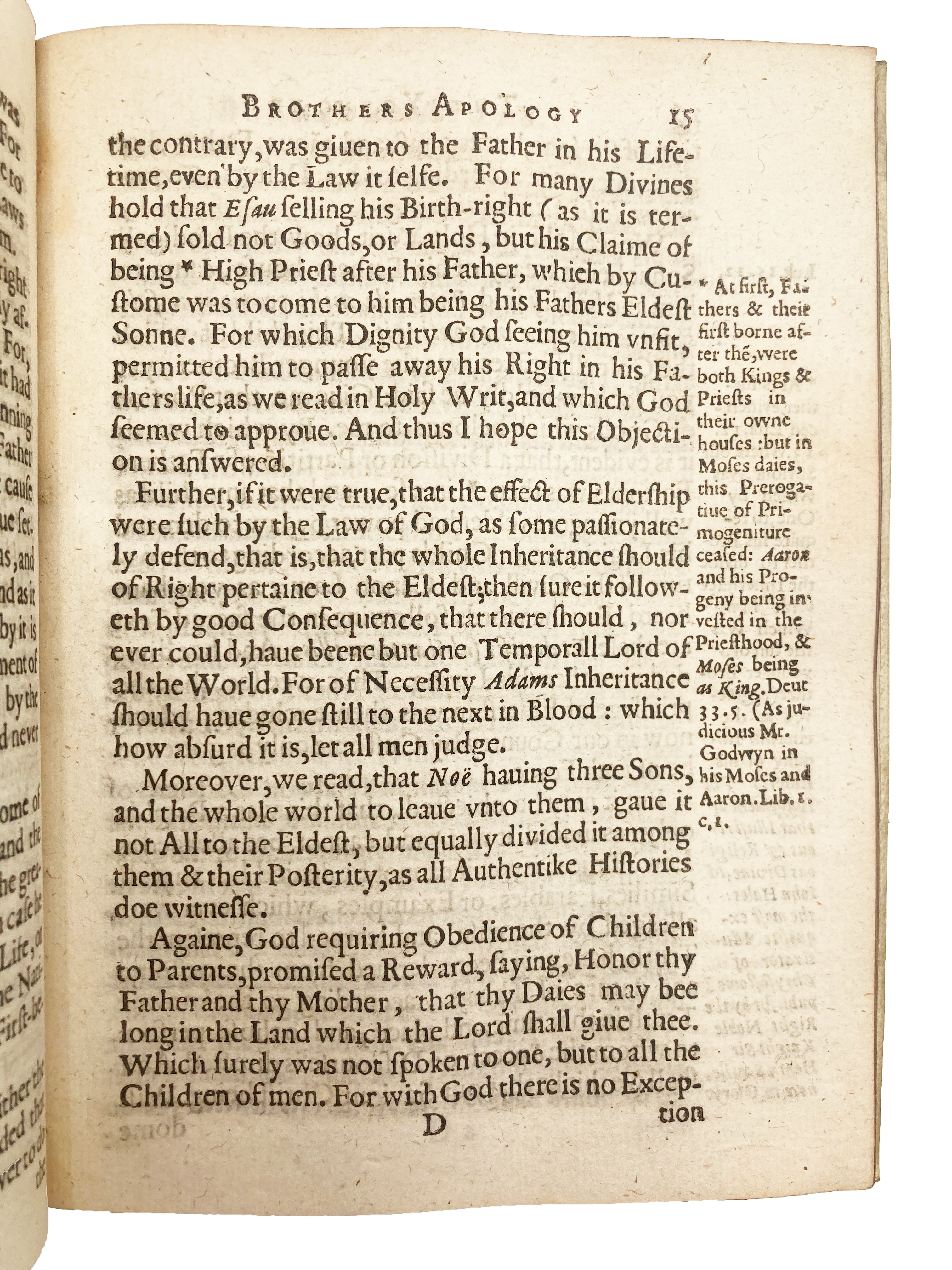 Second edition, first issue; first published 1618. A pamphlet against primogeniture, with a prefatory letter to the ‘Fathers and Sons of Worthy Families.’ Ap Robert’s chief gripe with primogeniture stems from what he perceives to be moral decay arising among heirs apparent, i.e. eldest sons, which he calls the ‘insociable inheritors’ while referring to their ‘extreme vices.’ Why should these inherit, he asks, while their younger brothers are left penniless? Ap Robert appeals to natural law to justify the omission of written biblical laws advancing primogeniture; to Roman civil law as an example of a reasonable law concerning inheritance, in which all inherited equally; and, finally, to English common law, as having the power to overrule what he sees as a pernicious custom. Strangely, however, he makes no reference to the English customary law of “gavelkind,” a Kentish law which allowed land to be divided equally among all the testator’s sons, and which technically remained in force in Kent until 1925, when the Administration of Estates Act effectively ended primogeniture and, additionally, allowed women to inherit on the same terms as men. Ap Robert’s omission of this customary law is probably due to his argument that a father should be still able to choose only one of his sons to inherit, if he should so wish, but to determine precedence according to merit rather than age.
