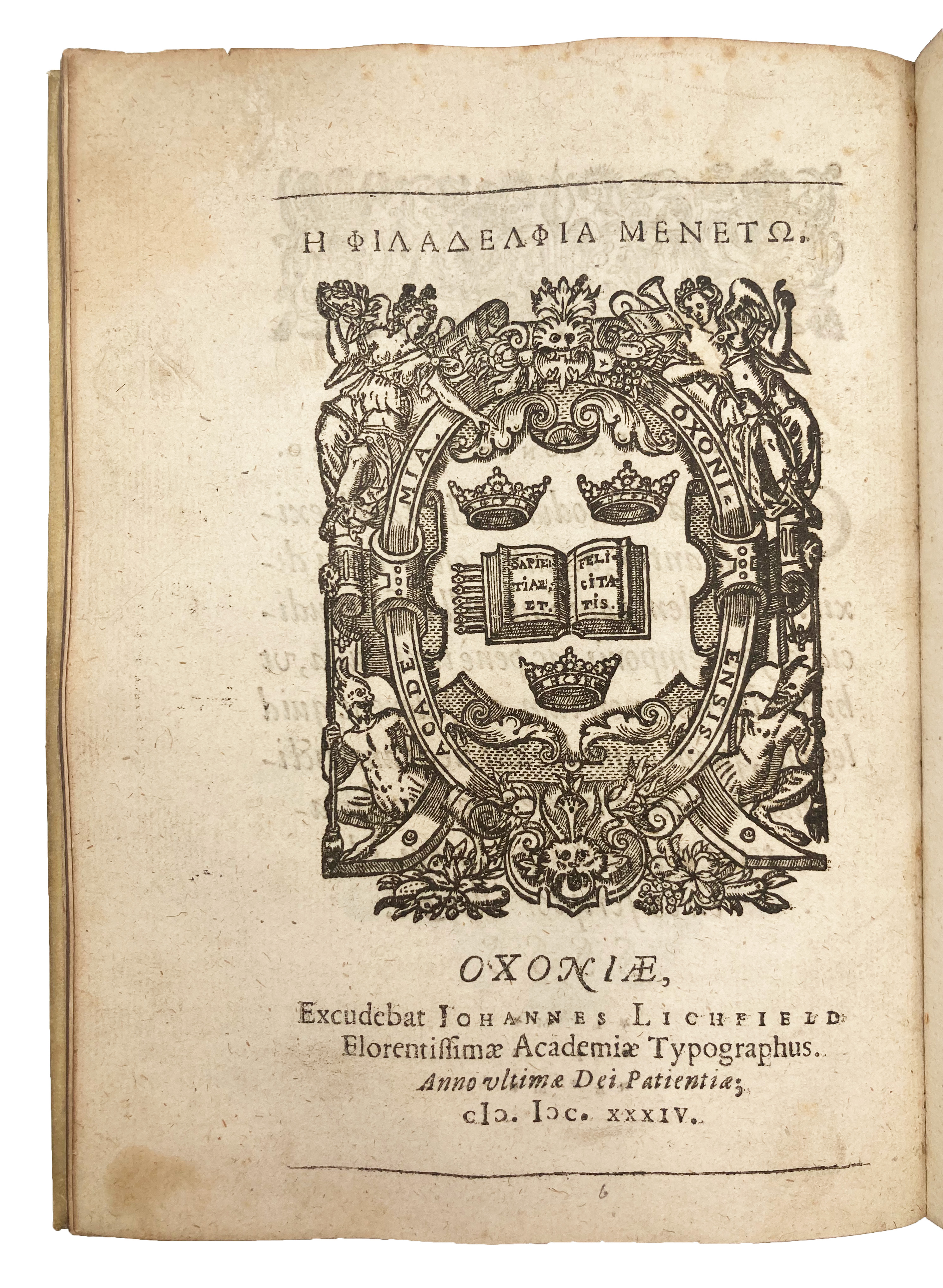 4to. pp. (x) “60” [i.e. 56] (ii). Roman and italic letter. Large woodcut arms of the University of Oxford to final verso. Woodcut initials, head- and tailpieces, typographical ornamentation to t-p and to final recto, with a ludic typographical arrangement of the author’s initials (with other letters of unknown significance). The Britwell copy, modern limp vellum by Rivière with monogram supralibros, gilt, of William Henry Miller. Fox Pointe bookplate. A few light smudges, small paper flaw to F3 and repair to H2, each affecting couple of letters, a very good copy.