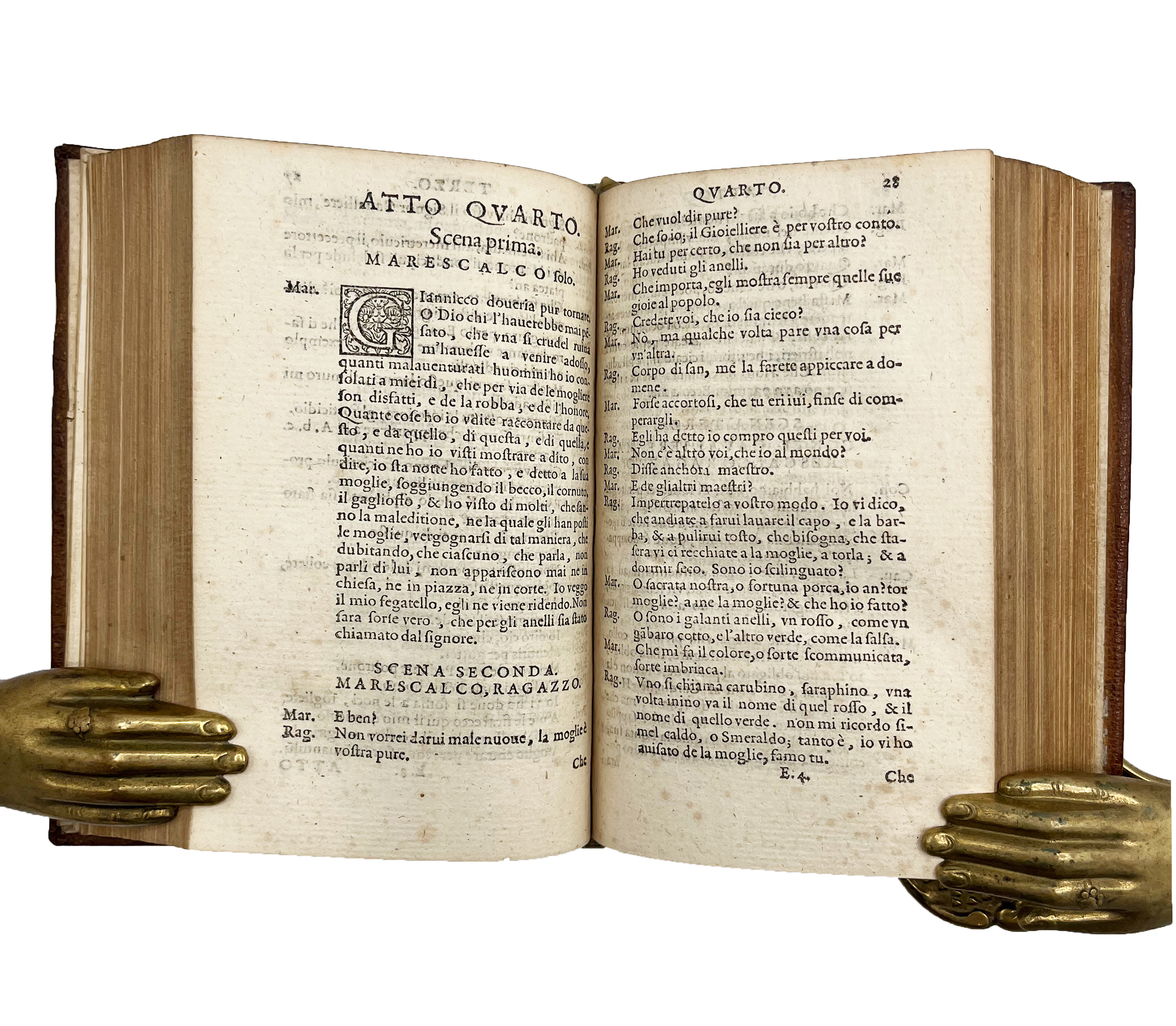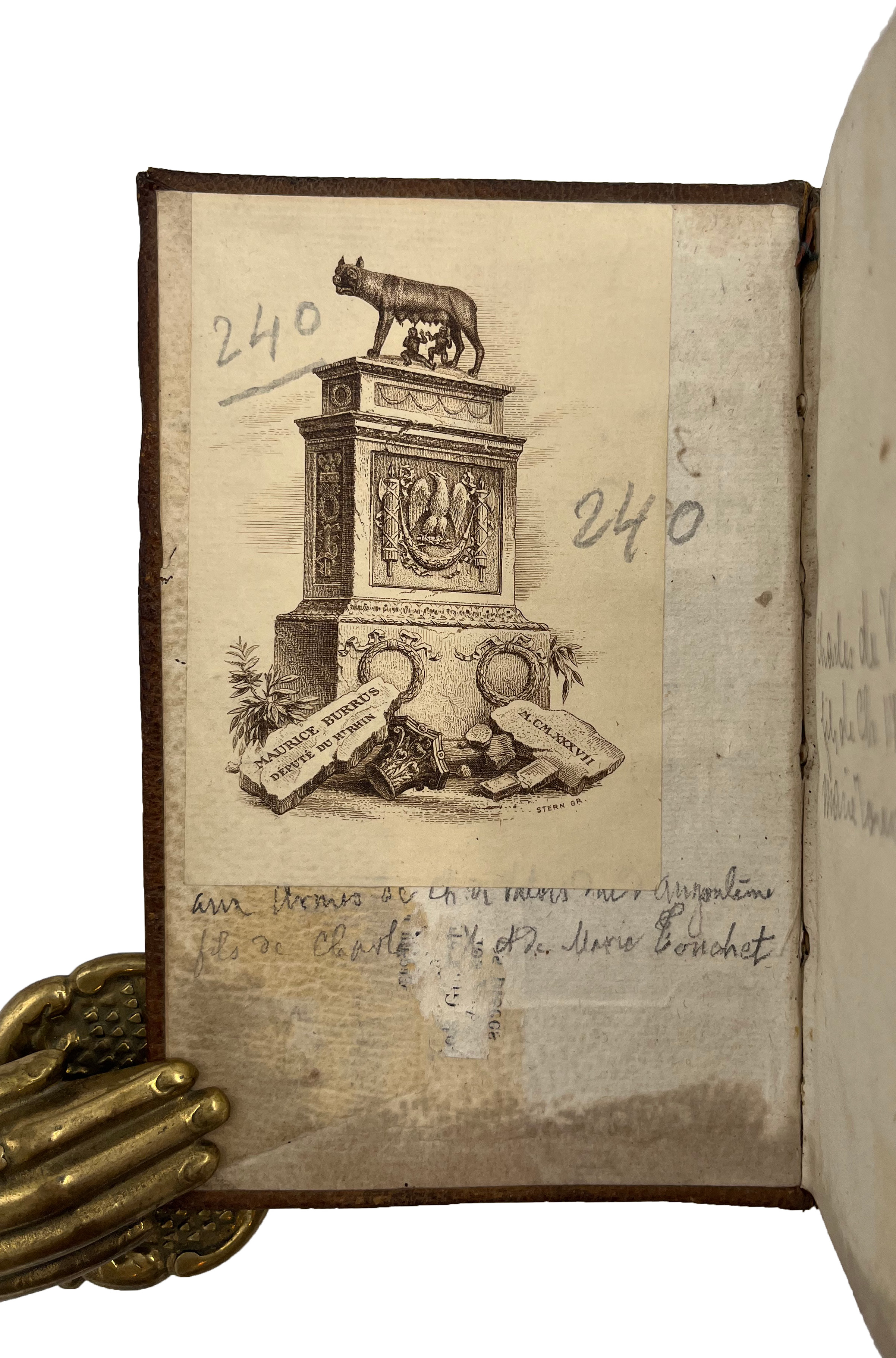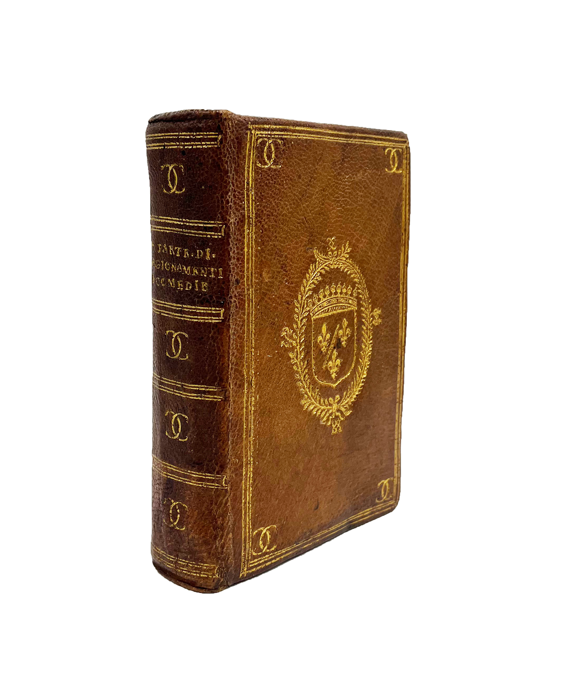8vo. Two vols in one. 1) ff.[iv], 202, [ii]; [* , A-2B , 2C ]. 2) ff. [viii], 285, [iii]. [A-2O .] “La cortigiana”, “La Talanta”, and “L’hipocrito” each have separate dated title page; pagination and register are continuous. Roman letter, some Italic. Woodcut roundel portrait of Aretino on titles of each part, small woodcut initials and headpieces, engraved bookplate of Maurice Burrus on pastedown, early autograph ‘Fayet?’ on t-p. Light age yellowing. A fine copy, crisp and exceptionally clean, in stunning contemporary tan morocco gilt, covers bordered with a triple gilt rule, ams of Charles de Valois gilt at centres within olive branch wreath, small fleurons to sides above and below, monogram of interlacing double Cs gilt to outer corners, spine double gilt ruled in compartments monogram of double Cs gilt at centres, title gilt lettered, a.e.g. spine fractionally darkened, in a red morocco box.