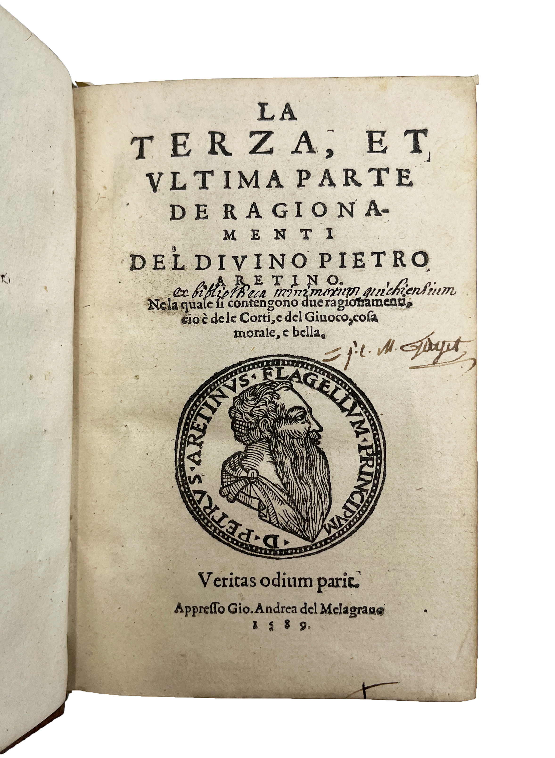 A very lovely copy, beautifully bound for Charles de Valois, the son of King Charles IX of France, of these rare editions of Aretino printed clandestinely by John Wolfe in London. These English editions of Aretino’s work, particularly the comedies, pose the question as to whether Shakespeare had read Aretino in this form. “All of the four comedies provide significant cues for Shakespeare’s plays especially for the plot construction of such works as the Taming of the Shrew, the Comedy of Errors, and Twelfth Night, where we find some unique solutions in the comedic structure which were anticipated by Aretino’s innovative theatre.” Michele Marrapodi. ‘Shakespeare and the Italian Renaissance:.’ It is certain that Arteino was of great influence on other contemporary English writers who borrowed heavily from his works, particularly Jonson and Middleton. “One of the more versatile and prolific writers in the Italian vernacular, Peter Aretino made a significant impact on the literary, political, social, and artistic world of 16th century Italy. .. At the court of Rome, Aretino developed his skill at political and clerical gossip in the form of pasquinades and lampoons. During his stay there, Aretino also drafted La Cortigiana (The Courtesan) in which he satirized the papal court and Baldesar Castiglione’s manual for courtly behaviour, Il Cortegiano (the Courtier). While Aretino is frequently described as an anti-classical, anti-humanistic, and scurrilous author who proudly posted of never having studied Latin, La Cortigiana reveals a rich heritage of sources, includingVirgil, and Erasmus, and the contemporary humanistic treatise…. In 1534 Aretino published the first part of I Ragionamenti, a series of dialogues in which prostitutes vividly discuss their profession. Like many of his other works, this play interweaves literary and historical plots with a satirical target as it parodies the literary form of the dialogue and Neoplatonic theories then in vogue as embodied in Pietro Bembo’s ‘Gli Asolani’. Jo Eldridge Carney ‘Renaissance and Reformation, 1500-1620: A Biographical Dictionary.’
