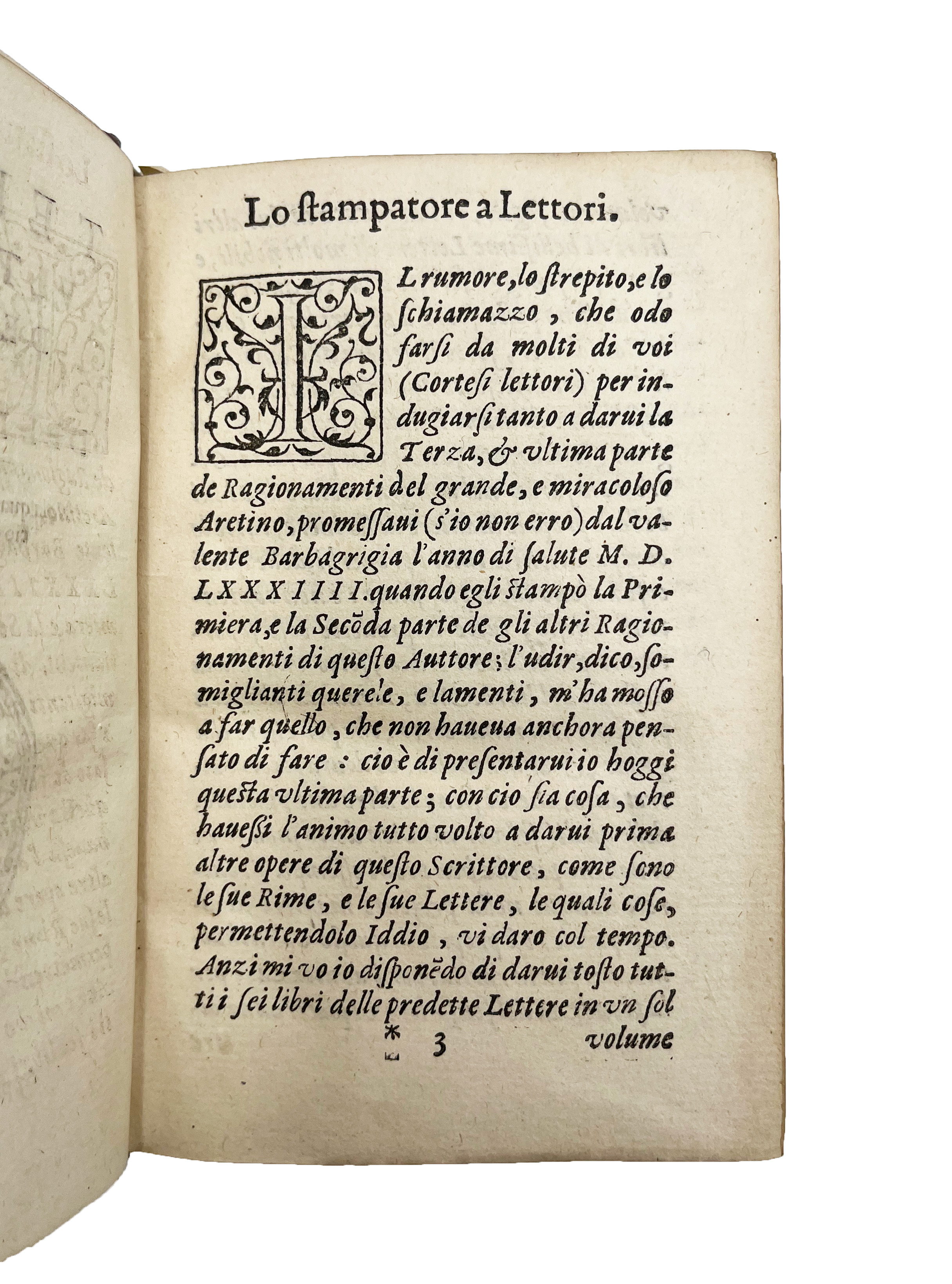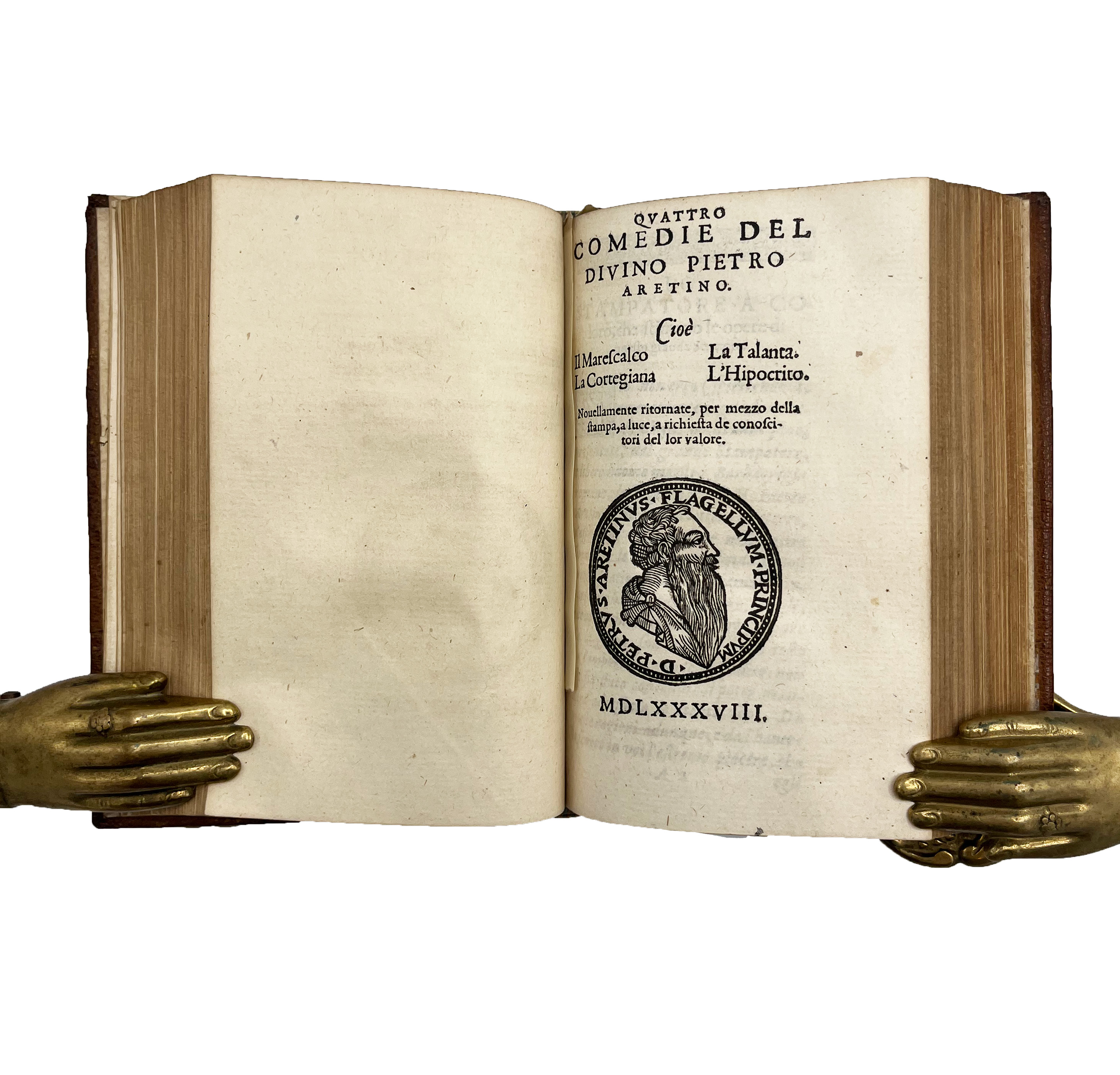 La terza, et vltima parte de Ragionamenti del diuino Pietro Aretino [with] (2) Quattro comedie del diuino Pietro Aretino. Cioè Il Marescalco La cortegiana La Talanta, L’hipocrito.