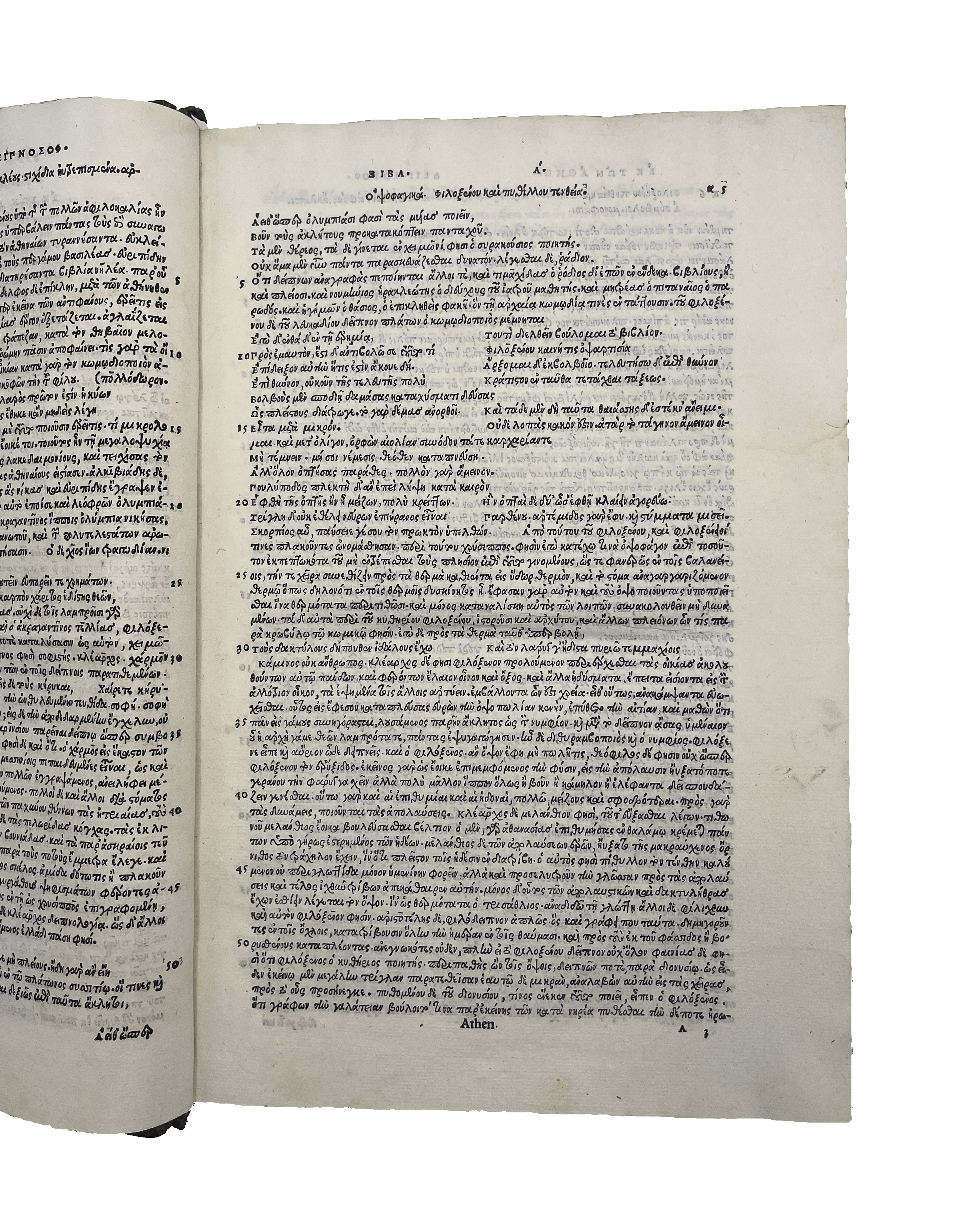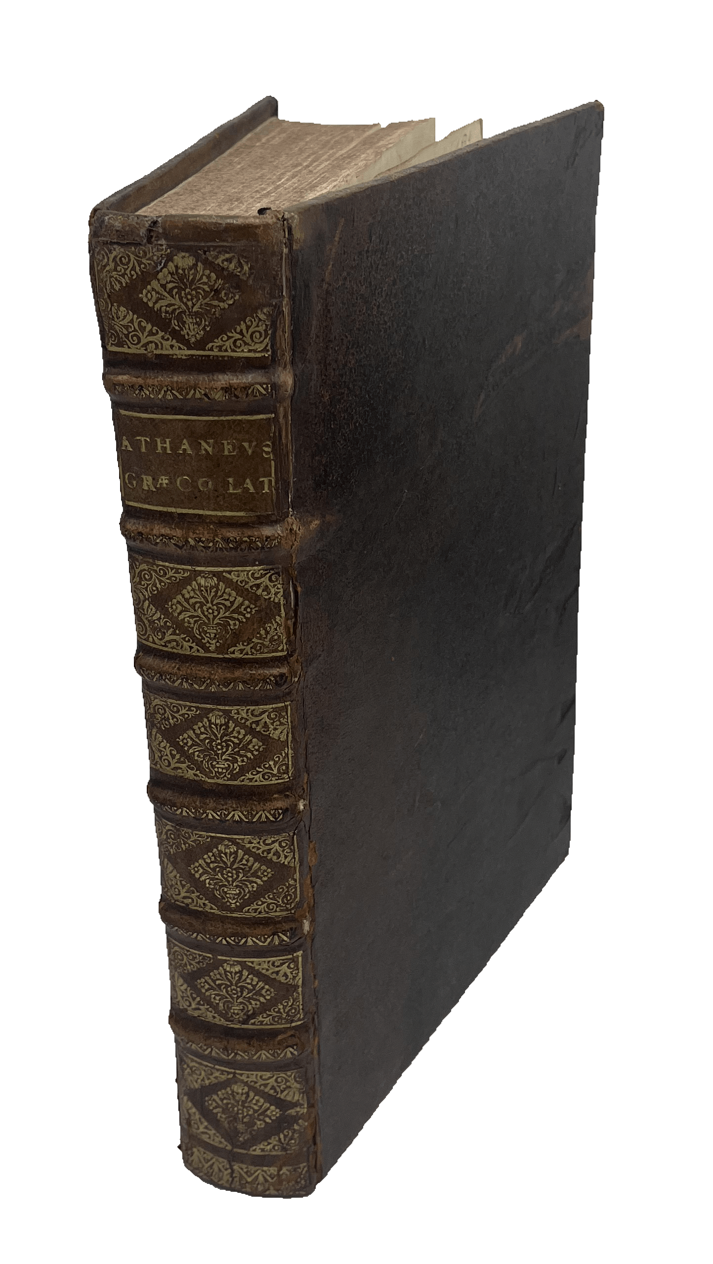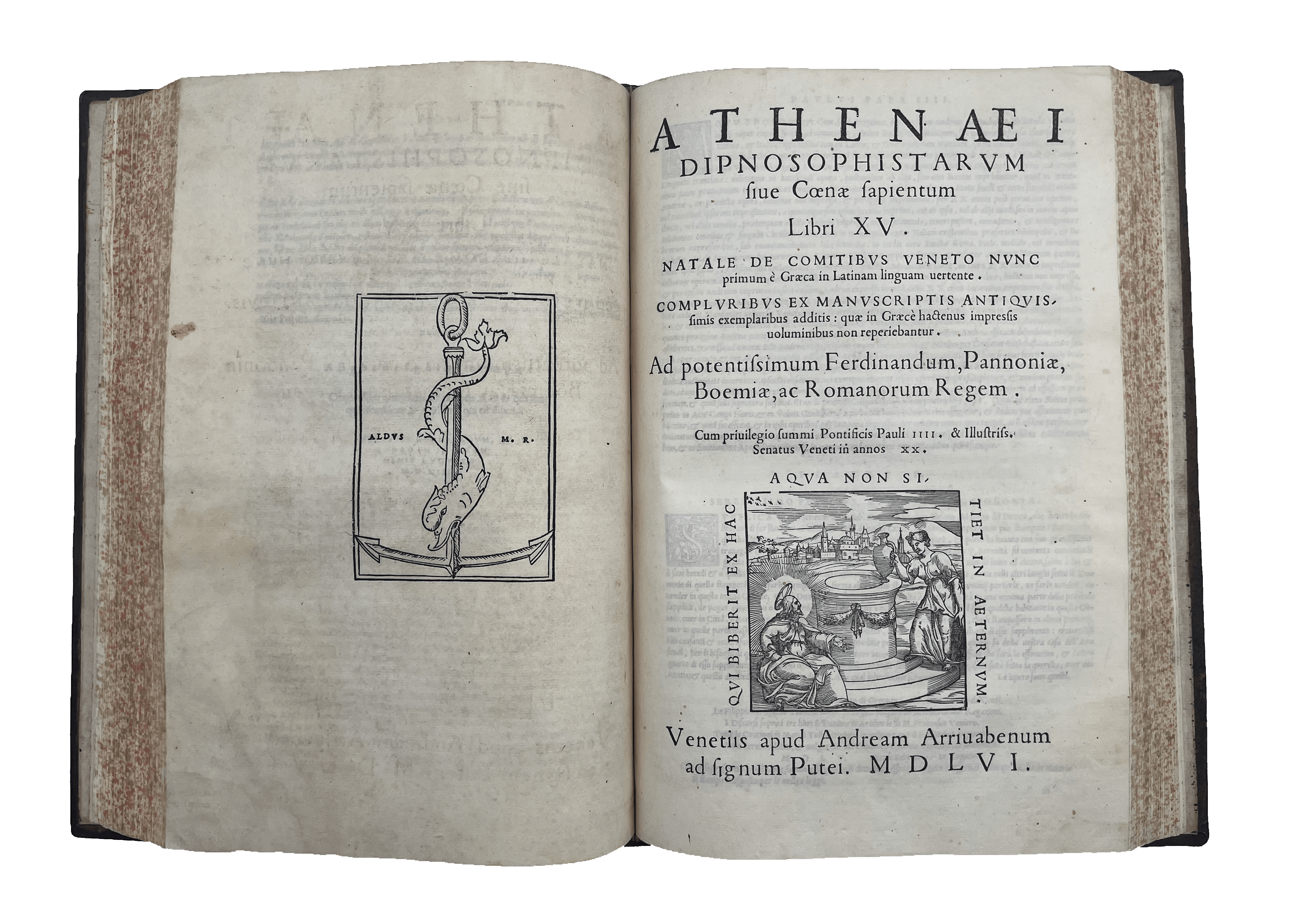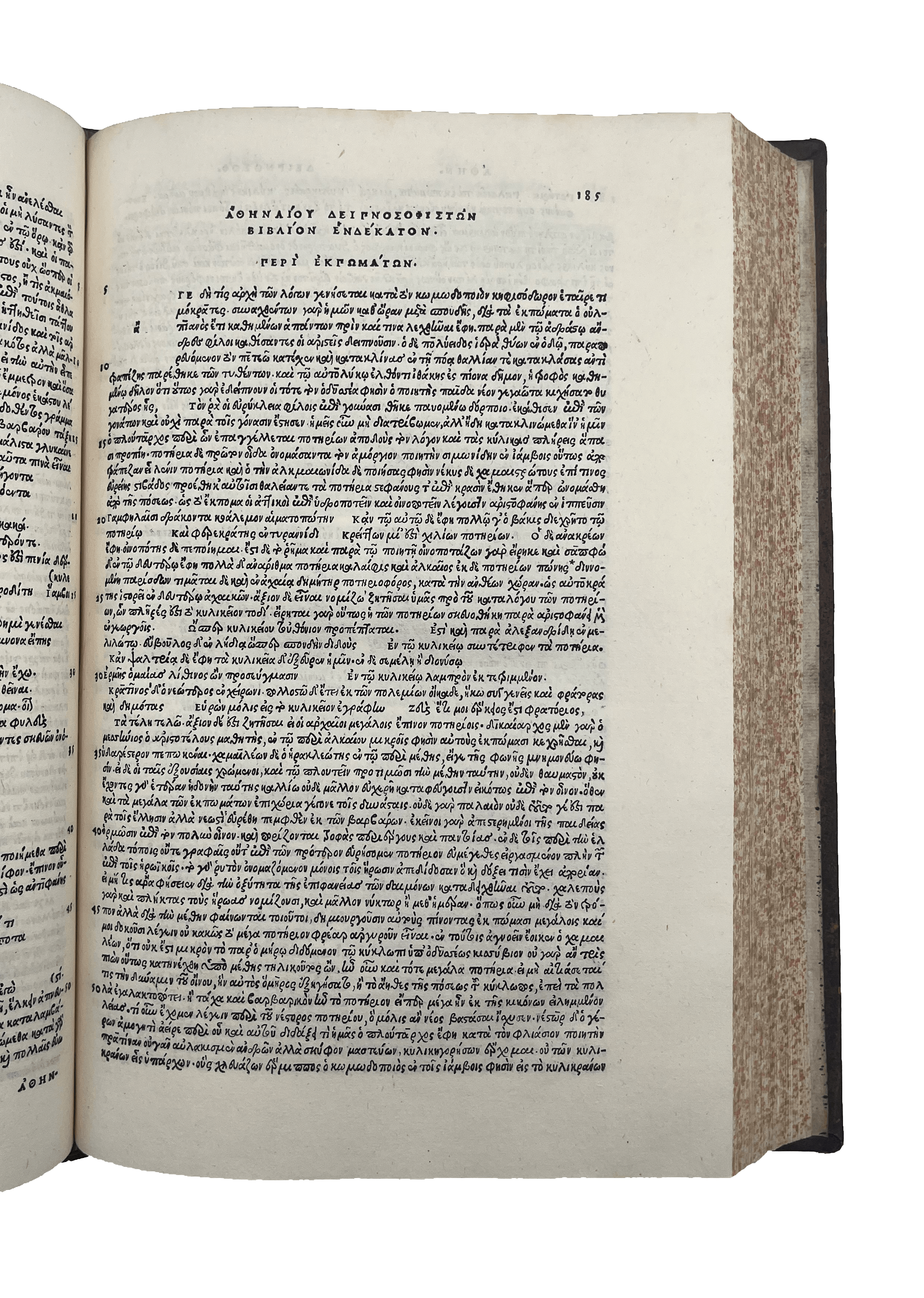 Probably the only copy combining the Editio Princeps with the first Latin edition. Written in Rome in the early 2nd century, the work provides a unique insight into the moneyed classes during the Hellenistic literary world of the Roman Empire. “A vast variety of erudition has been preserved by Athenaeus of Naucratis, who lived at Rome under Commodus and his successors. His comprehensive work ‘Doctors at Dinner’ originally consisted of thirty books. It was abridged into fifteen, and it is this abridgement that has survived in an incomplete form in a single ms. The scene is laid at the house of the Roman pontiff Larentius, and all kinds of accomplishments – grammar, poetry, rhetoric, music, philosophy and medicine – are represented among the many interlocutors. It is an encyclopaedia under the disguise of a dialogue. Food and drink, cups and cookery, stories of famous banquets, scandalous anecdotes, specimens of ancient riddles and drinking songs and disquisitons on instruments of music are only part of the miscellaneous fare which is here provided. We are indebted to the quotations in Athenaeus for our knowledge of passages from about 700 ancient writers who would otherwise be unknown to us, and, in particular, for the preservation of the greater part of the extant remains of the Middle and the New Attic comedy.” Sandys I:337. An important source of Classical Greek recipes, including the original text of the oldest recipe by a named author, Mithaecus, in any language, it also describes in detail different kinds of wine, categorizing them by place and origin and compares their characteristics, properties and effects. Sexual mores constitute another conversational focus, with pederasty discussed without restraint, including details of boy-lovers famed for their beauty and skill. In addition come insights into music, literary gossip and philology, as well as the stories behind the creation of many artworks and amusing stories. An invaluable resource for social historians.