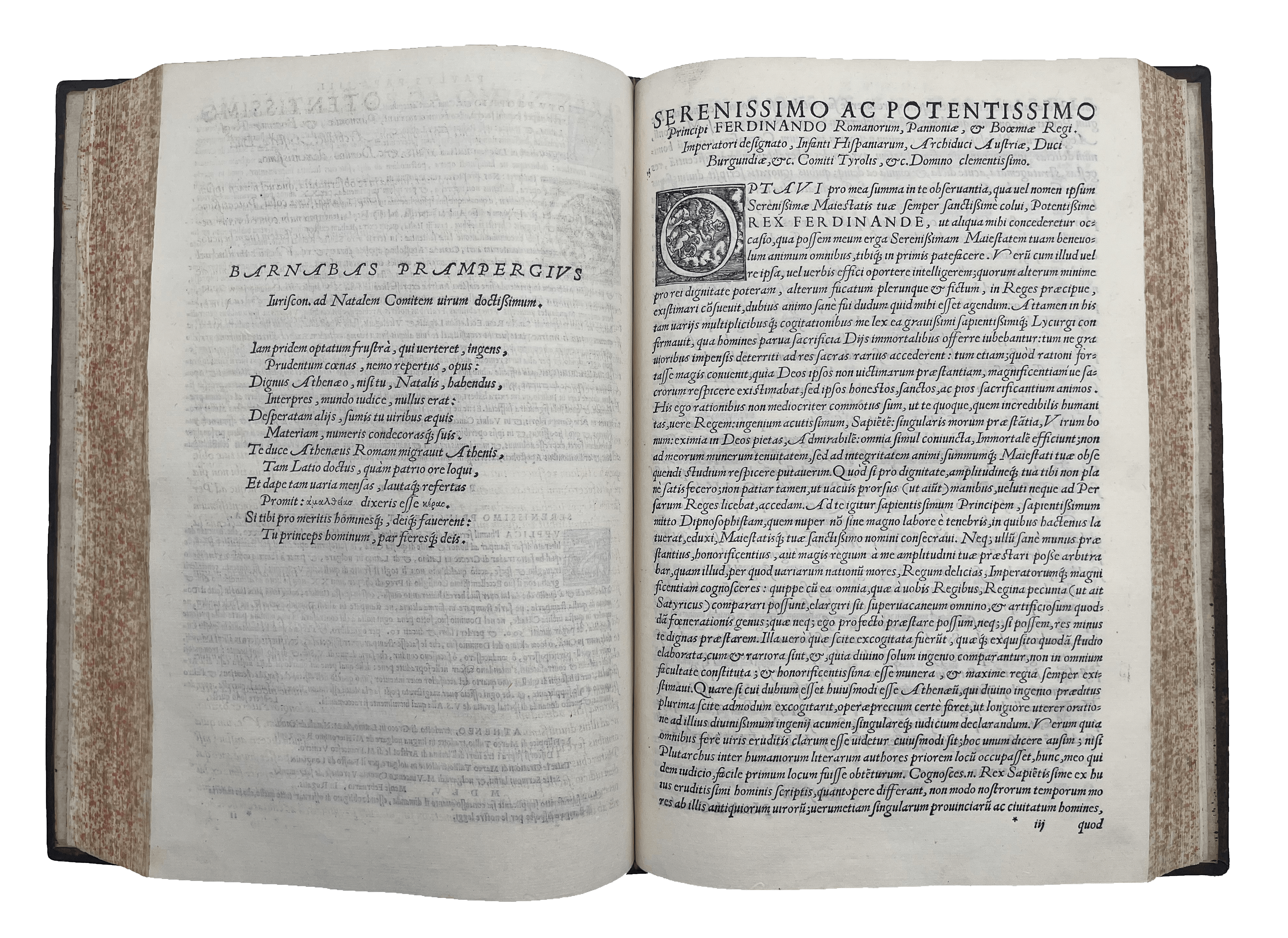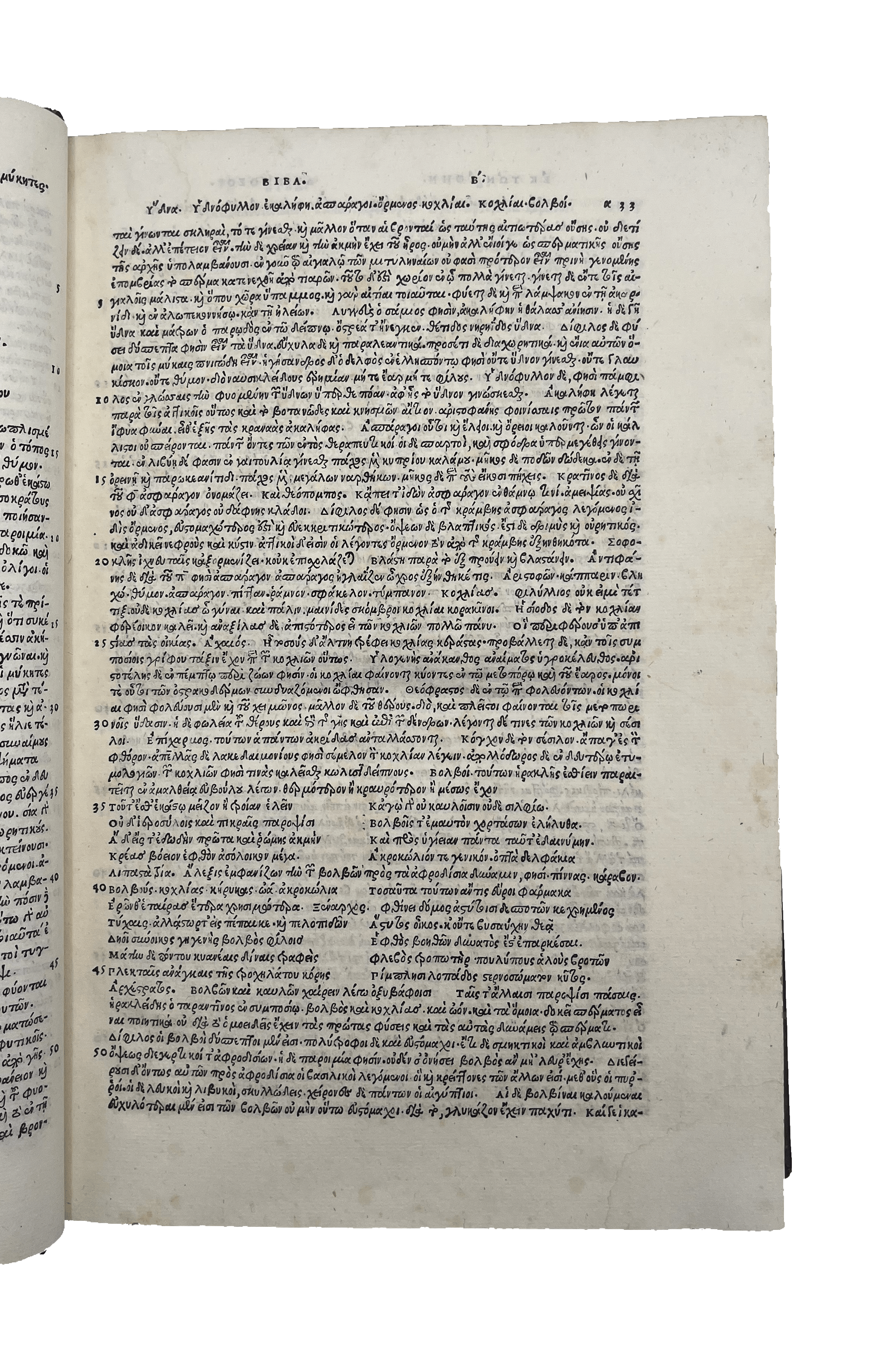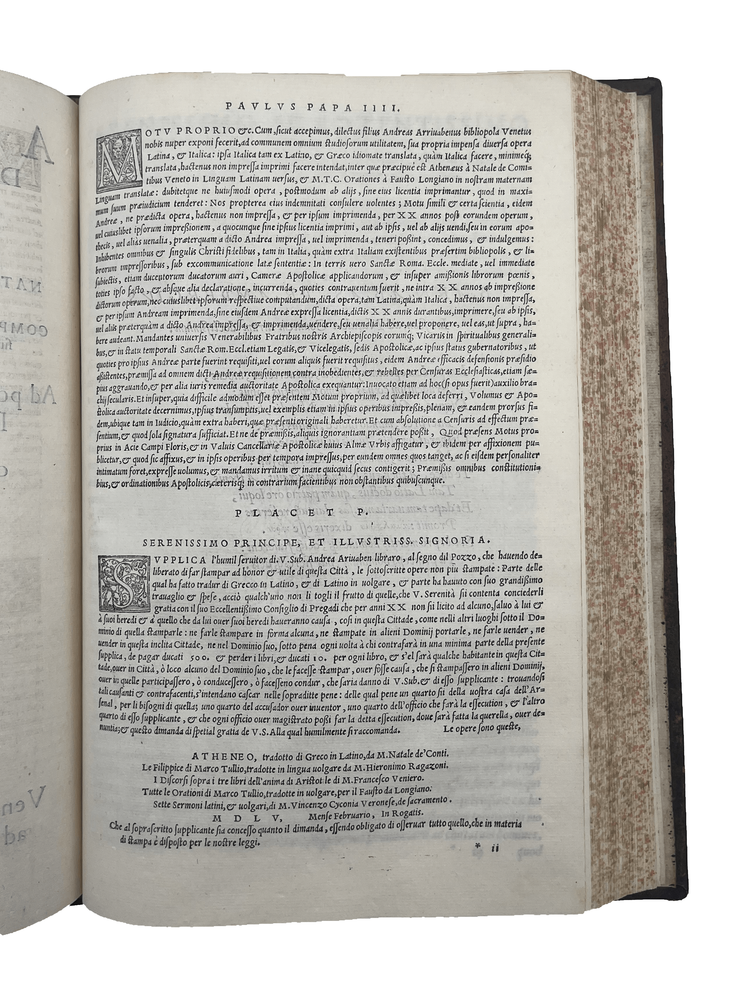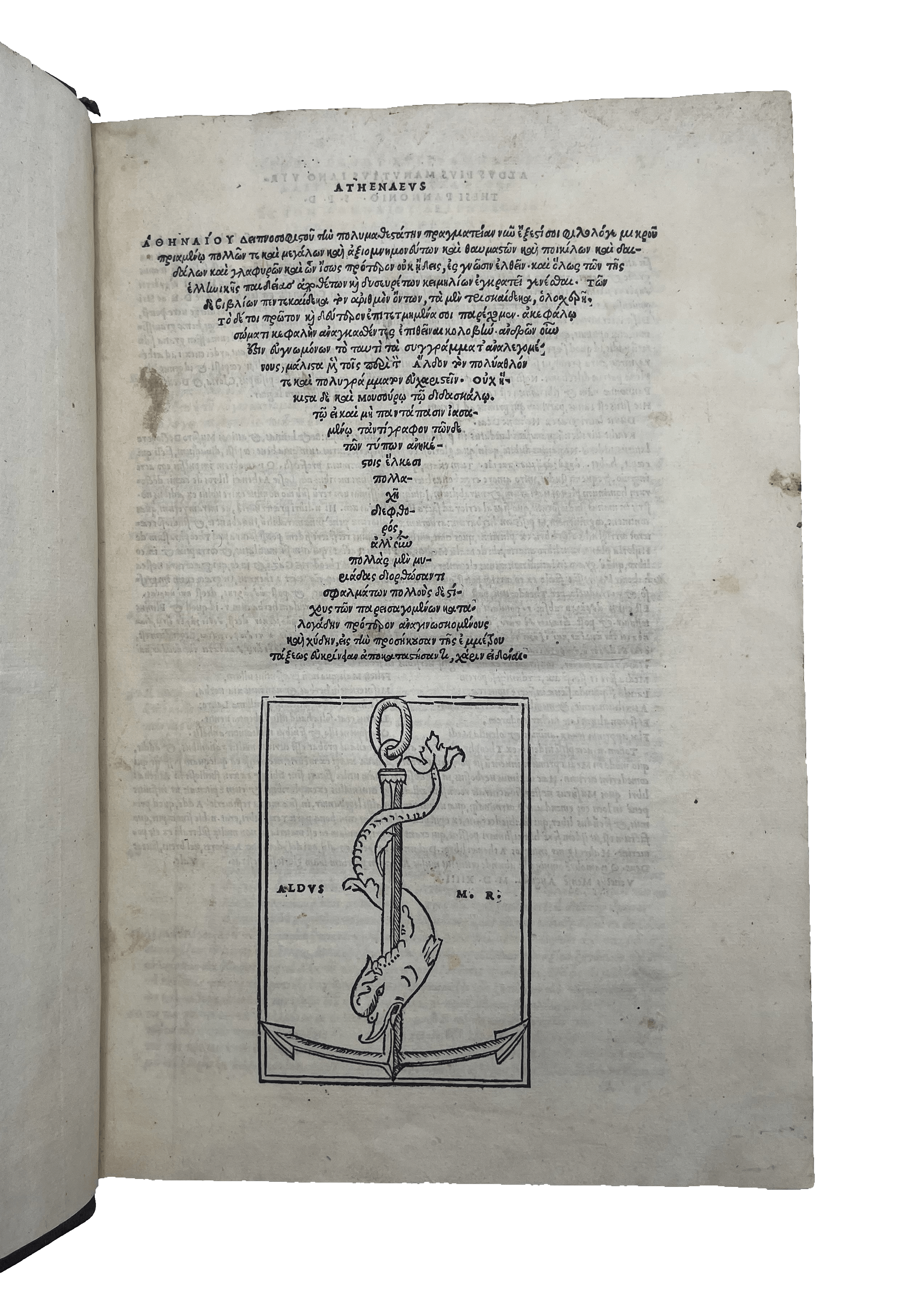 Probably the only copy combining the Editio Princeps with the first Latin edition. Written in Rome in the early 2nd century, the work provides a unique insight into the moneyed classes during the Hellenistic literary world of the Roman Empire. “A vast variety of erudition has been preserved by Athenaeus of Naucratis, who lived at Rome under Commodus and his successors. His comprehensive work ‘Doctors at Dinner’ originally consisted of thirty books. It was abridged into fifteen, and it is this abridgement that has survived in an incomplete form in a single ms. The scene is laid at the house of the Roman pontiff Larentius, and all kinds of accomplishments – grammar, poetry, rhetoric, music, philosophy and medicine – are represented among the many interlocutors. It is an encyclopaedia under the disguise of a dialogue. Food and drink, cups and cookery, stories of famous banquets, scandalous anecdotes, specimens of ancient riddles and drinking songs and disquisitons on instruments of music are only part of the miscellaneous fare which is here provided. We are indebted to the quotations in Athenaeus for our knowledge of passages from about 700 ancient writers who would otherwise be unknown to us, and, in particular, for the preservation of the greater part of the extant remains of the Middle and the New Attic comedy.” Sandys I:337. An important source of Classical Greek recipes, including the original text of the oldest recipe by a named author, Mithaecus, in any language, it also describes in detail different kinds of wine, categorizing them by place and origin and compares their characteristics, properties and effects. Sexual mores constitute another conversational focus, with pederasty discussed without restraint, including details of boy-lovers famed for their beauty and skill. In addition come insights into music, literary gossip and philology, as well as the stories behind the creation of many artworks and amusing stories. An invaluable resource for social historians.