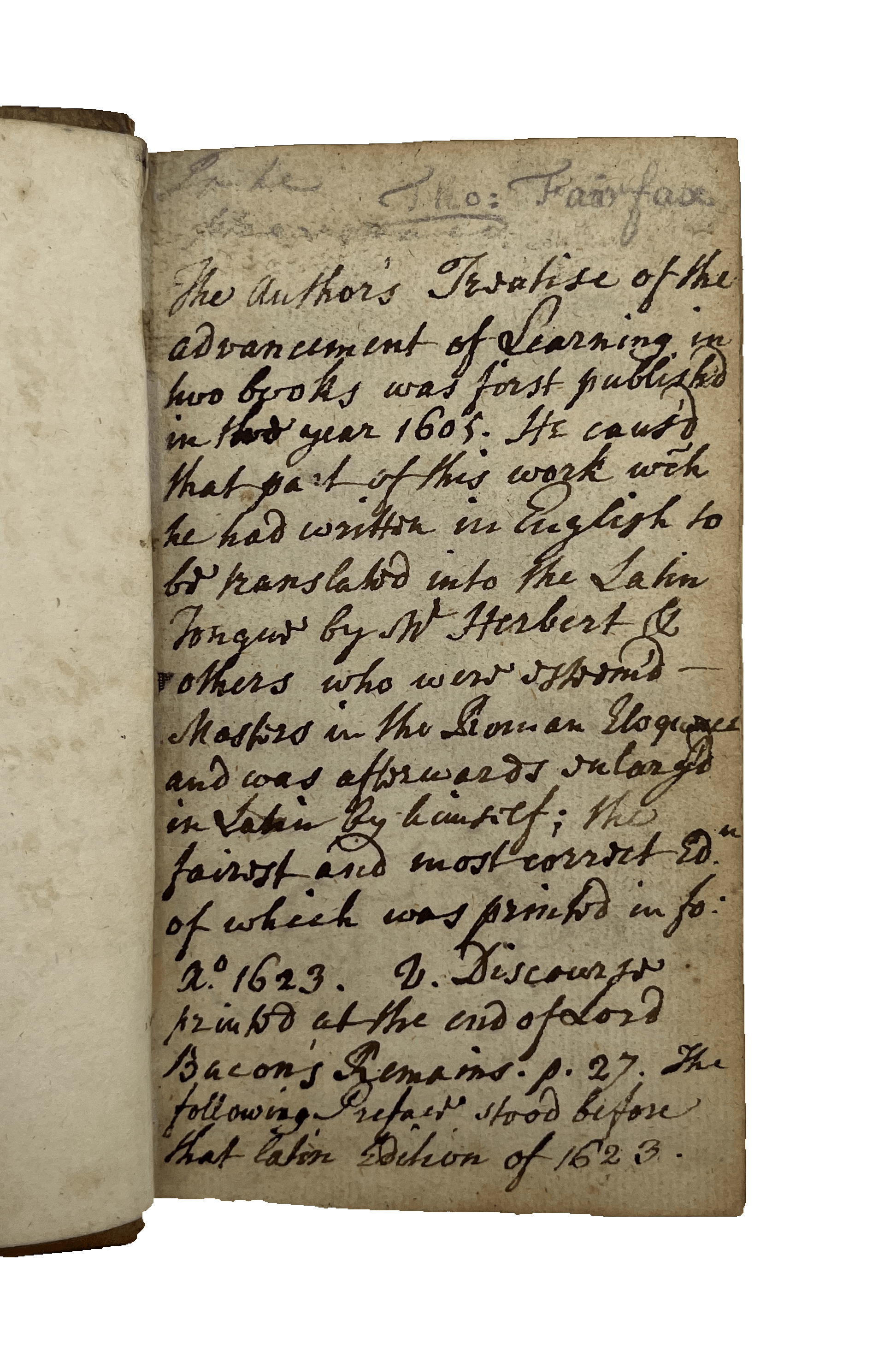 12mo. pp. (x) 684, (lx), lacking final two blanks. Roman and Italic letter, engraved title page depicting Bacon reading a folio volume with a wildly dressed figure holding a volume and representing the Book of Nature. Age yellowing, upper margin of first few gatherings cropped closely but with no loss, contemporary manuscript biographical note added to fly, ascribed to Thomas Fairfax (1693-1781), George Washington’s friend, patron and mentor, whose ex libris appears in pencil above, in C1800 polished calf by J.J. Cowling of Barnet (label on pastedown), with red morocco label on spine, with title and compartments gilt, all edges speckled blue.