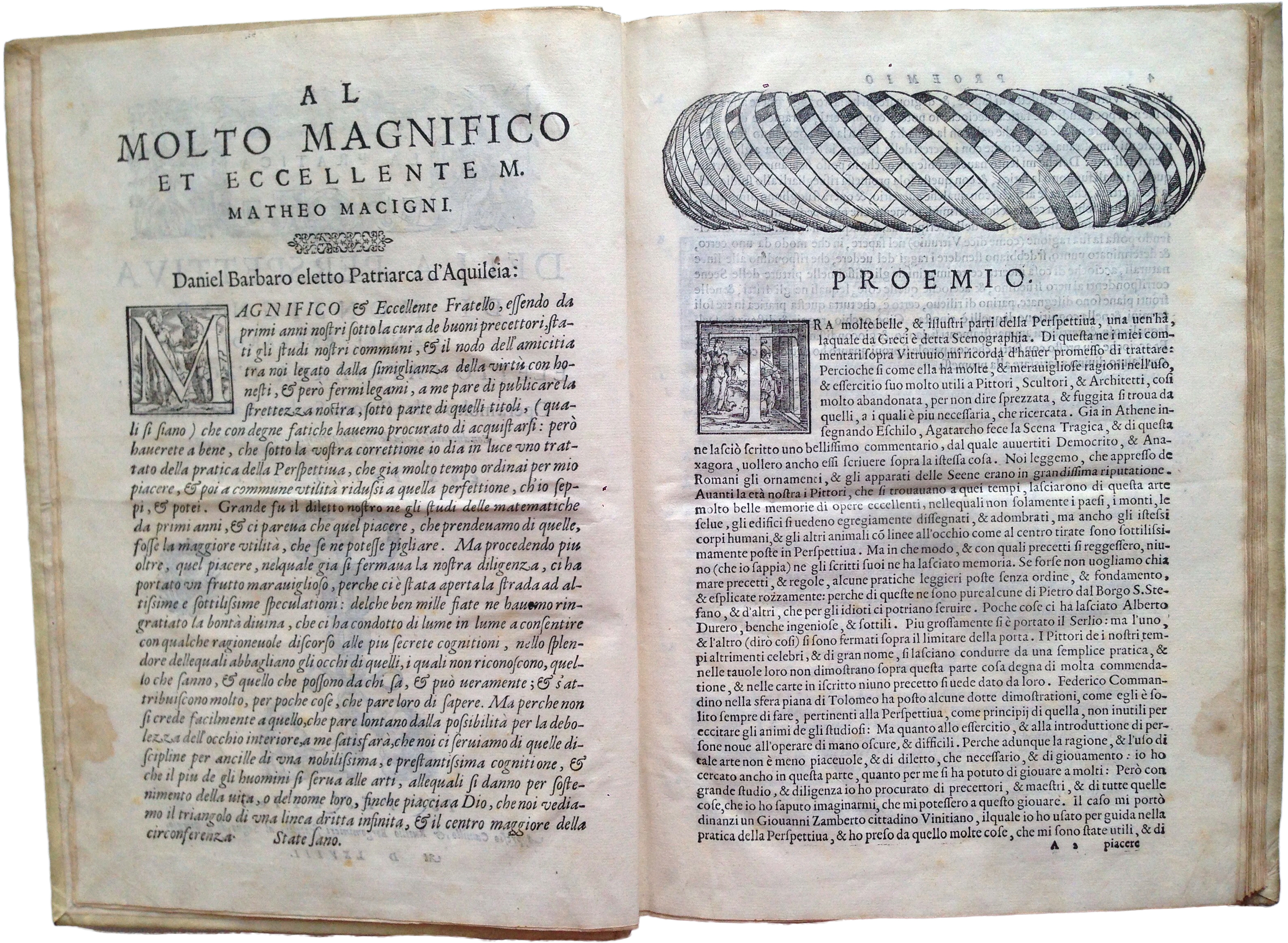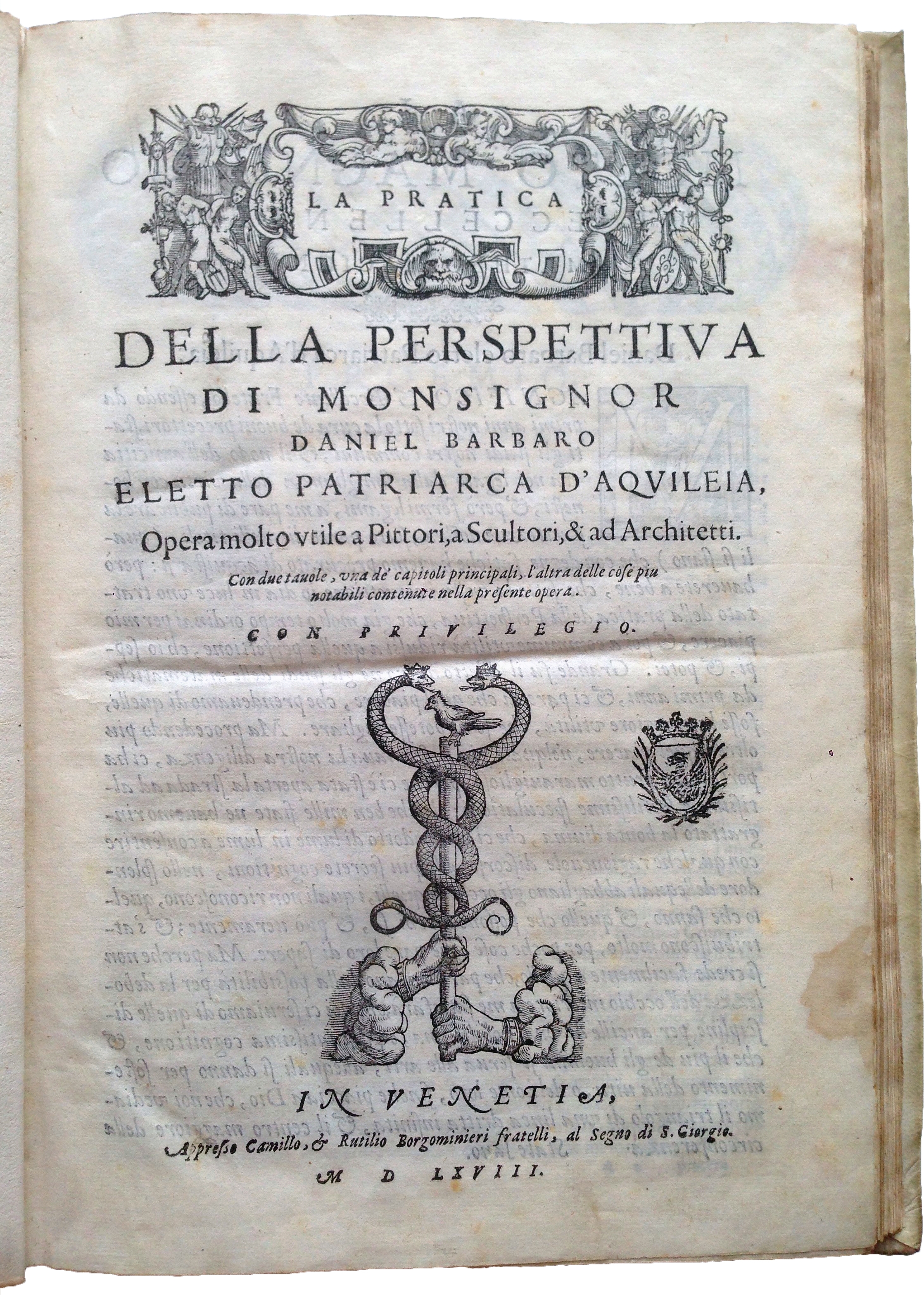 “The treatise on practical perspective by the Venetian humanist Daniele Barbaro was the first work of its type published in Italy. .. In his annotations on Vitruvius’ treatise (1567), Barbaro had already devoted a long passage to the question. … He learned perspective with the mathematician Giovanni Zamberti, the brother of Bartolomeo, the celebrated translator of Euclid. From contact with him, he became initiated into the questions of geometric optics which make up the starting point of his treatise. But he extends the universe of scientific reference considerably for problems of figurative standardization. The questions raised by Ptolemy’s planisphere entered into debates on perspective in the second half of the 16th century, thanks to Federico Commandino’s annotations (1558). … Barbaro’s treatise on perspective is the first text which attempted to bring together in a single book subject matter which until then had been dispersed in works from numerous, sometimes unrelated, disciplines, and of very different status. He expresses remarkable skill in reformulating speculations and giving them a function clearly and briefly. Thus Barbaro’s treatise constitutes the first reduction in the art of perspective, a model which was to be traditional until the 19th century.” Pascal Dubourg-Glatigny. A crisp copy of this important and beautifully illustrated work.