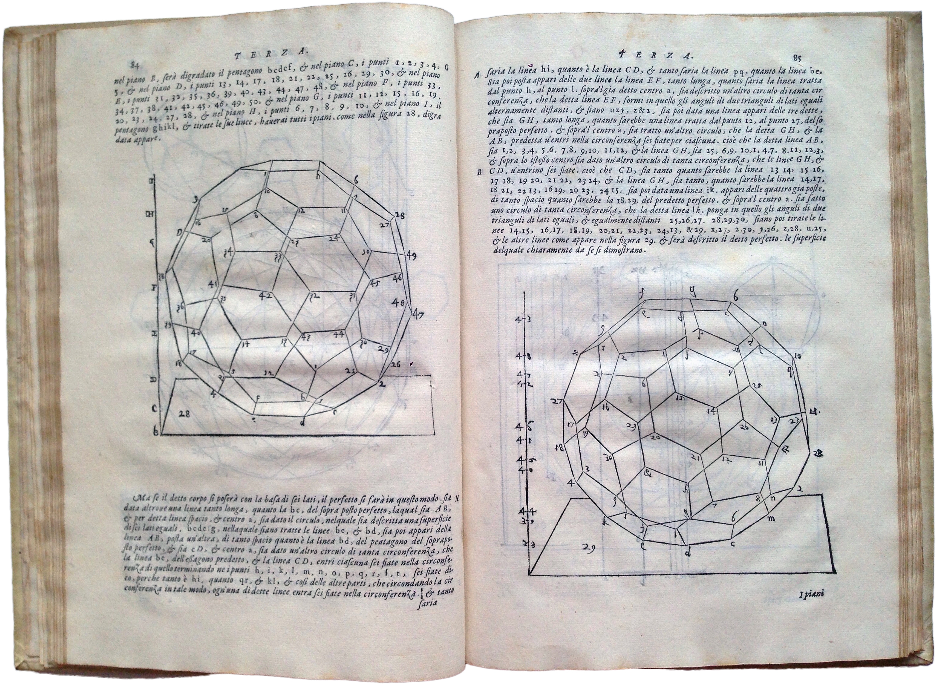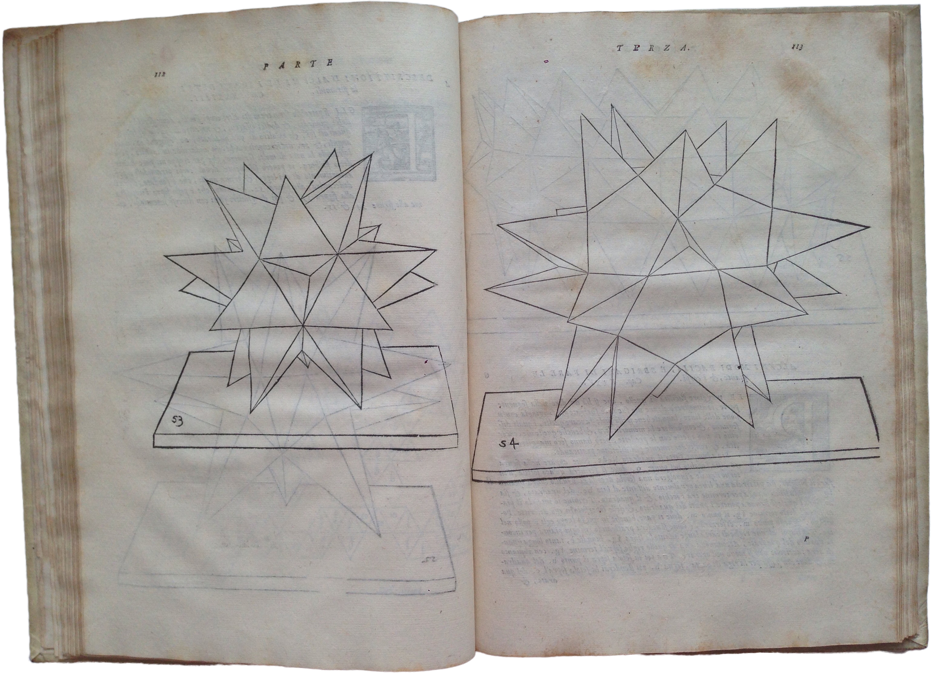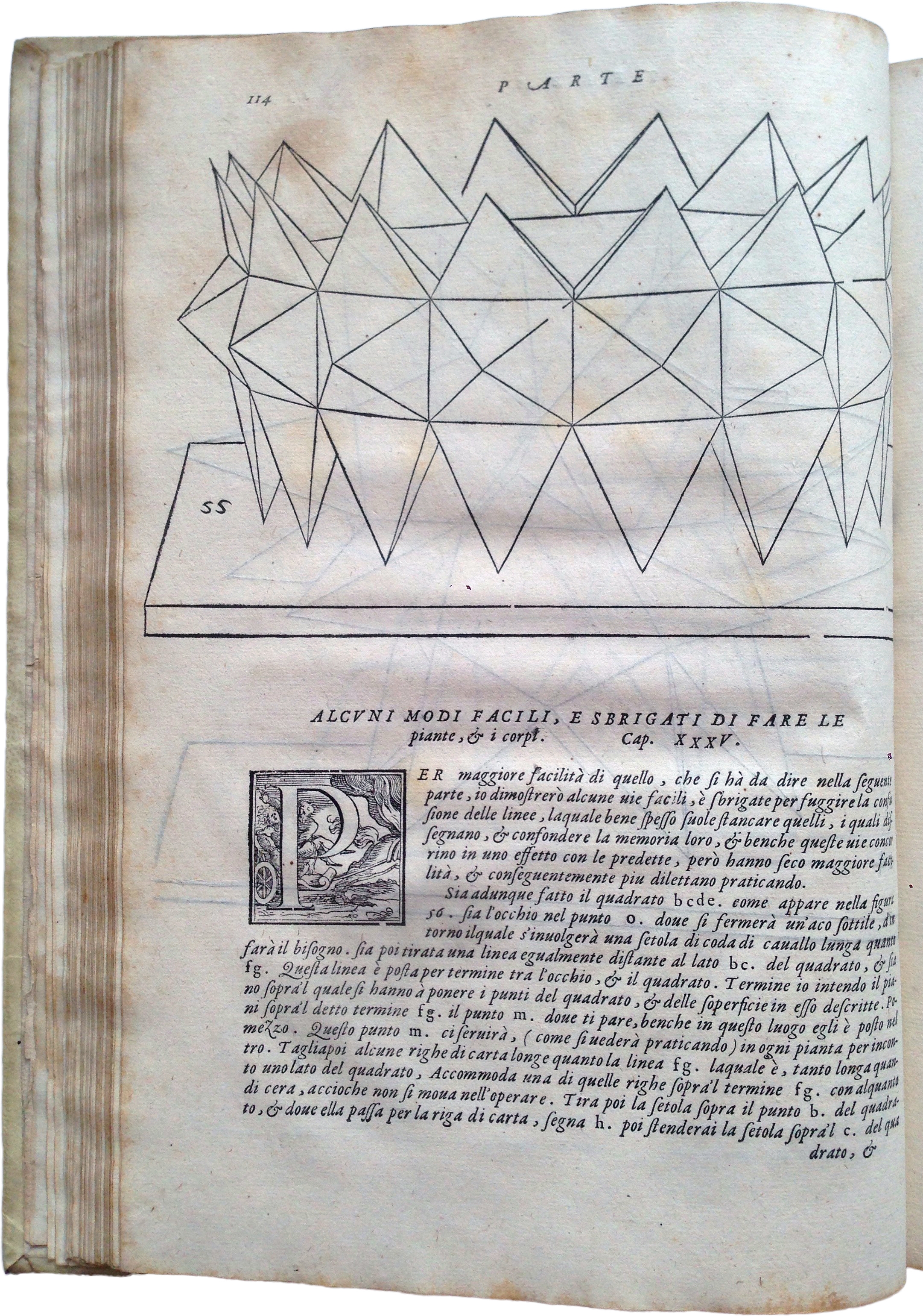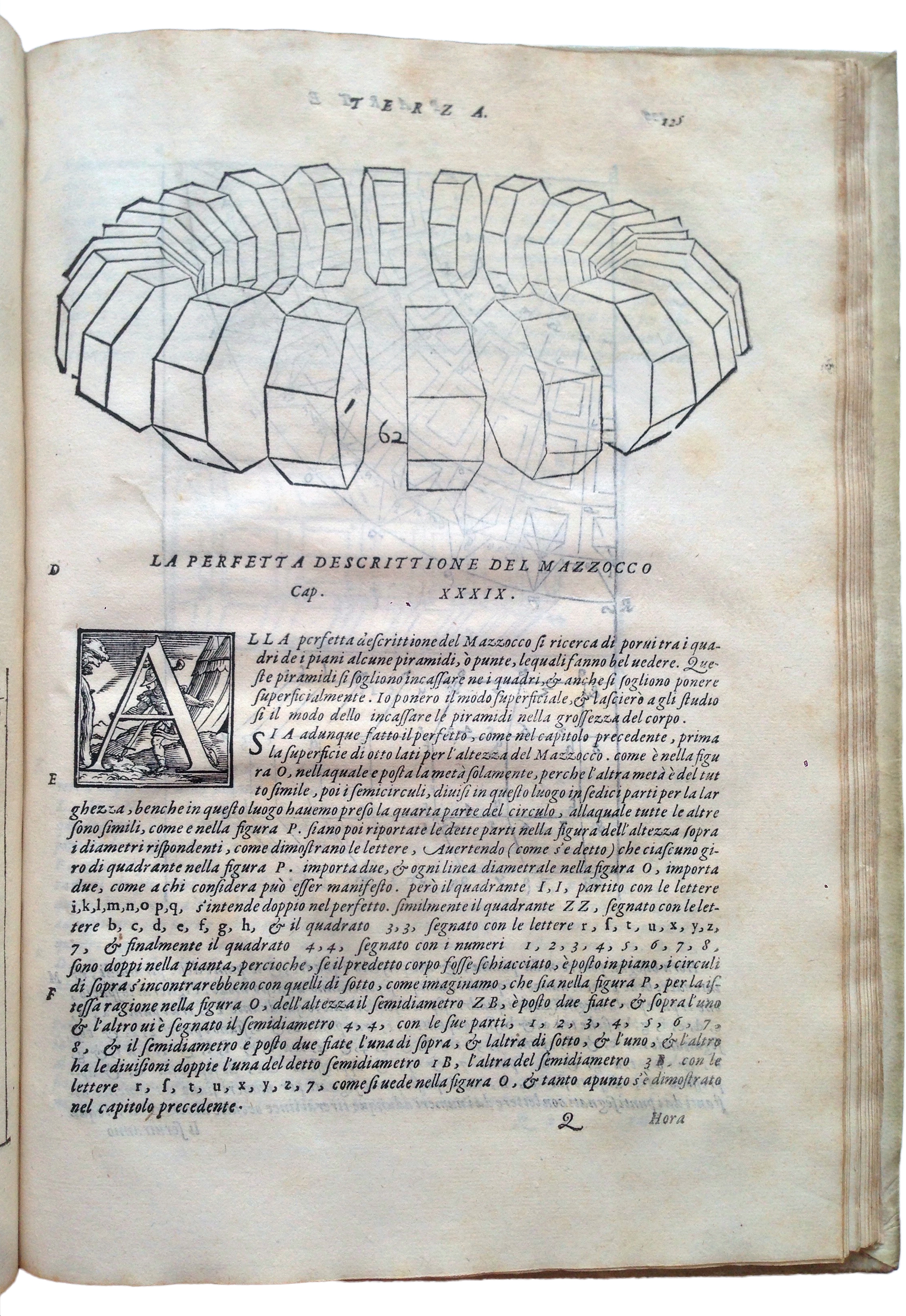 Rare first edition, first issue ,of Barbaro’s important treatise on perspective; it can also be composed of titles and colophons dated 1568 and 1569 in any combination, another variant has an elaborate woodcut title with no date. The Venetian Daniel Barbaro (1514-1570) advocated the use of the camera obscura as an aid to drawing and perspective, and this work contains one of the earliest descriptions of the use of a biconvex lens to assist artists in the representation of scenes from nature, bringing the device one step closer to the modern-day camera. The improvement in the image obtained with the device, as well as by adjusting the distance upon which the image is to be projected, was described by Barbaro. This work was one of the most respected texts on perspective in the sixteenth century, comparable to Durer’s Manual. Designed for an audience of artists, architects, stage designers, etc., Barbaro’s work is more mathematical than artistic. Its influence derived from the separation of perspective, used in the design of stage sets, from the graphic representation of buildings. It is partly based on the methods and writings of Piero della Francesca, but written in a more readable and humanistic style. The work is illustrated in part with a range of polyhedra, and it includes the earliest drawing of the truncated icosidodecahedron and it ties Jamnitzer for the earliest rhombicosidodecahedron. The work opens with a preparatory text on the principles of geometrical optics, the division of surfaces, the properties of triangles and the distinction between point at the level of the eye and the distance point. The sixth part is the account and the reduction of the diagram of Ptolomy’s planisphere.