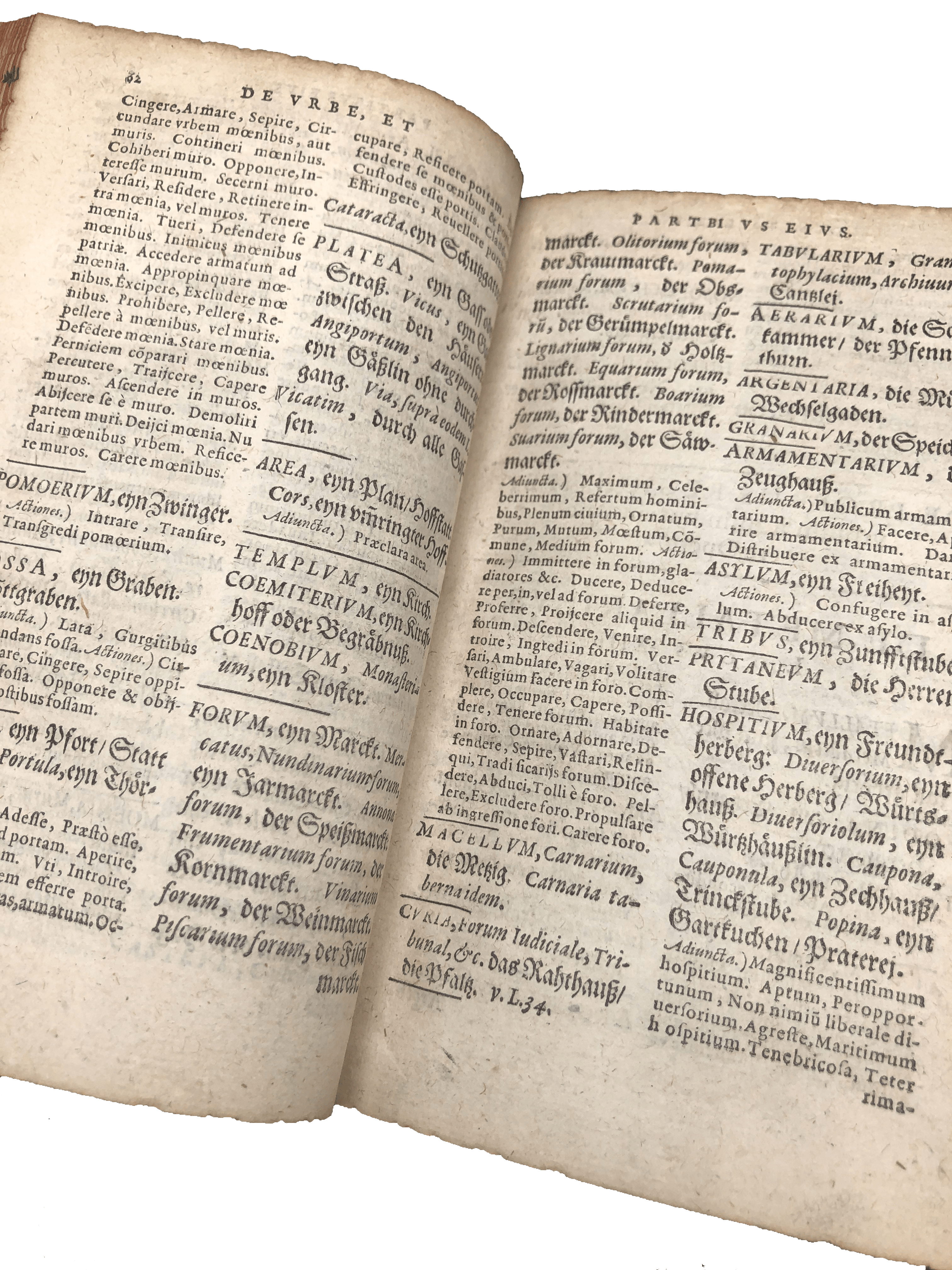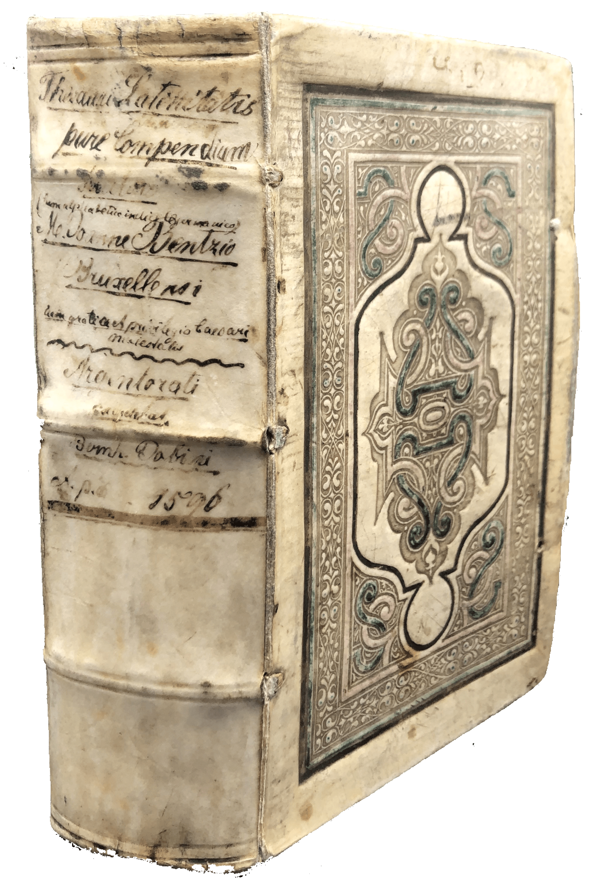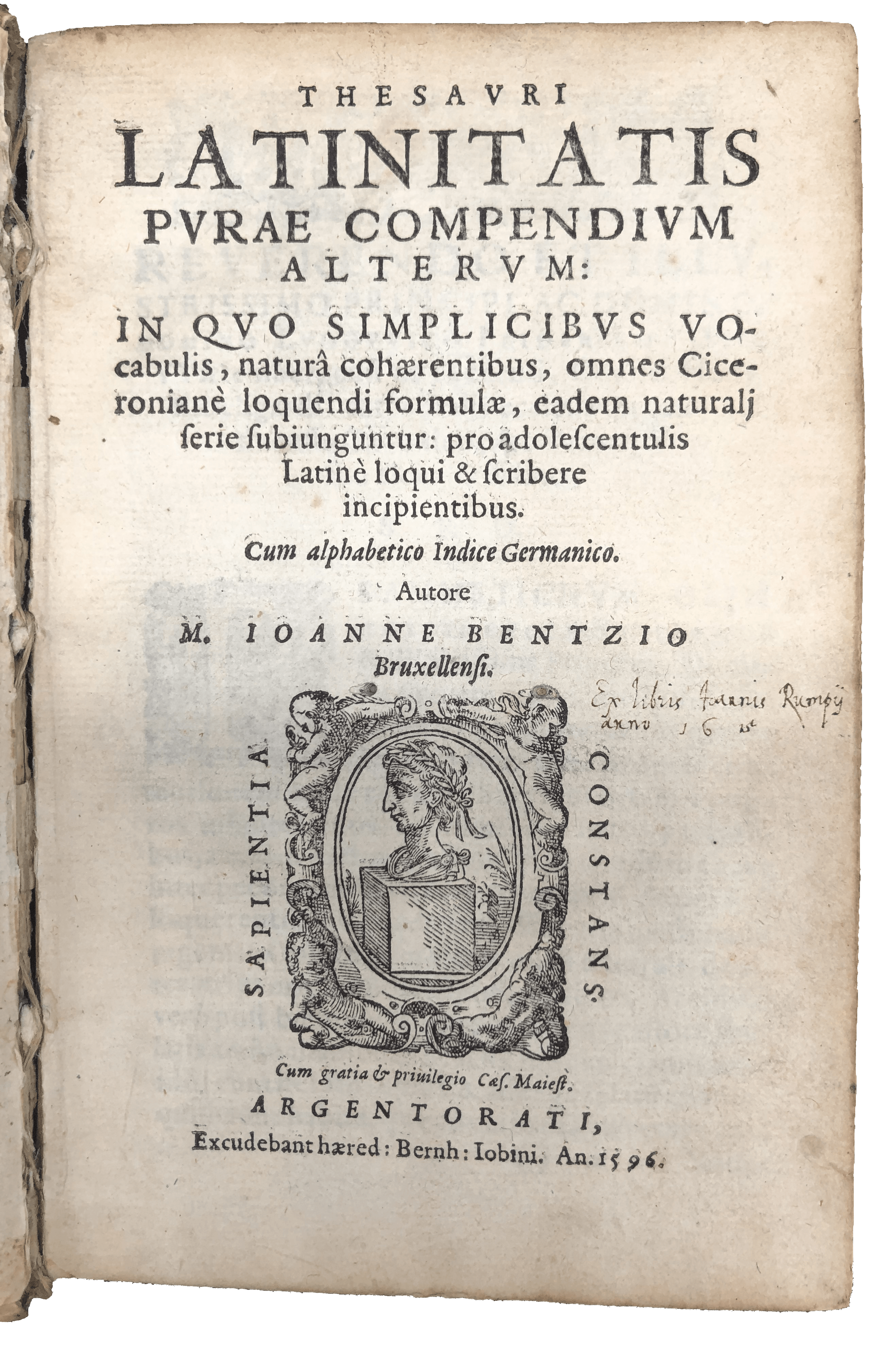 An elaborately bound copy of the second, substantially enlarged edition of this scarce Latin-German lexicon. The lovely contemporary binding of German influence, as shown by the traces of green, black and red paint on the vellum, suggests this was a present. Johann Bentz (fl. late C16-early C17) from Brussels was professor at Strasbourg, and the author of Latin textbooks on rhetoric and grammar. This is the second, much enlarged edition (‘alterum’), published by the same printer in the same year as the first (‘primum’). Like the first, it is divided into subjects (or ‘loci’), e.g., God, the soul, justice, temperance, history, the state, geometry, medicine, astronomy, the graphic crafts and the ‘evil’ arts. Under ‘De graphicis artificiis’ are ‘typographia’, ‘typographus’, ‘excudere’, ‘operae typographicae’, ‘typus’, ‘loculi’ or ‘capsulae’ (the printers’ type drawers), ‘praelum’, ‘sphaera’, ‘atramentum typographicum’ (blank ink), ‘minium’ (red ink), ‘fusor typorum’ (the type founder), ‘bibliopegus’ (bookbinder), and ‘compingere’ (to bind). In most sections, Latin words are listed alphabetically, with a German translation. This second edition was reset in double column, and substantially revised with additional Latin and German synonyms, and long lists of related Latin phrases (either adjectives or verbs), so that the young owner could learn how to write in Latin on specific subjects (traditional and contemporary) using an idiomatic language. A detailed subject and a diagrammatic index were added as preliminaries, and the work concluded with an 83-page dictionary of all the German words mentioned in the work. A scarce work of linguistic and typographical interest.