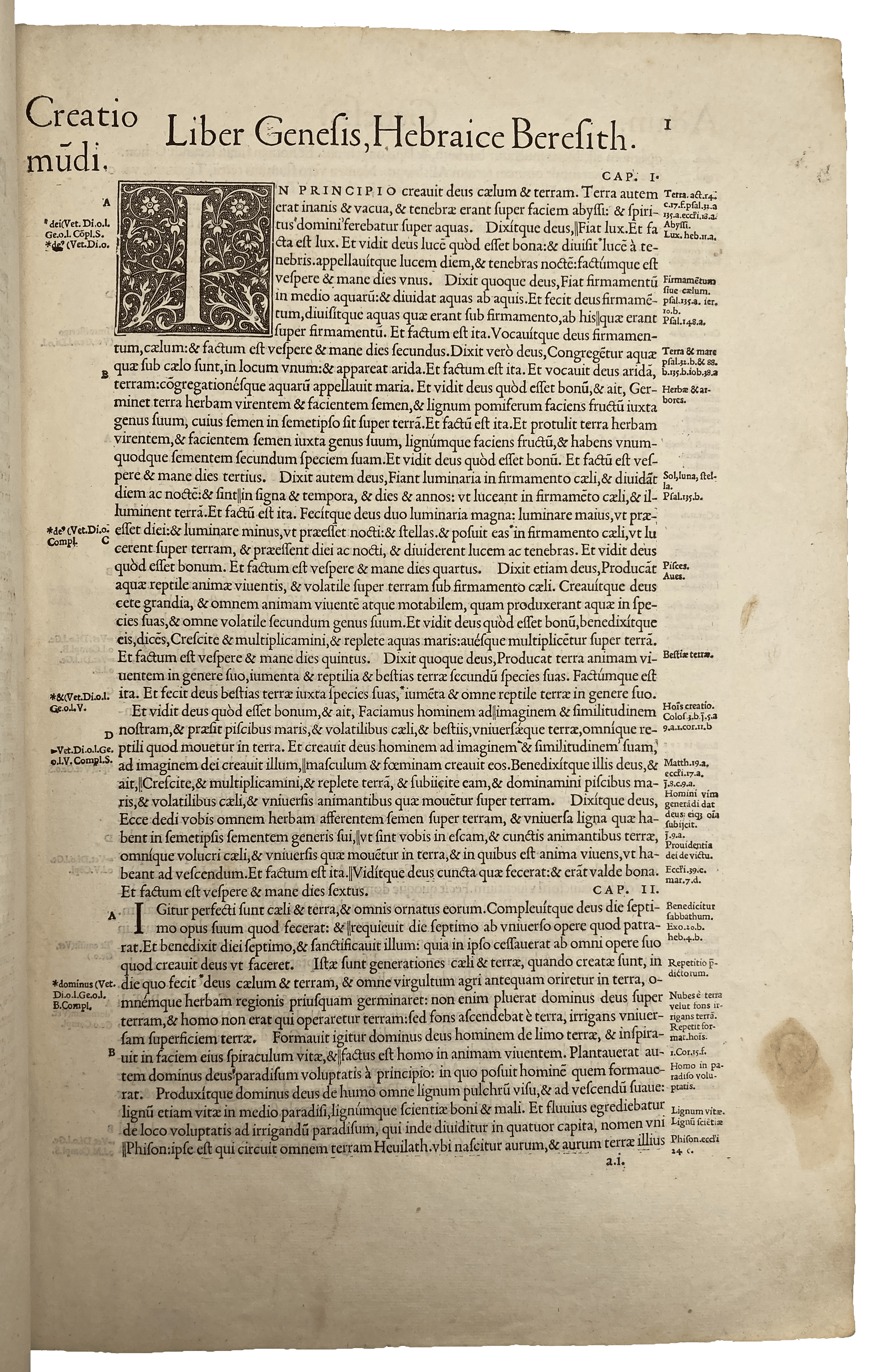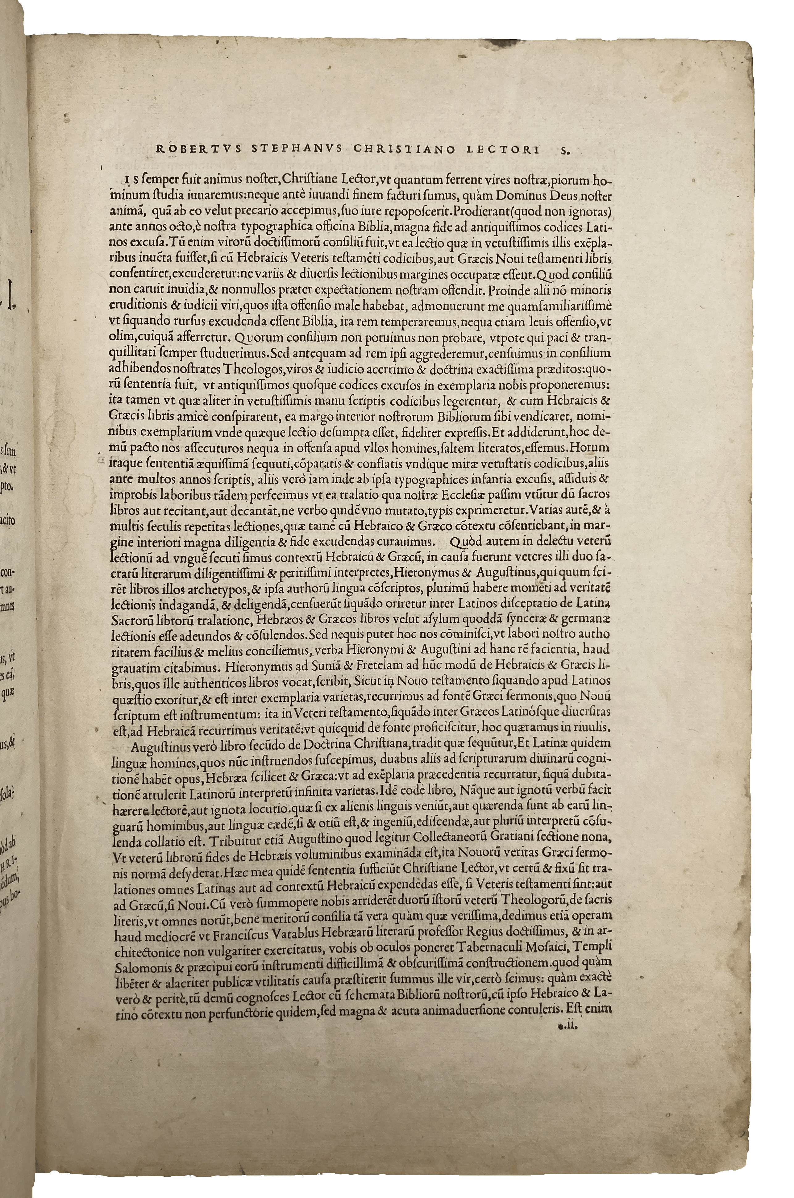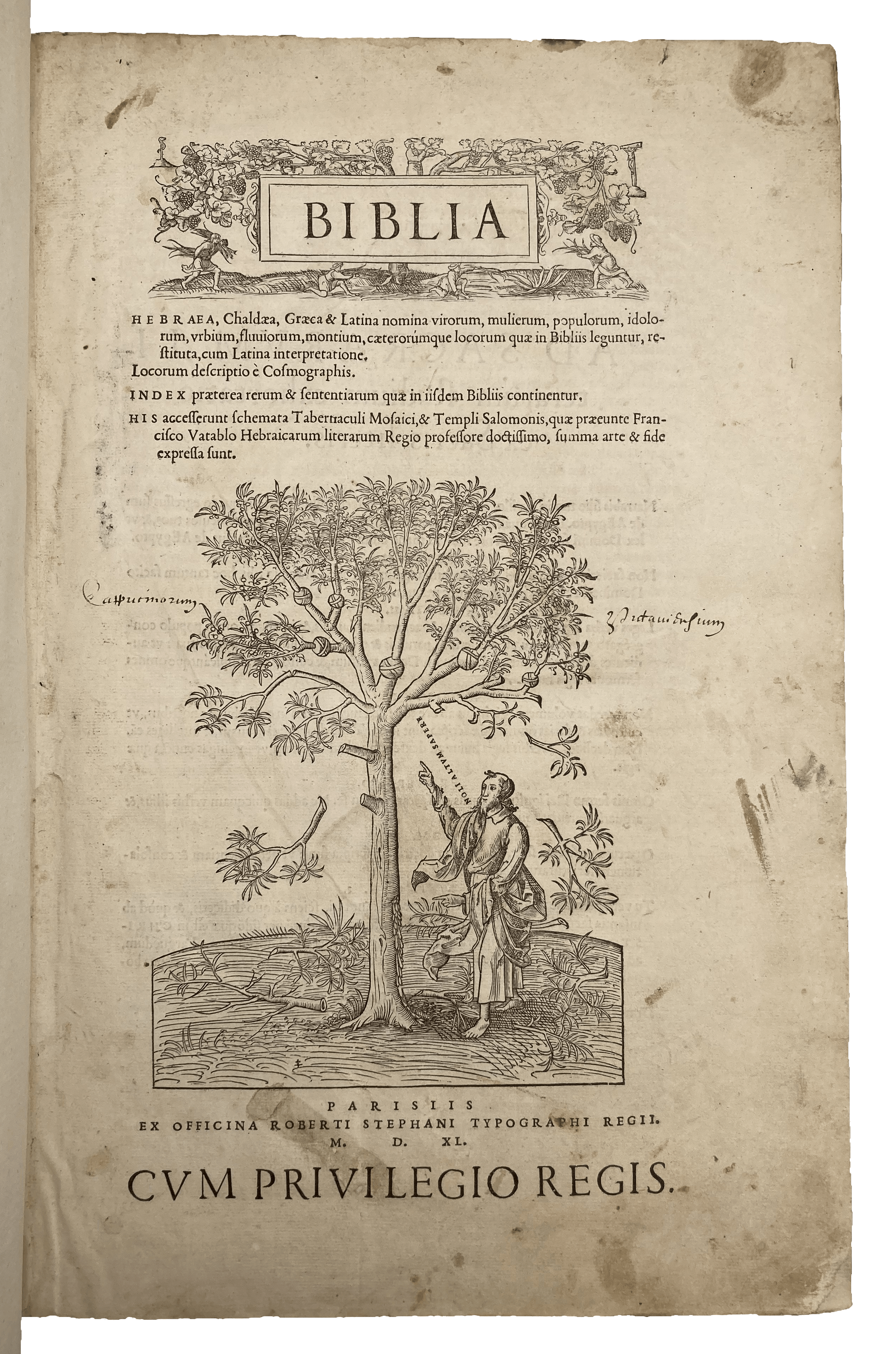 First illustrated edition of Robert Estienne’s (1503-59) Latin Vulgate Bible. Estienne issued his first folio Latin Bible in 1528, also with a polyglot index of names, followed in 1532, but this third is said by Renouard to be far superior (‘très belle edition, bien supérieure’, 48:1). As stated in the preface to the reader, for this edition of the Vulgate Estienne used ancient manuscripts in Parisian libraries (and possibly manuscripts from further afield), early printed editions and Augustine’s commentaries; much of the scholarship, including supervision of the woodcut illustrations, he attributed to the French humanist François Vatable (d. 1547). As Elizabeth Armstrong states: ‘The most serious attempt to investigate the manuscript tradition of the Vulgate was made between [1532] and the completion of the next folio edition in 1540. Returning to the [monastic library] at Saint-Germain, he discovered three ancient manuscripts in addition to the two already familiar to him’ (p. 72).