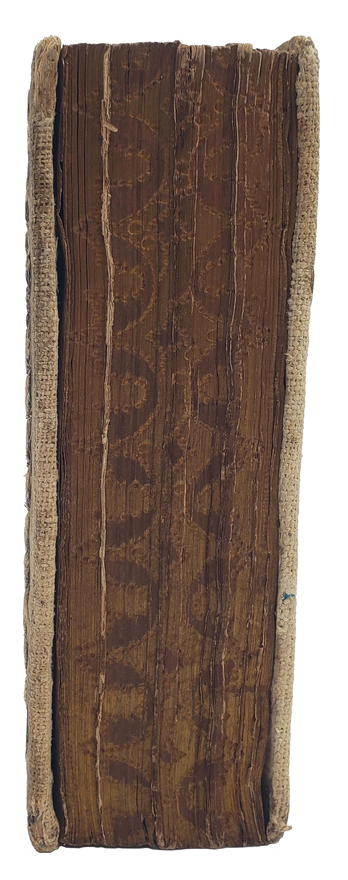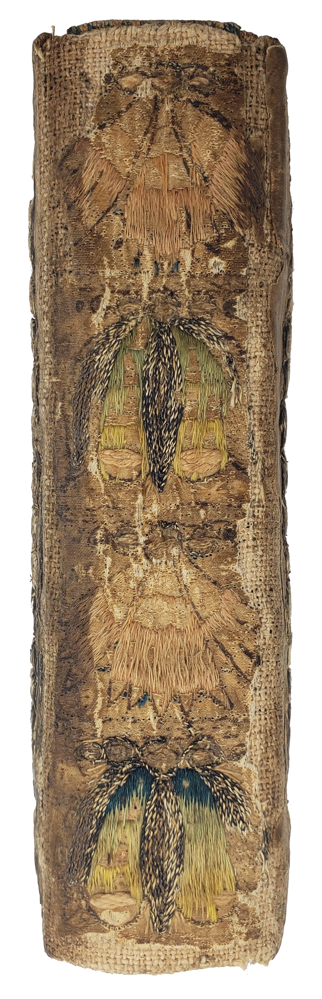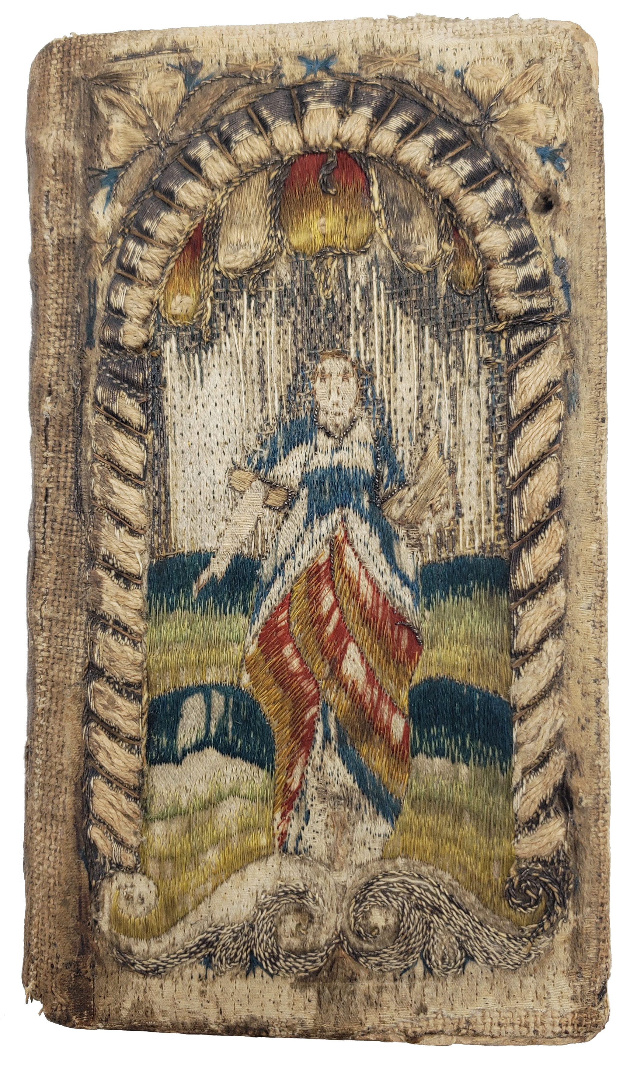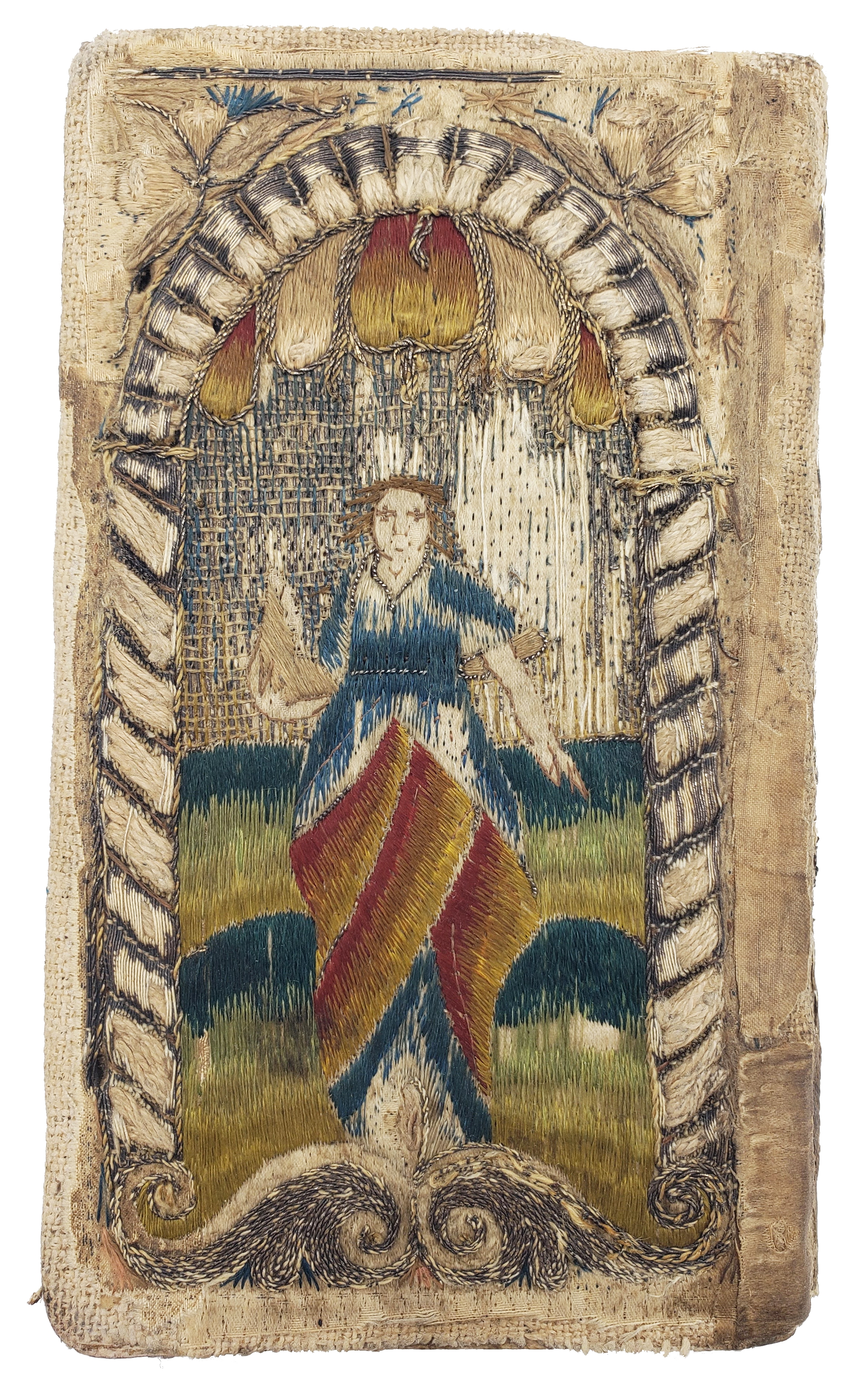 An unusual and attractive C17th embroidered binding with rare depictions of women. The great majority of small format embroidered bindings depict naturalistic scenes, flowers, fruits, birds, insects, as well as geometrical and other patterns. Very, very few of those that survive bear representations of human and other figures. The women depicted here are holding what may be cornucopias, and are likely therefore to be depictions of Plenty, one half of an allegorical duo – the other being Peace, usually shown with a palm branch (see Henry Davis Gift II, 76) – that ‘appear on many of the bindings of this type that were sold ready-bound in the milliners’ shops’ (Howard Nixon and Mirjam Foot, The History of Decorated Bookbinding in England (Oxford, 1992), p. 55).