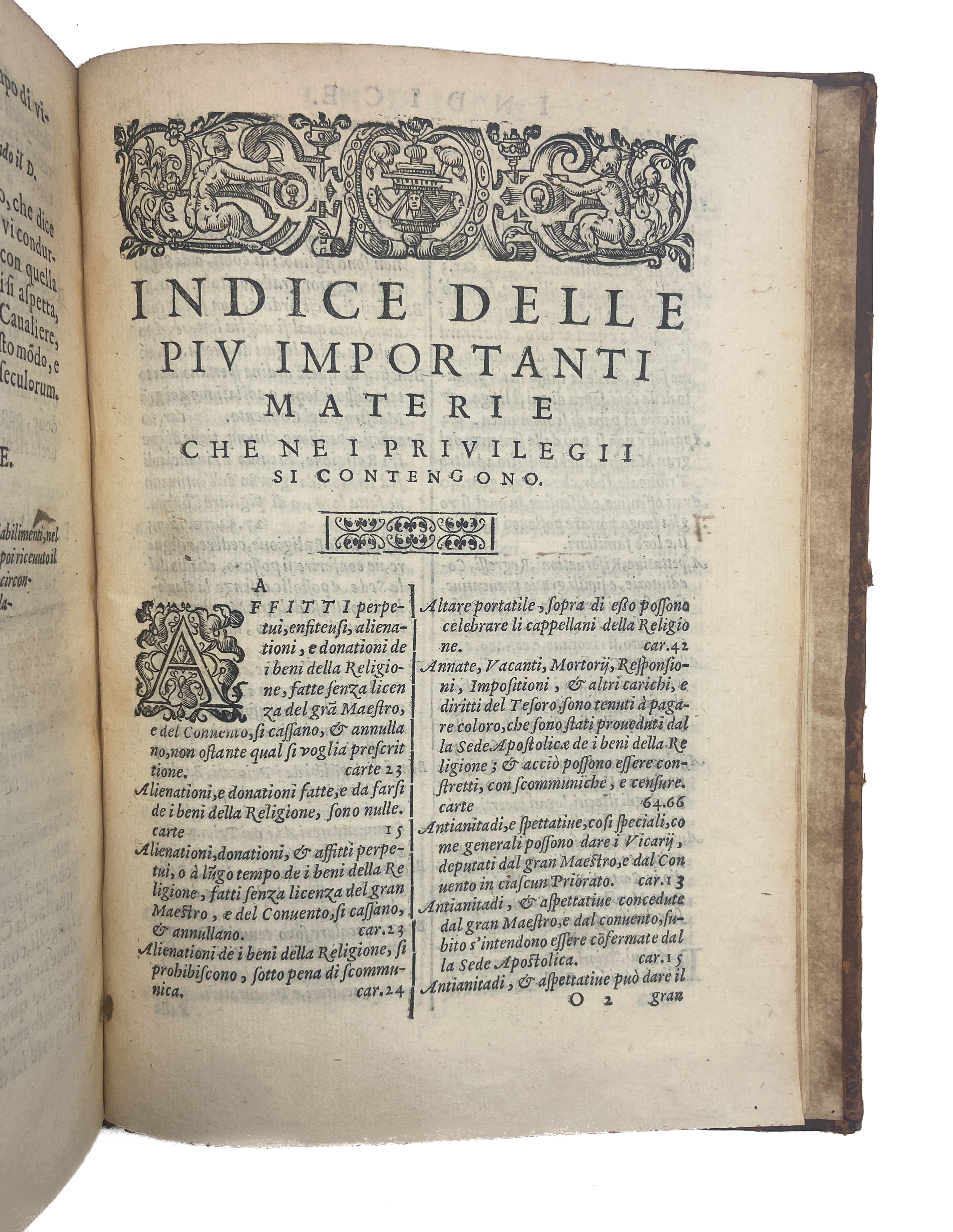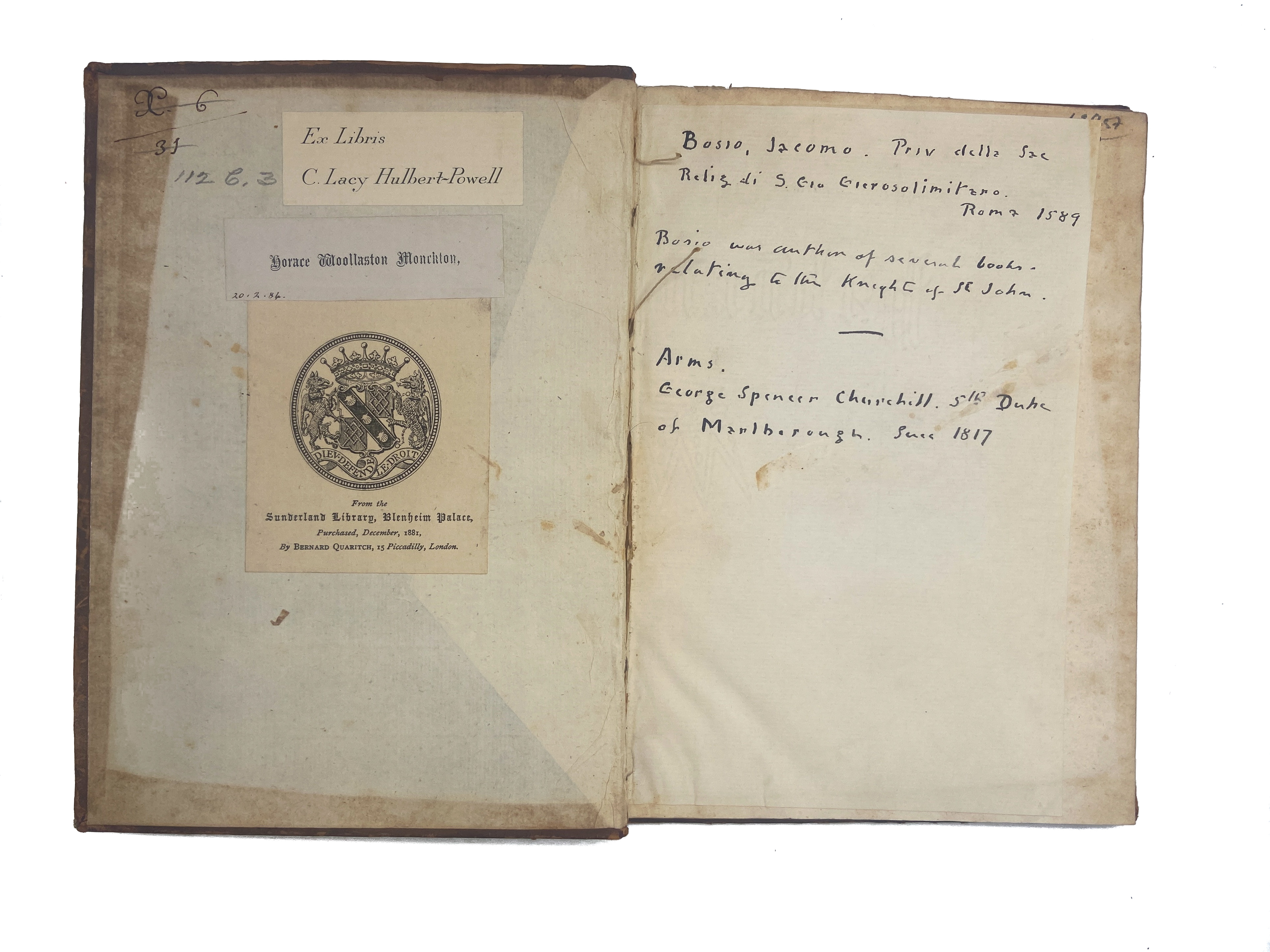 First edition of this important work concerning the privileges and investiture ceremony of the Knights of Malta, written by the first historian of the Order. This copy is from the great Sunderland Library: formed by Charles Spencer, 3rd Earl of Sunderland (1675-1722), this was one of the finest private collections in Europe. The binding bears the arms of Charles’ second son, the 3rd Duke of Marlborough, who inherited the library and moved it to Blenheim Palace in 1749.