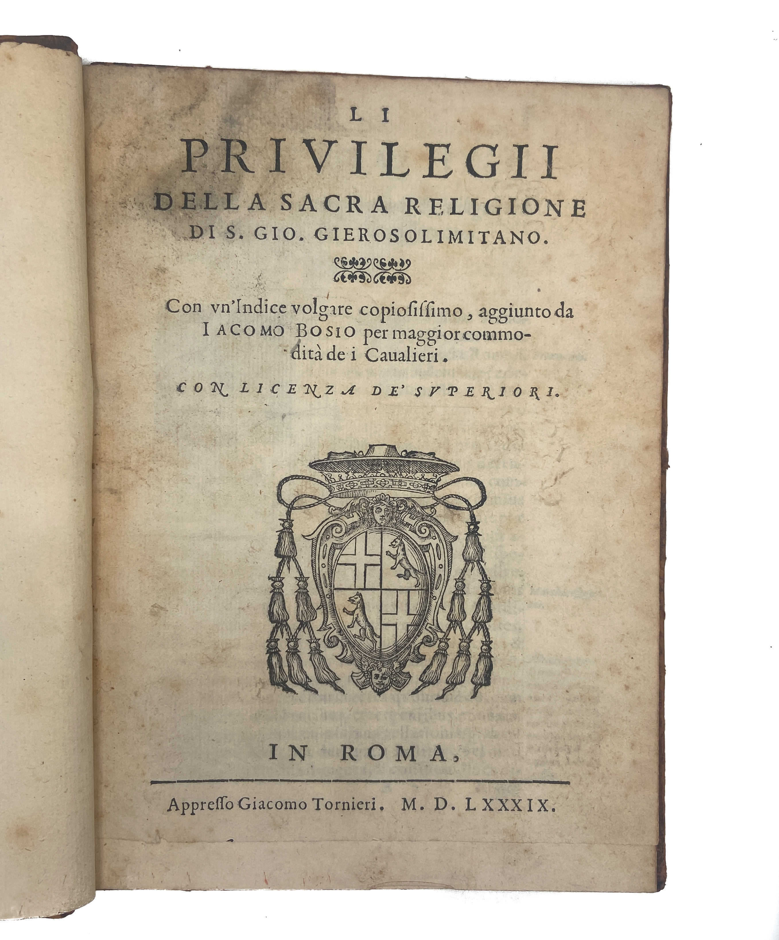 Giacomo Bosio (1544-1627) was born to a Milanese family, many of whose members were Knights Hospitallers. In 1587, he was appointed representative of the Order in Rome, and later was sent on an official mission to the court of France. Back to Rome, he was involved in a murder case – after his reputation was restored, he devoted himself to writing. Bosio is the author of an important history of the Order (‘Dell’istoria della sacra religione’, 1594). In 1589, ‘Li privilegii’ was also published in conjunction with Bosio’s “Gli statuti della sacra religione di S. Giovanni Gierosolimitano” (on the statutes of the Knights of Malta), and the two are sometimes found bound and catalogued together.