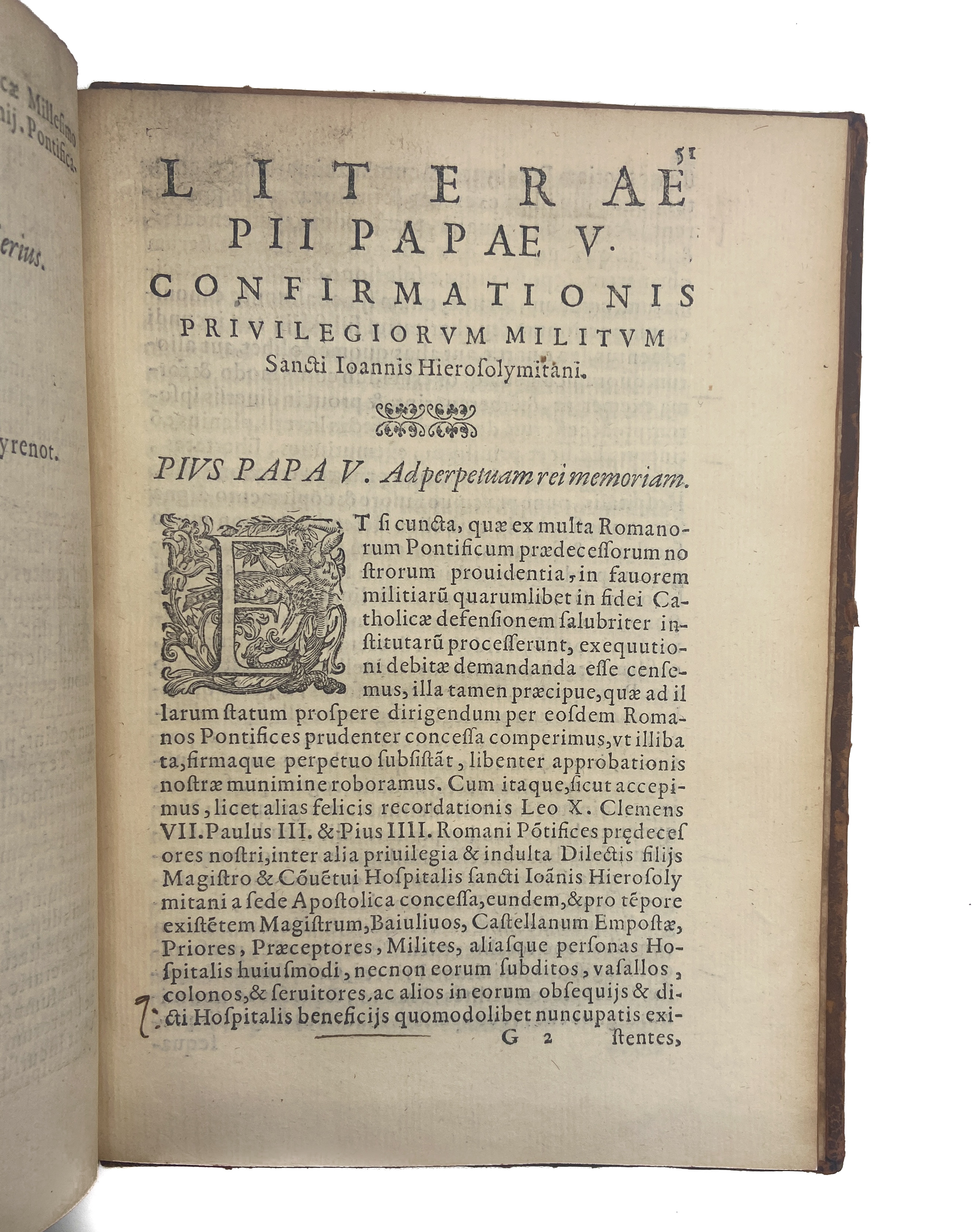 The Order of the Knights Hospitallers of St. John was founded in the 11th century at Jerusalem, with the task of providing care for the sick and poor pilgrims to the Holy Land. After the fall of Jerusalem to the Arabs, the knights settled in Rhodes and then in Malta, devoting themselves to protecting the Mediterranean shores from the Ottomans and to fighting piracy. ‘Li privilegii’ contains the Latin text of a series of papal bulls and letters granting the Knights of the Order privileges and exemptions from all secular and religious authorities. The most important is ‘Circumspecta Romani Pontificis’, promulgated by Pope Pius IV in 1560: this decree stated that the knights were free from any ecclesiastical jurisdiction, including the Holy See Government, and free from local and national taxes; the bull also granted the Grand Master plenary power over the members and possessions of the Order. The second part of the book, in Italian vernacular, is perhaps the most entertaining. Step by step, Bosio describes the investiture ceremony procedure in the flowing form of a dialogue between the aspirant knight and the person bestowing the title upon him. The ceremony involved tapping the flat side of a sword on the candidate’s shoulder three times and giving him the knight’s robes.