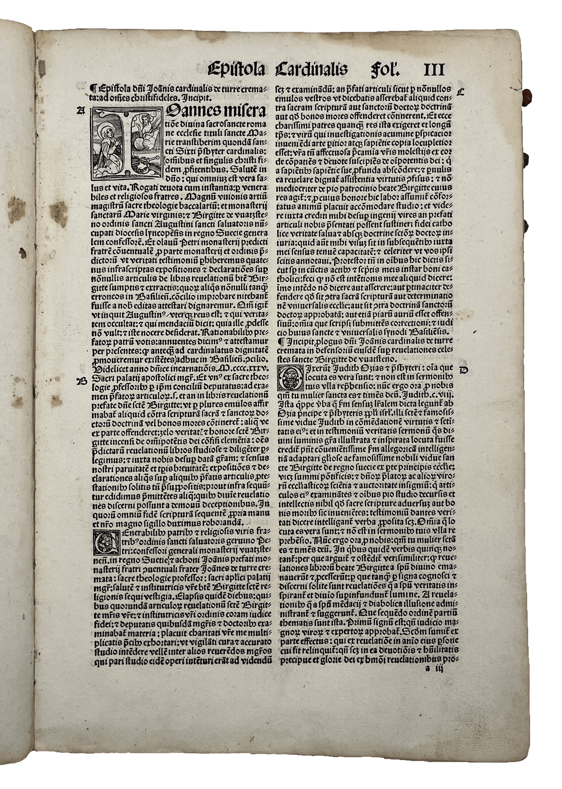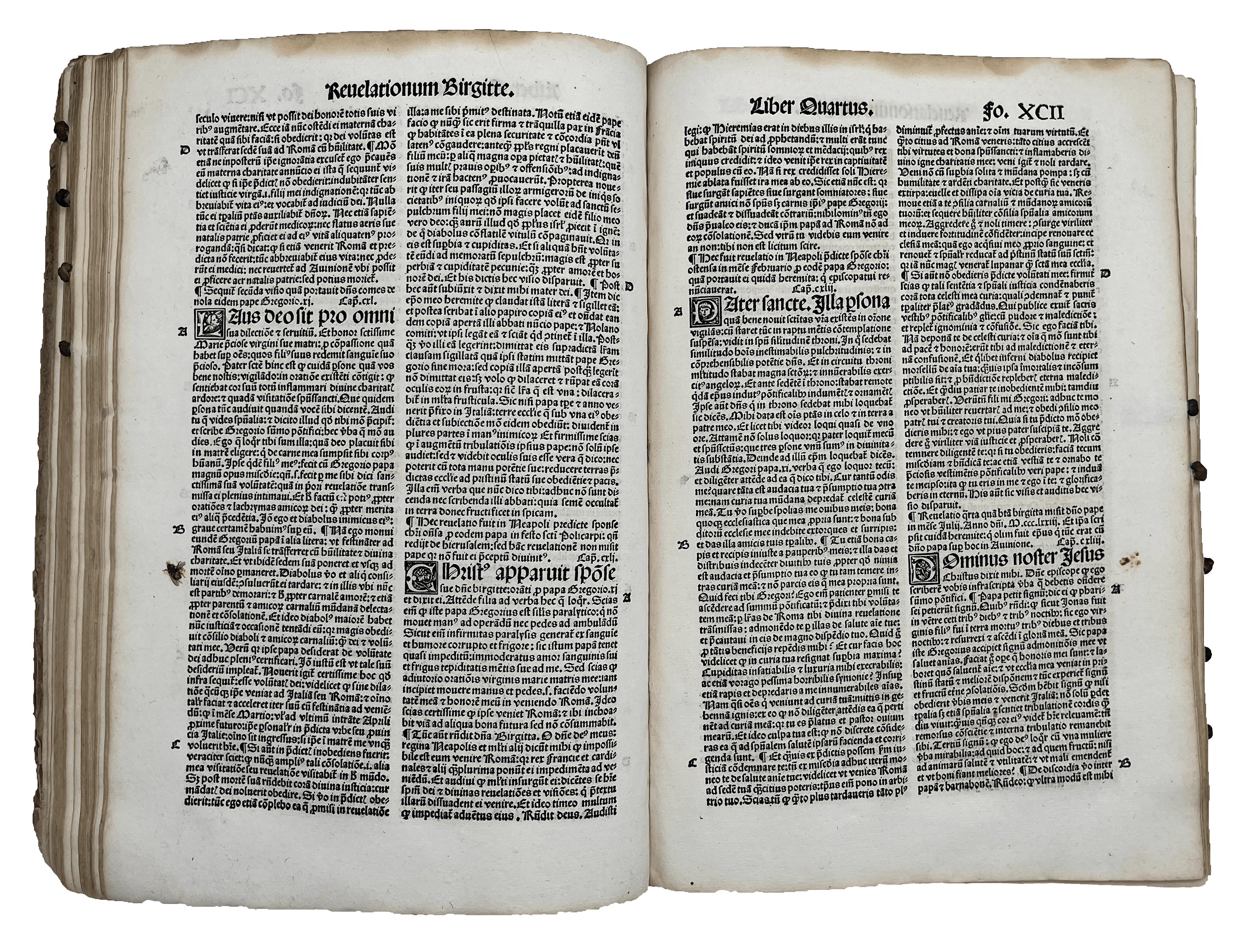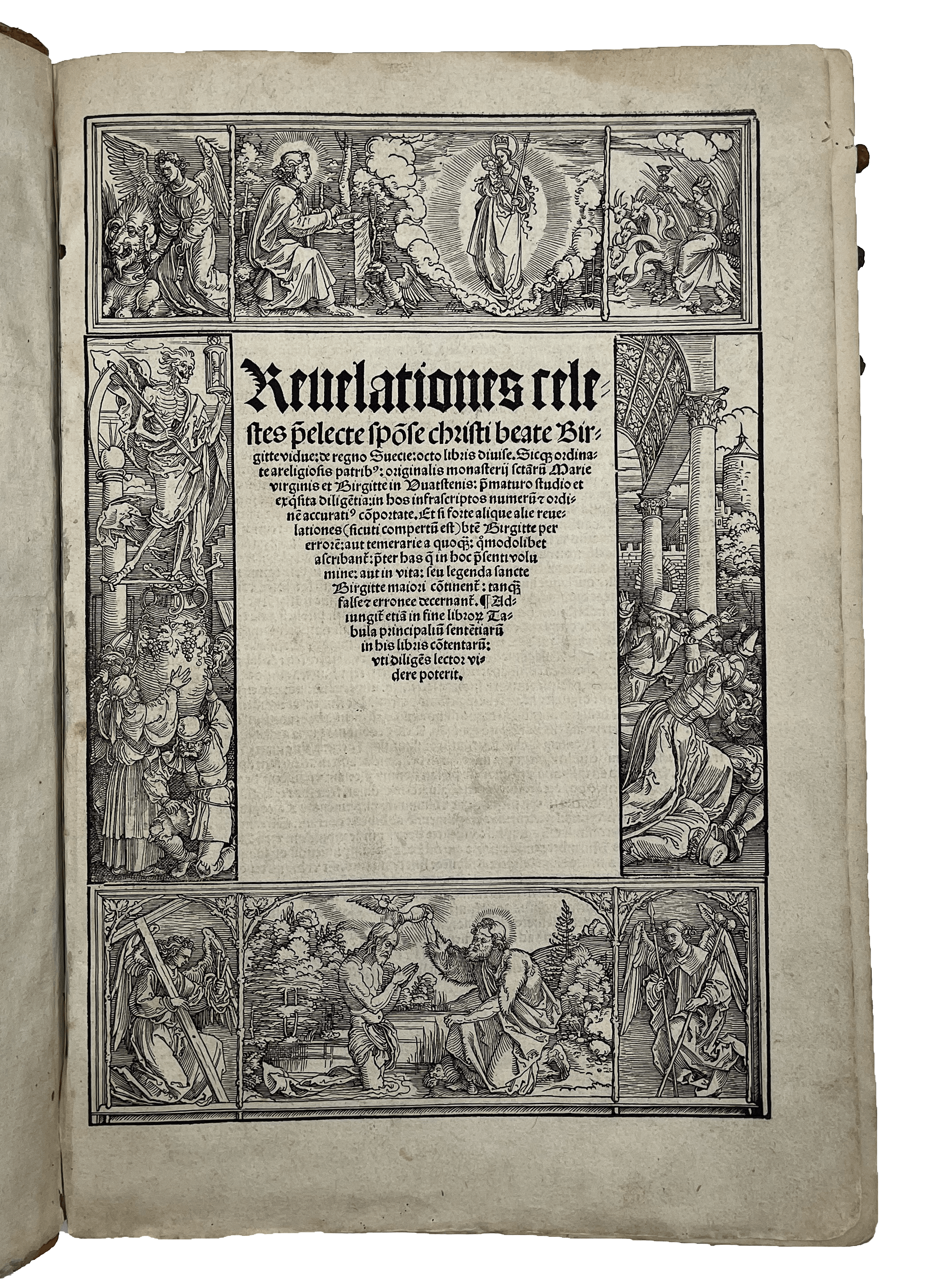Third Latin edition of the Revelations of Saint Bridget of Sweden, first published 1492, and the second to be printed by Koberger, preceded by the edition of 1500. St. Bridget was a fourteenth-century Catholic mystic and founder of the Bridgettine order. She is the principal saint of Sweden. She experienced visions from a young age, including of Christ’s Passion and Nativity, and Purgatory. Her vision of the Christ child emitting light had a profound effect on the depiction of the Nativity in Western art, and her revelation of the sufferings of Christ during the Passion led to the immensely popular set of prayers, the ‘Fifteen O’s’ of St. Bridget.