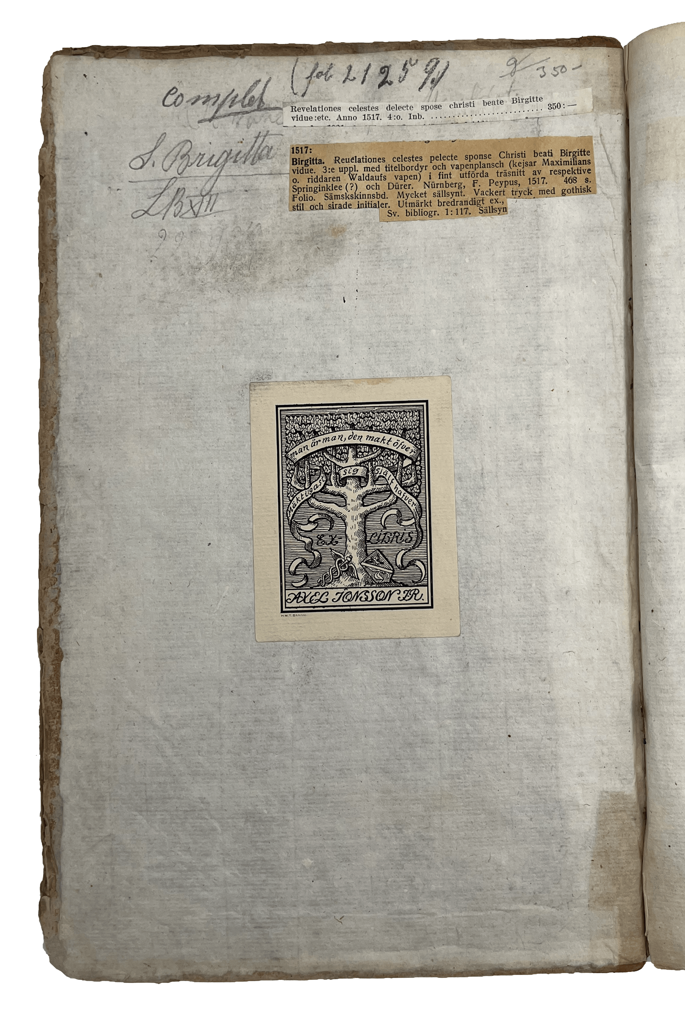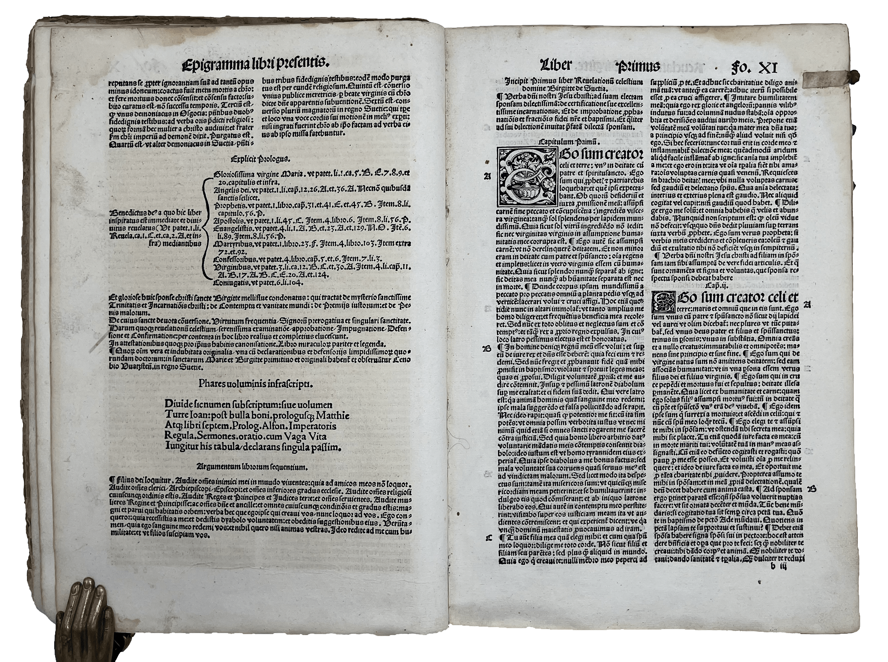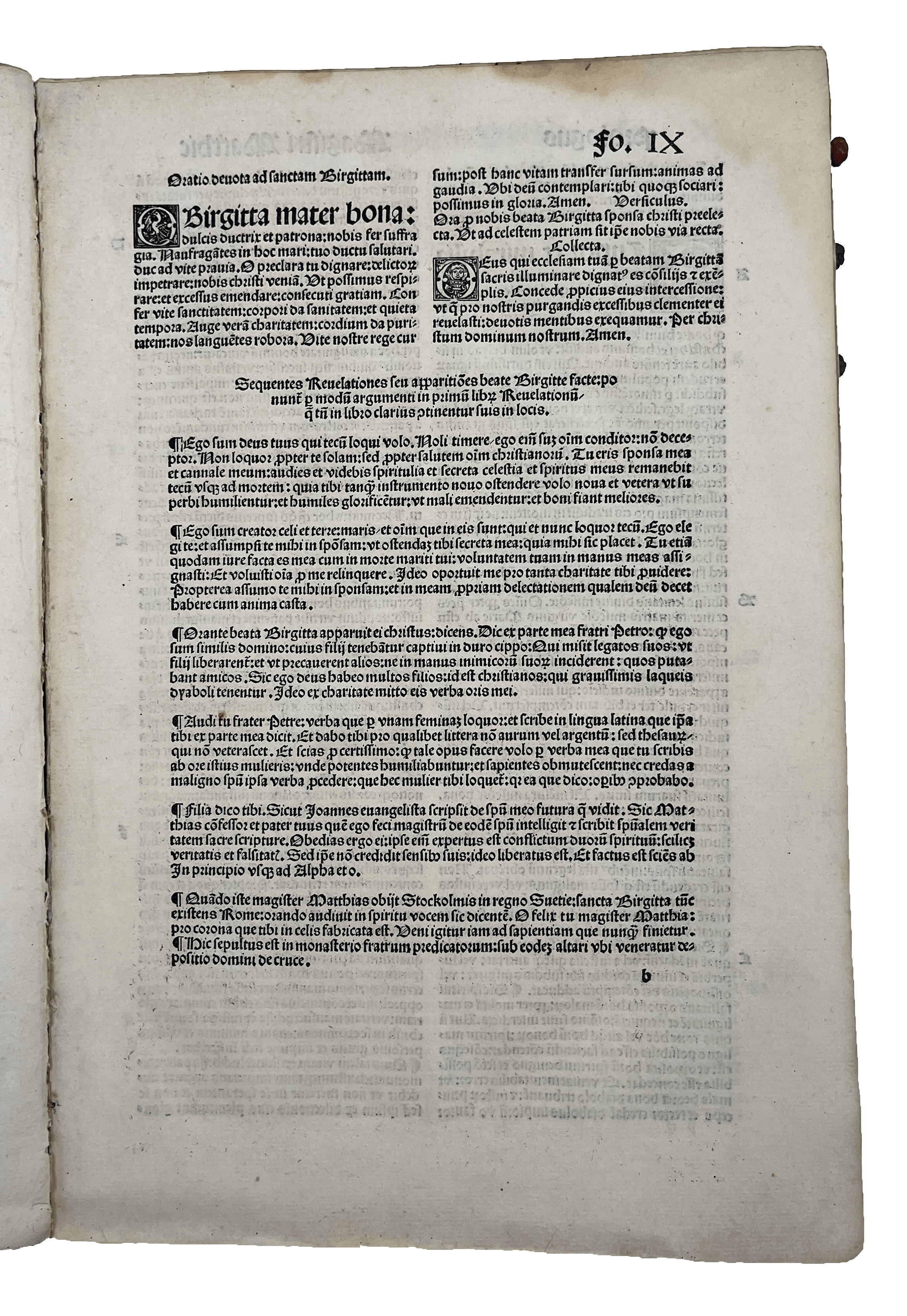 Third Latin edition of the Revelations of Saint Bridget of Sweden, first published 1492, and the second to be printed by Koberger, preceded by the edition of 1500. St. Bridget was a fourteenth-century Catholic mystic and founder of the Bridgettine order. She is the principal saint of Sweden. She experienced visions from a young age, including of Christ’s Passion and Nativity, and Purgatory. Her vision of the Christ child emitting light had a profound effect on the depiction of the Nativity in Western art, and her revelation of the sufferings of Christ during the Passion led to the immensely popular set of prayers, the ‘Fifteen O’s’ of St. Bridget.