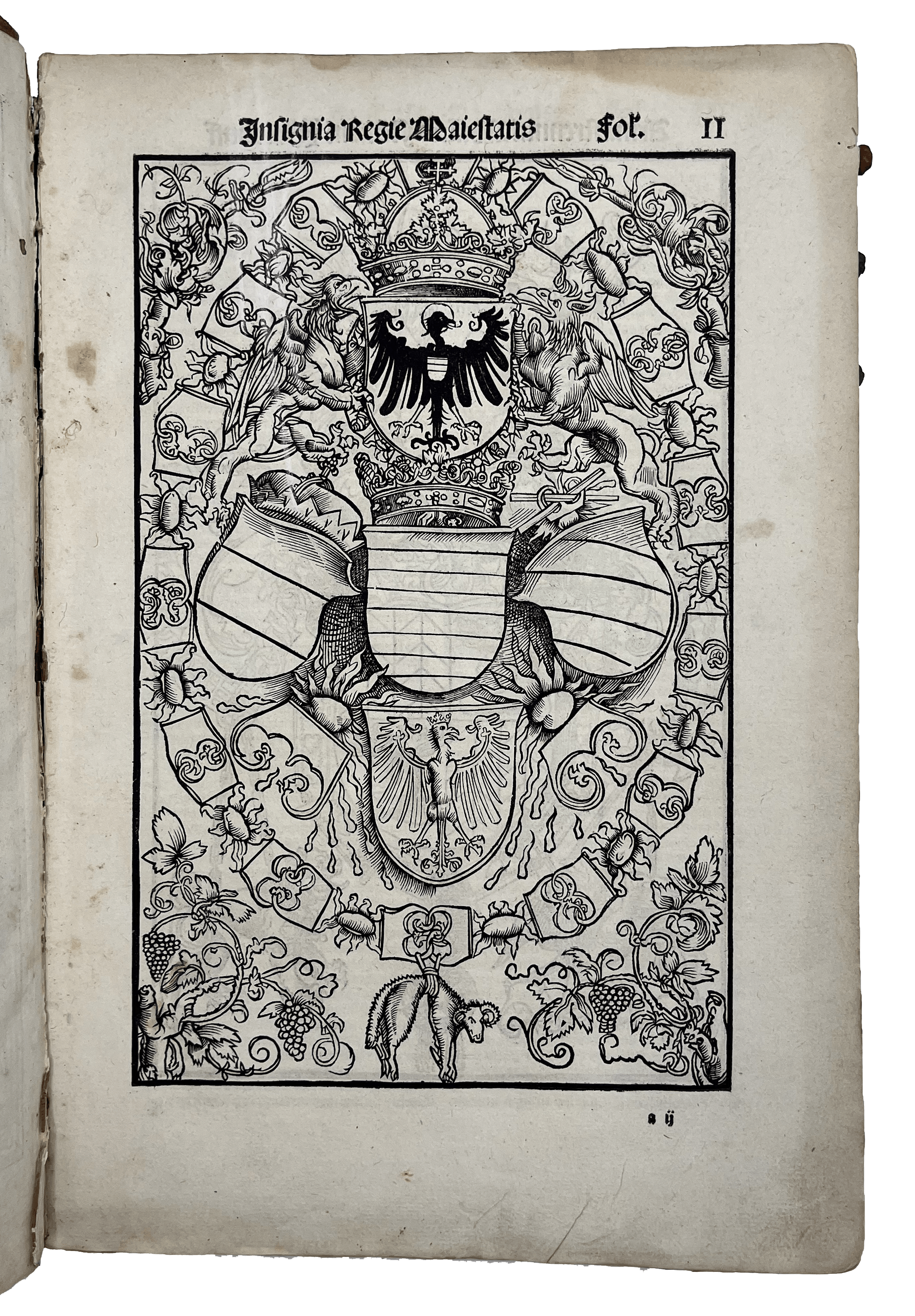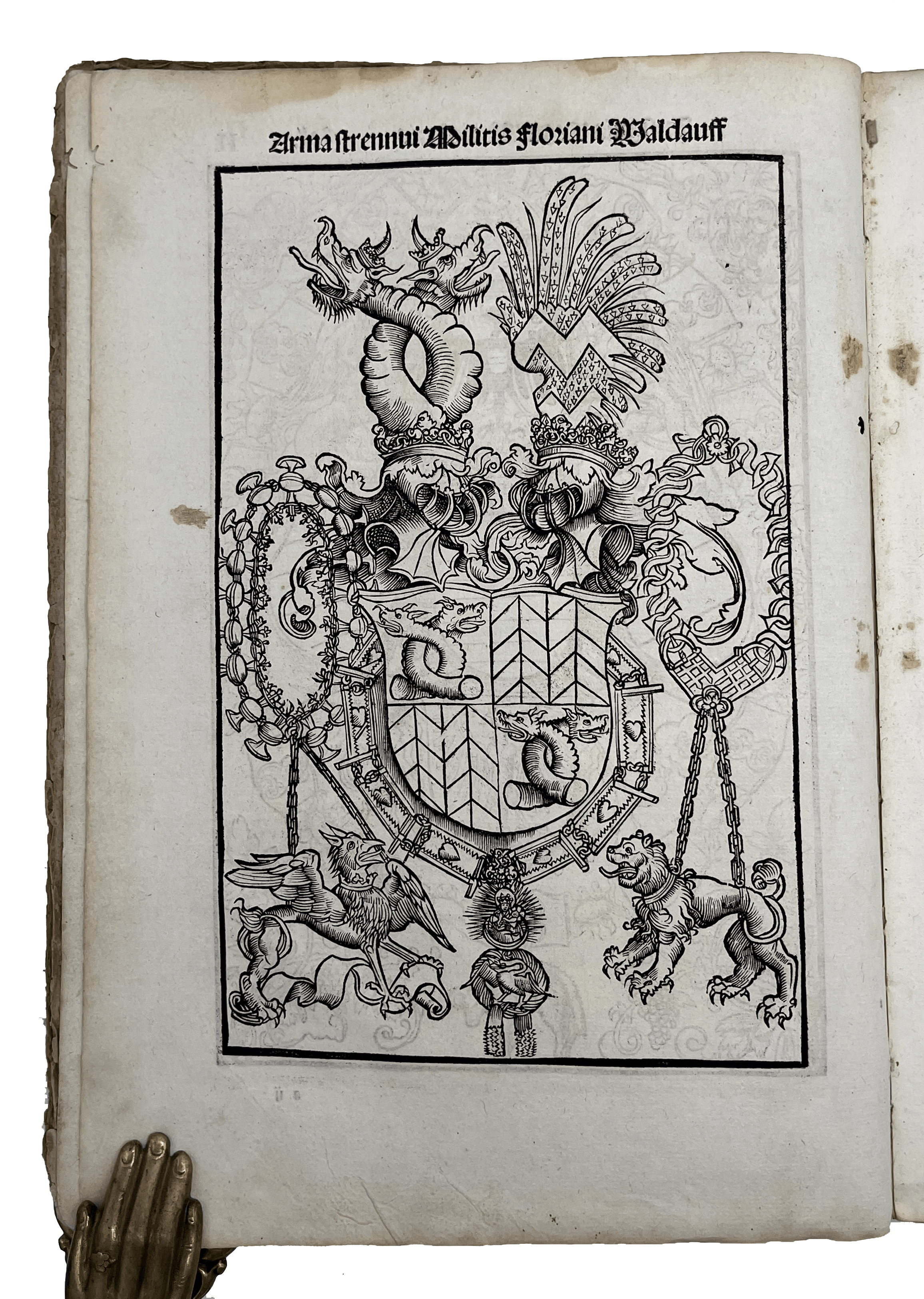 The first edition was illustrated with a number of cuts, sometime attributed to Dürer. These had obviously worn out by 1517, since only the two large woodcut arms re-appeared in this edition and were newly recut. Hans Springinklee (fl. 1512-27) was a pupil of Albrecht Dürer and occasionally his ‘slavish imitator.’ He lived with Dürer and was involved in numerous of his commissions, including the Triumphal Arch of Maximilian, his contributions being often rejected in favour of his master’s superior efforts. ‘Very little of his work is signed, but over 200 woodcuts of varying merit have been attributed to him. The majority are book illustrations published by Koberger in Nuremberg and Lyons’ (BM).