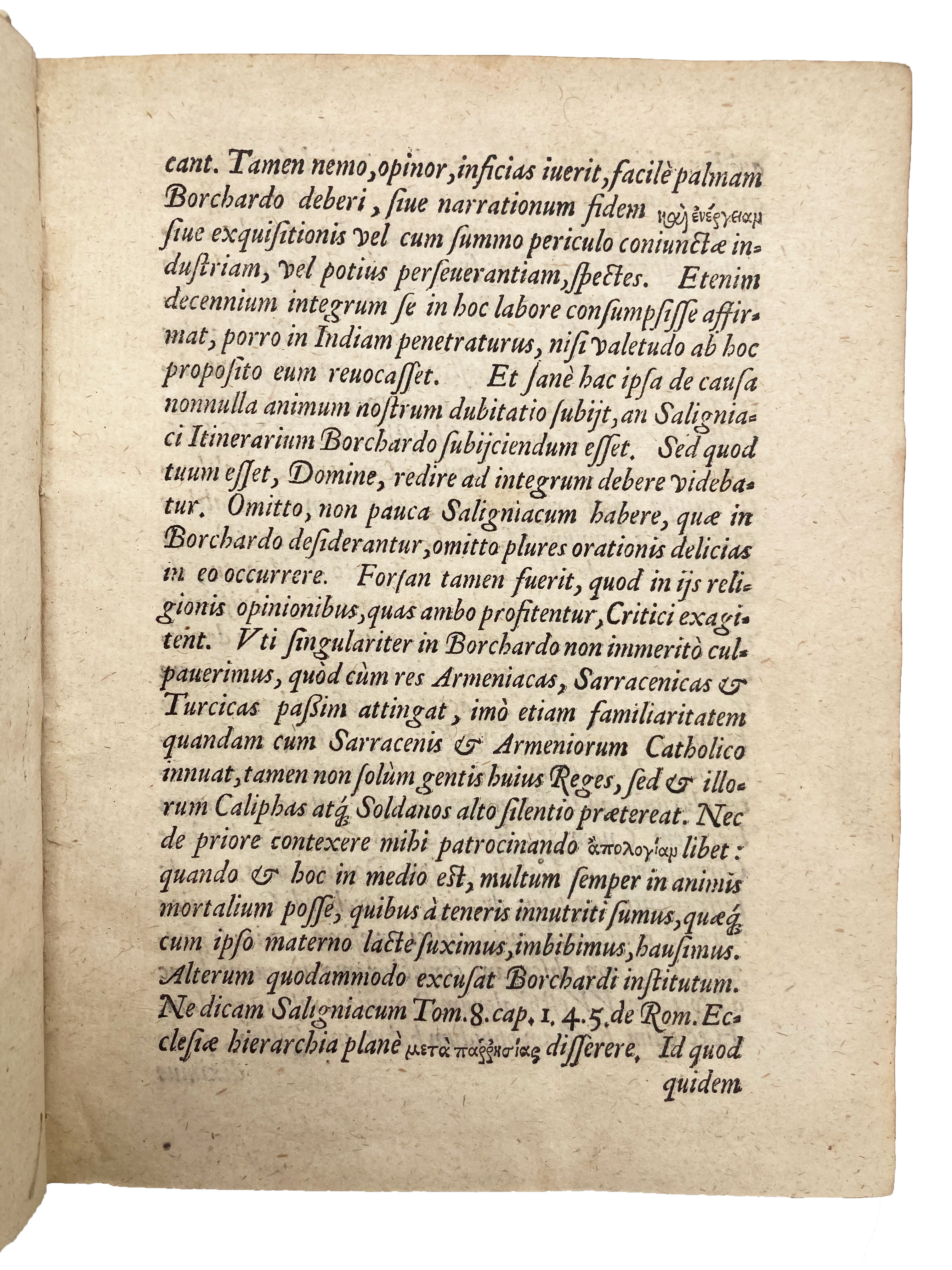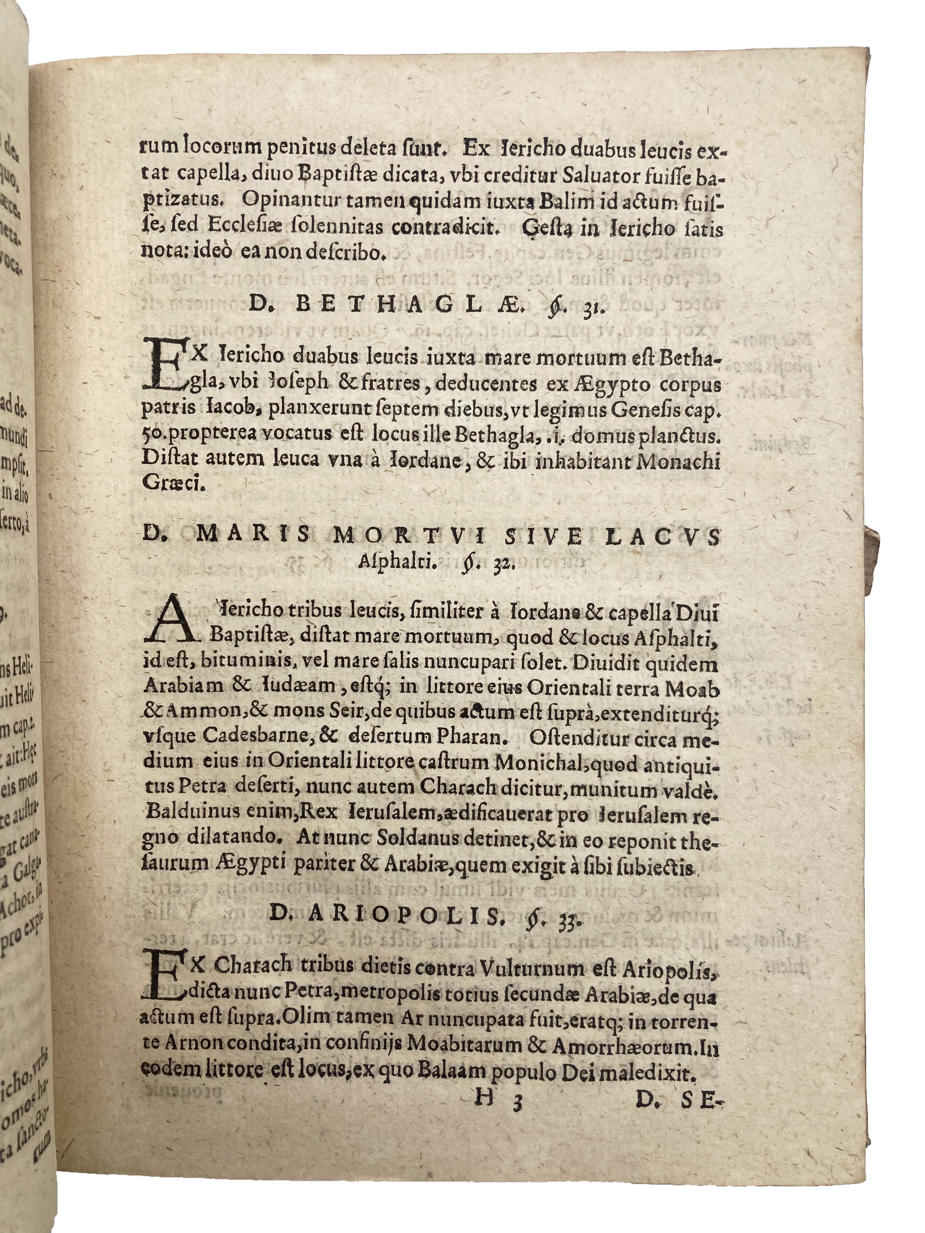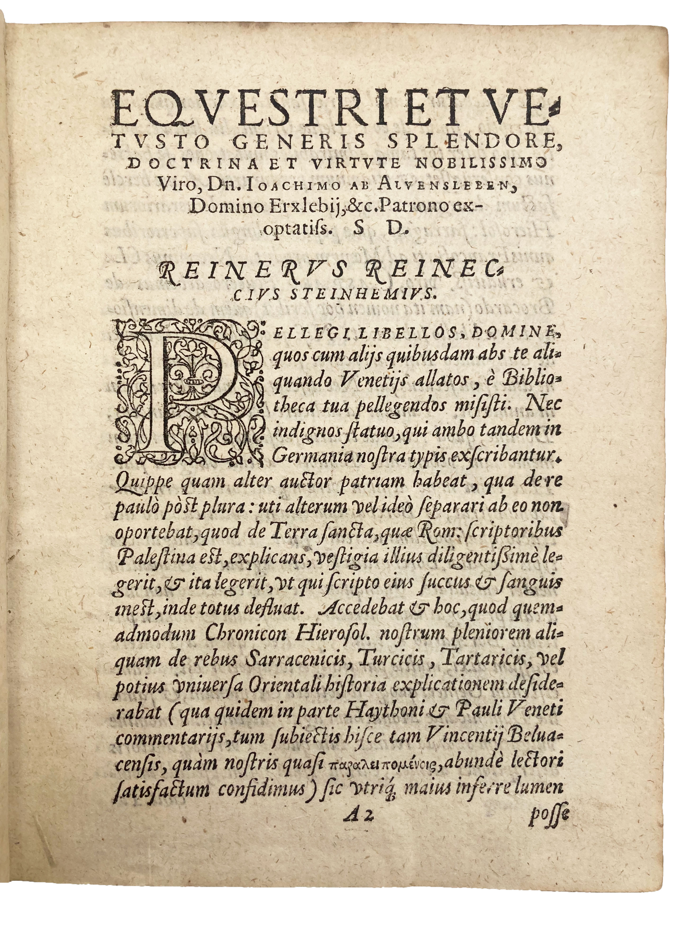 A good copy of the first edition of these important combined travel accounts of the Holy Land and neighbouring lands, in the version taken from mss preserved in the wealthy library of Joachim I von Alvensleben (1514-88). The friar Burchard of Mount Sion travelled to the Middle East in the C13, which resulted into the composition of ‘Descriptio Terrae Sanctae’ – one of the major medieval European accounts of the Holy Land. He travelled via Sicily, Egypt, and Armenia, and spent the years 1274-84 in Palestine. ‘Descriptio’ begins with a geographical definition of ‘Holy Land’, including descriptions of areas in today’s Lebanon (Tyre, Sidon, Beirut, Byblos, and Tripoli), Jordan, and ancient Palestine (including Gaza), as well as Jerusalem, with a special emphasis on New Testament places where Christ lived and preached. It provides a priceless account of what those places looked like in the C13, e.g., about a new church in Bethlehem he writes: ‘The whole floor is laid with marble of many colours and a great variety of decorations, the cost of which is impossible to estimate.’ The second part focuses on the various nations and communities inhabiting the Holy Land, e.g., Muslims, Syrians, Greeks, Nestorians, Maronites, Nubians, and Armenians. It is followed by a long description of Egypt, then ruled by the Mamluks. The second work was written by Barthélemy de Salignac, of whom nothing is known, and had first appeared in print in Venice in 1518. Divided into short narrative sections, the 10 chapters discuss his departure from Venice and travel via Istria and Albania; his visit of the Ionian islands and Cyprus; a description of Palestine, Israel, Syria, Arabia, the ‘kingdom of Gaza’ (‘located near the sea, with a big population, with a semicircular shape’), and today’s West Bank; an overview of Jerusalem and the main religious sites within the city and  surrounding areas, as they looked like in the early C16. For instance, the sanctuary on Mount Calvary is described as having been built with lots of marble and alabaster. A most interesting collection.