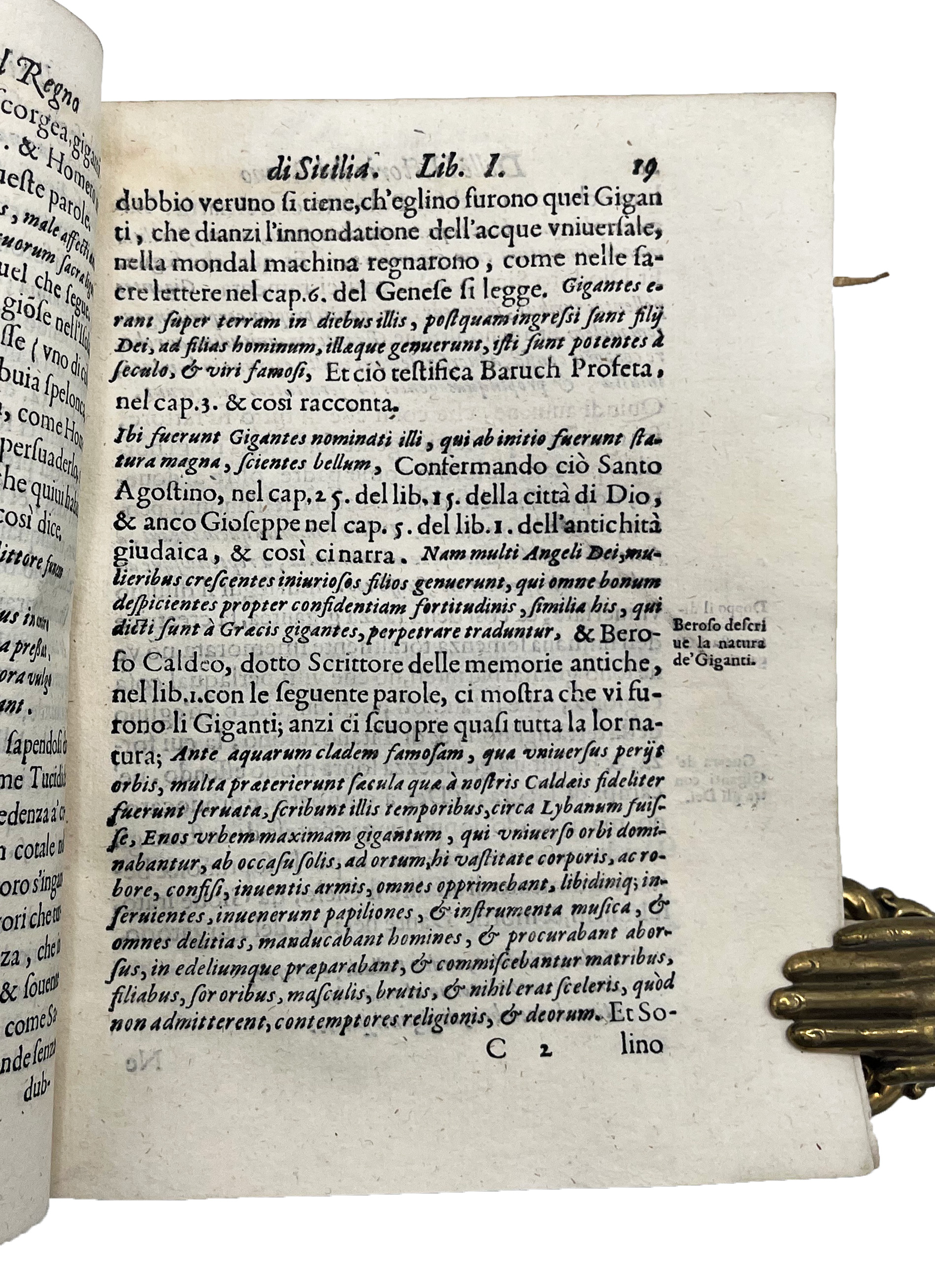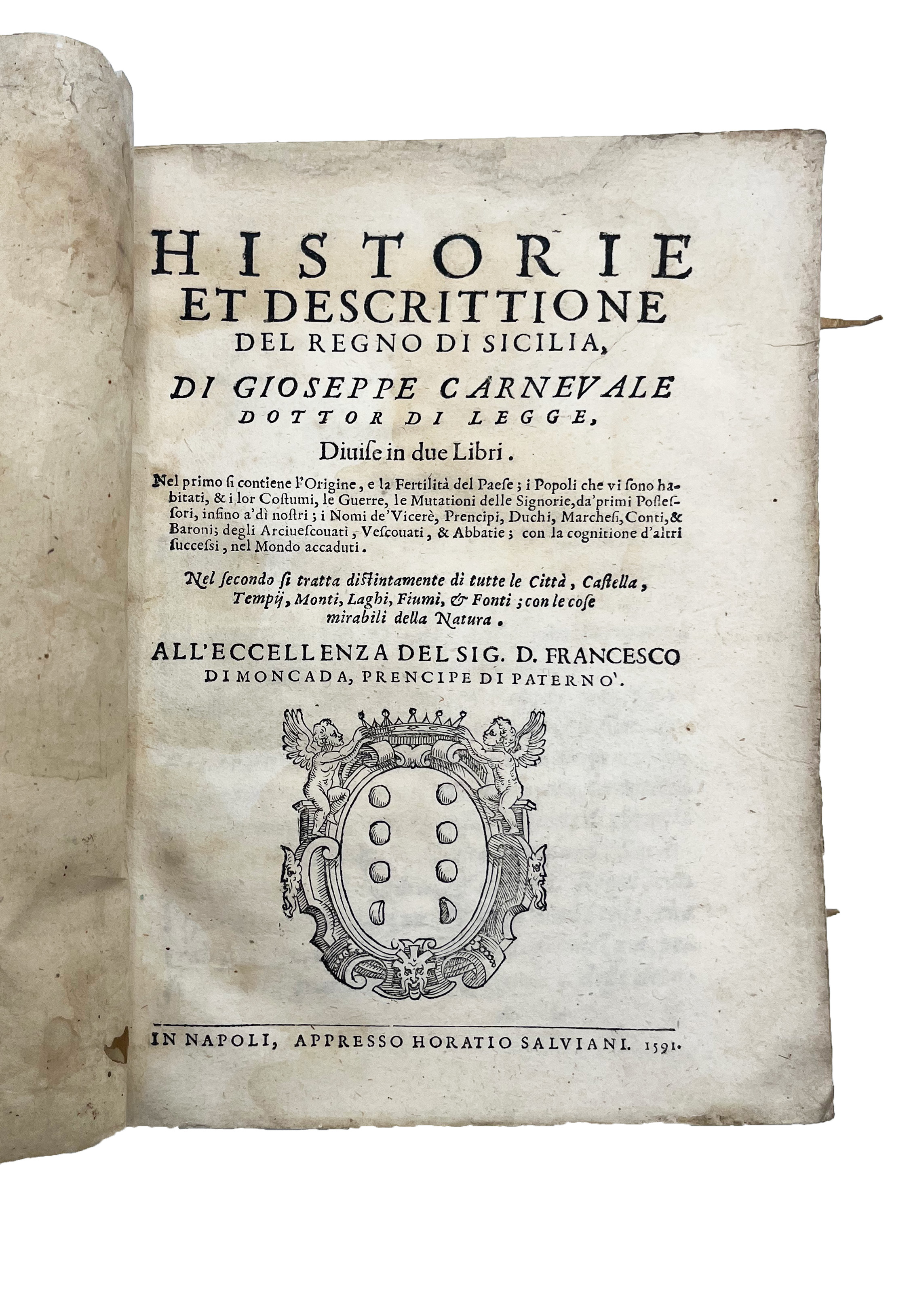 First edition of this detailed history and topography of Sicily, produced at a time when chorographic descriptions of the island were flourishing. Giuseppe Carnevale (1558-) was a lawyer of Sicilian origin, who worked in Naples. His ‘Historie’ remained one of the key sources for Sicilian history from the C17 to the C19 century. The work begins by contextualising Sicily as an island, with its geographical location, providing the etymology for its name Trinacria, ancient sources on its history (including the Pseudo-Berosus on giants), and observations on Sicilian customs and language (‘an Italian idiom, albeit corrupted, being primarily a barbarian language, later influenced by Greek’). The remainder of Part I discusses Sicilian history, from its more or less legendary origins to the author’s own time, with references to major events including plagues and the Ottoman Turkish excursions into the island and a short summary of their possessions and recent history. Appended to the work are detailed lists of Sicilian rulers, Vicerè from 1516, Archbishops, but most interesting of all is the final demographic summary of Sicily c.1590, with the number of men (234,821) aged 18-50 and under 18 (284,067), and women (452,503), a total of 971,401 inhabitants, owning 17,175 horses, 29,258 cows, and 11,719,450 [?] in estates and goods. Part I focuses on Sicilian topography, with a narrative tour covering cities from Tindari to Messina, interspersed, in typical Renaissance fashion, with ancient or medieval anecdotes, fables, proverbs, and legends inspired by local antiquities. An extremely interesting work, and one of the most respected sources for Sicilian history.