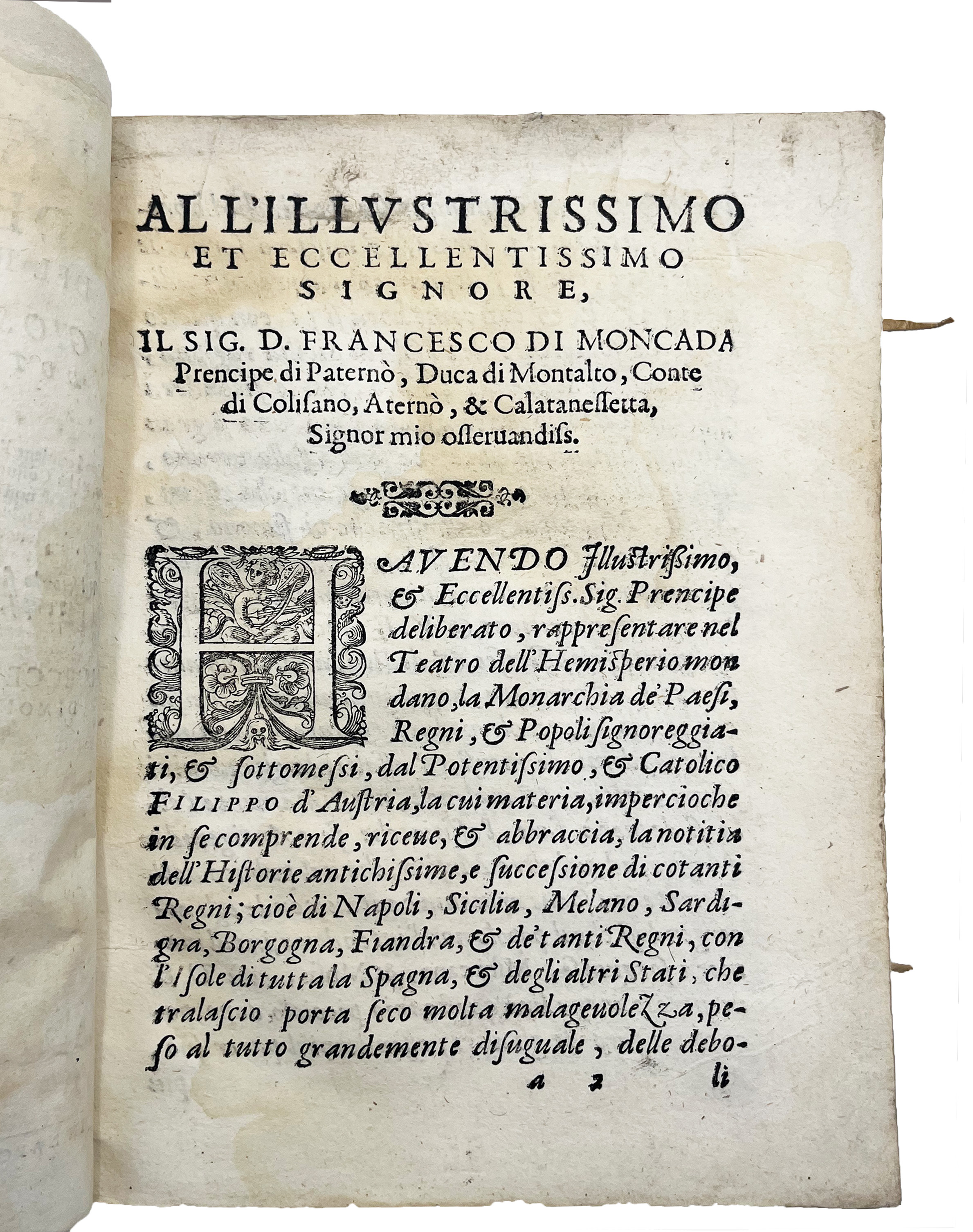 FIRST EDITION. 4to. 2 parts in 1, ff. [20], 253, [1]. Separate titles, woodcut arms of Francesco Moncada, Principe di Paternò to each, printer’s device to last verso, decorated initials and ornaments. Light age yellowing, title a trifle frayed at head, light water stain from upper gutter of first and last three gatherings, intermittent light water stain to outer blank margin. A good copy in contemporary limp vellum, traces of ties, and printed waste used as spine lining.