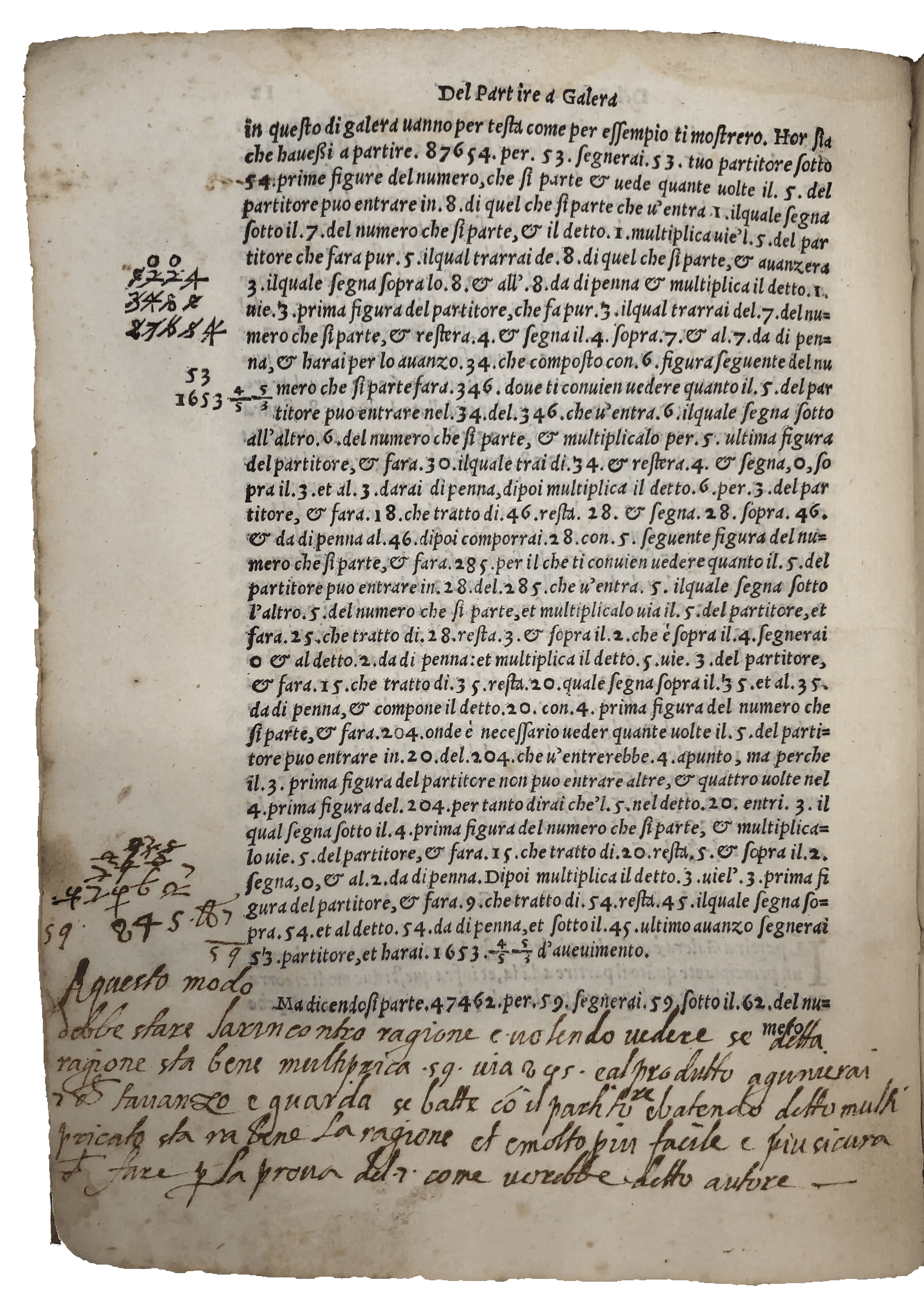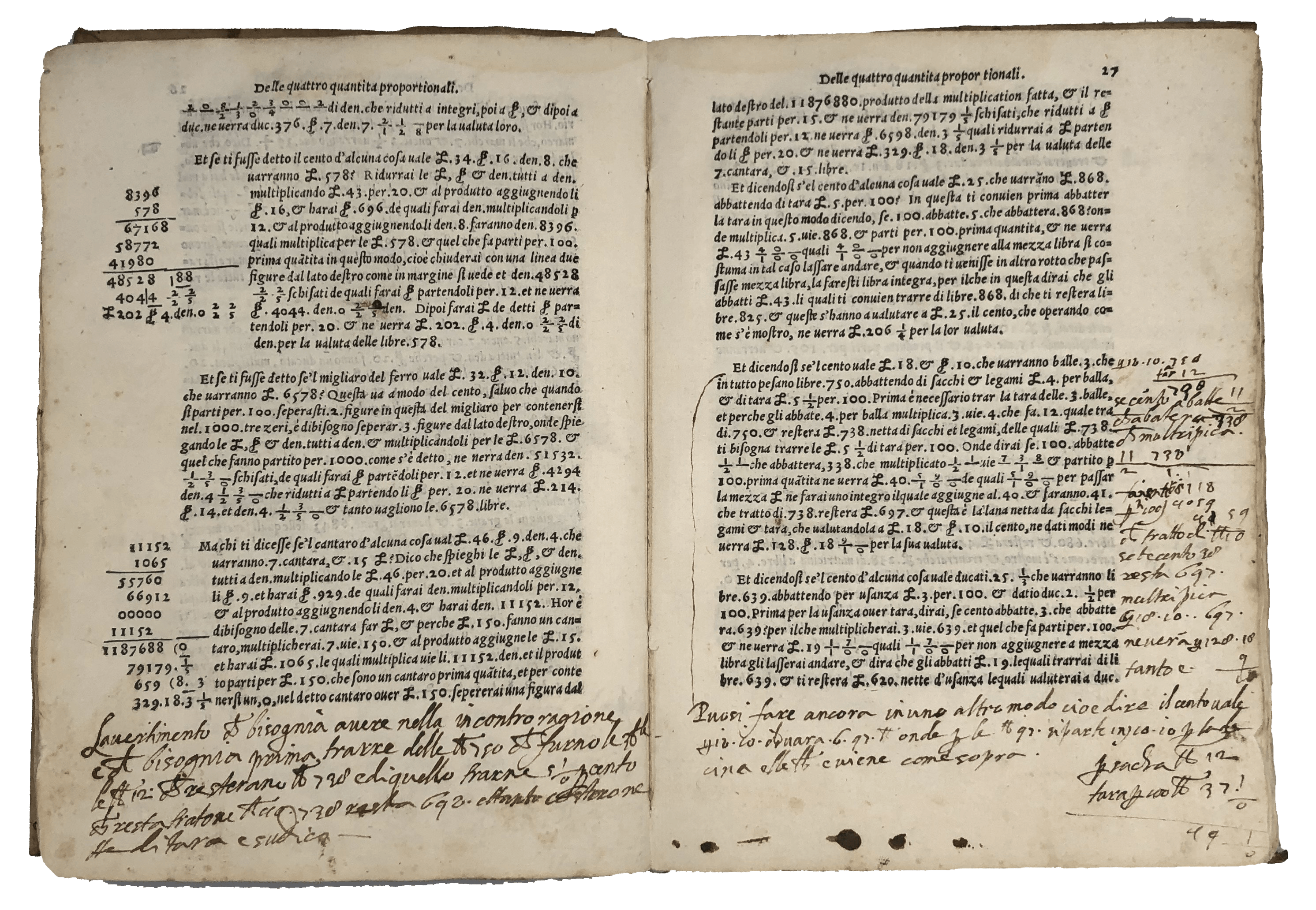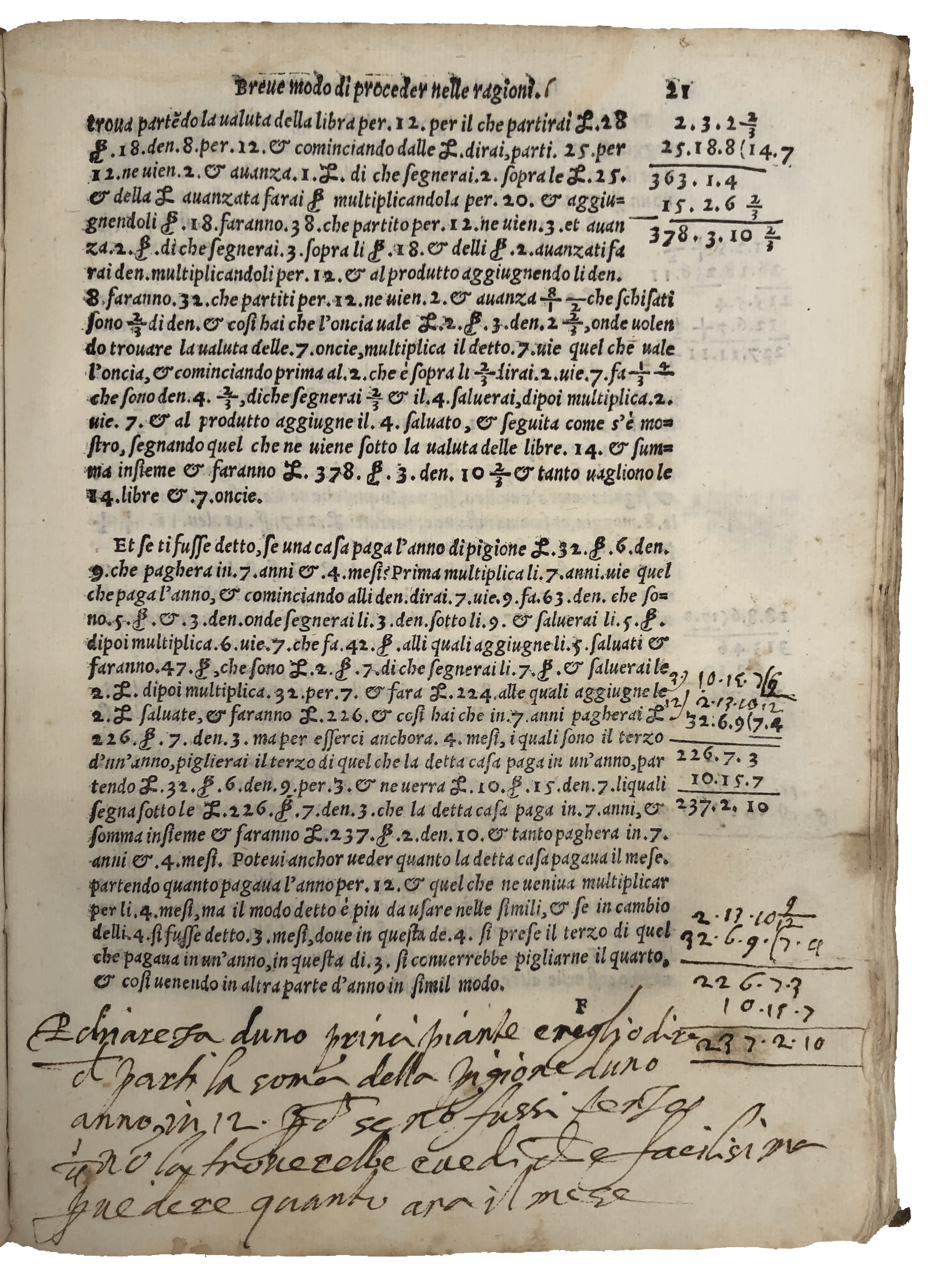 A most appealing copy of the first edition of this influential treatise on arithmetic and geometry—‘fairly practical and in many respects in advance of its time’ (Smith, ‘Rara’, 242). Pietro Cataneo (1510-74) was a mathematician from Siena with a side interest in architecture. ‘Le pratiche’ provides fundamental knowledge of arithmetic and geometry for accounting. The first part discusses the four mathematical operations (addition, subtraction, multiplication and division) including their applications in the counting of currency of different value and weight as well as applied problems based on real life—e.g., the three jealous husbands who want to cross a river with their wives on a boat which can only hold two people at a time. The second is concerned with basic geometry, with a thorough examination of geometrical triangulation applied to measuring and subdividing allotments. The Florentine influence of his background surfaces in the choice of the word ‘biricuocolo’ to mean multiplication (Smith, ‘Rara’, 242). The slightly later annotator of this copy wrote on the final blank the procedure to extract the square and cube root of specific numbers. He also highlighted sections concerning gold and silver—e.g., calculating the number of carats before and after refinery, and the proportion of precious metals in alloys. He was probably a teacher. For a couple of sections—on the calculation of the quantity of wool as compared to the bags to transport it, the quantity of silver in coins and the payment of house rents—he added his own alternative method, calling it ‘better’ or ‘clearer for beginners’. In another, on fractional subtraction, he said it seemed to him that ‘the author had not considered’ the issue of what are known today as ‘continued fractions’, a study of which did not appear in print until 1579.