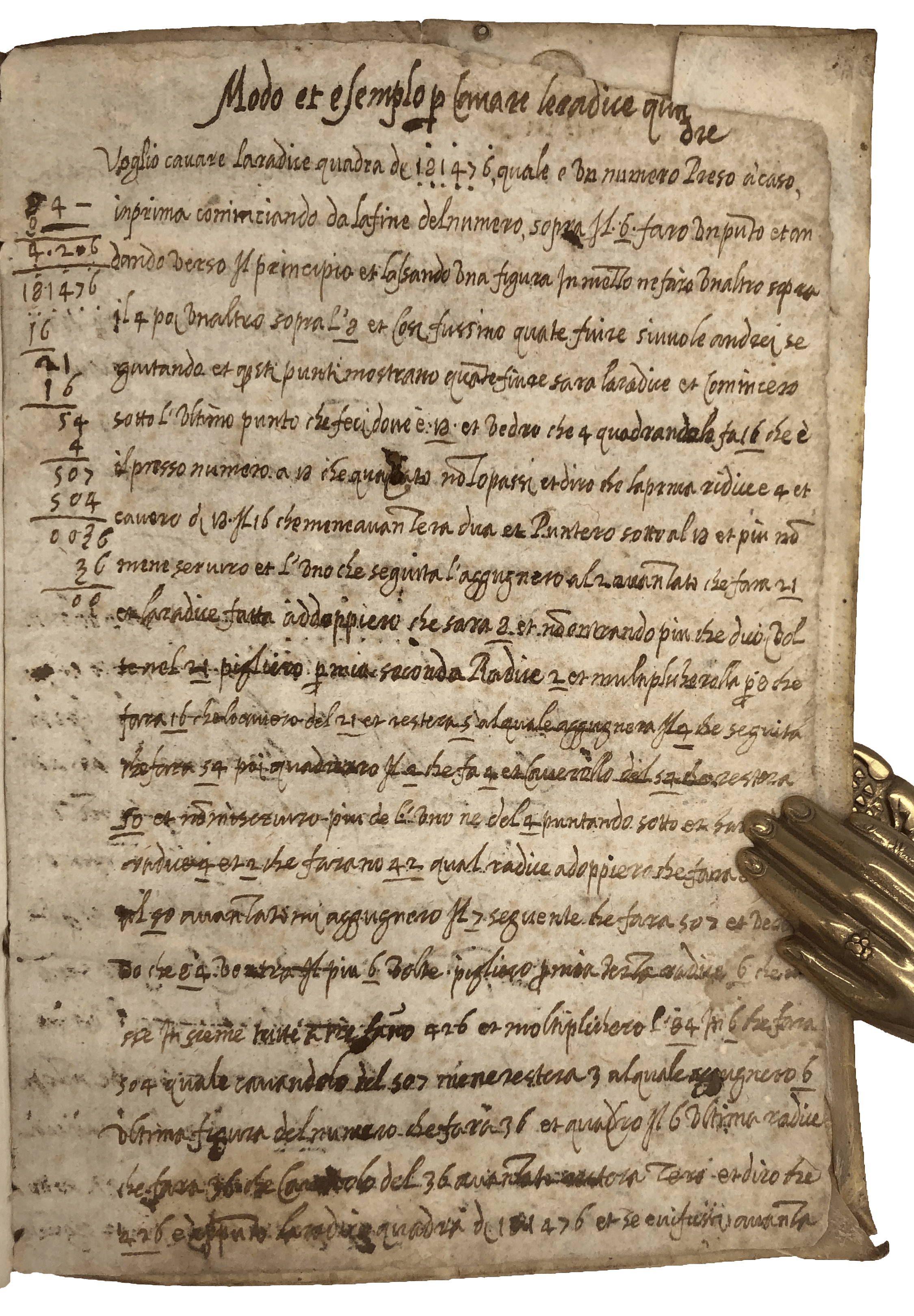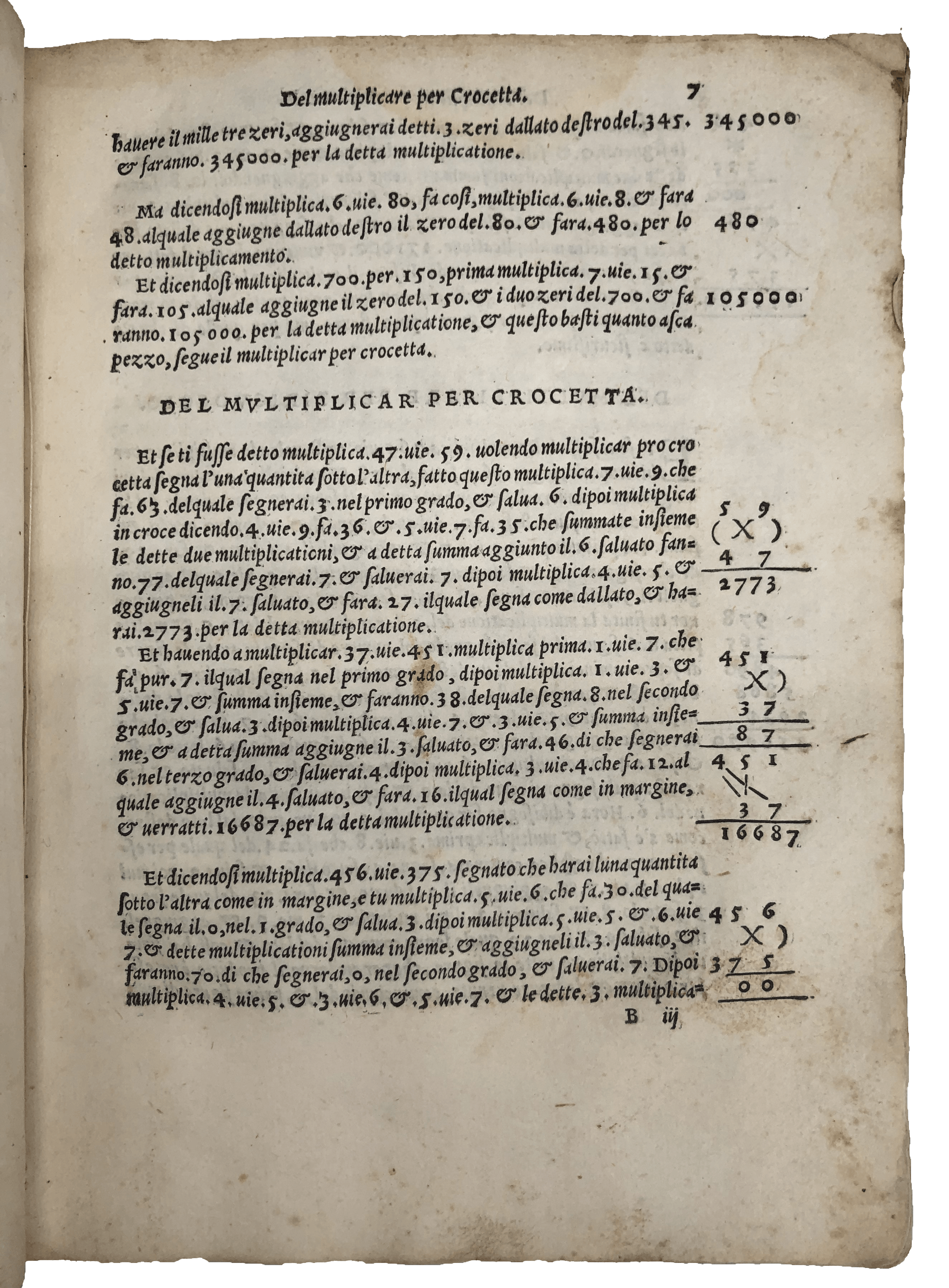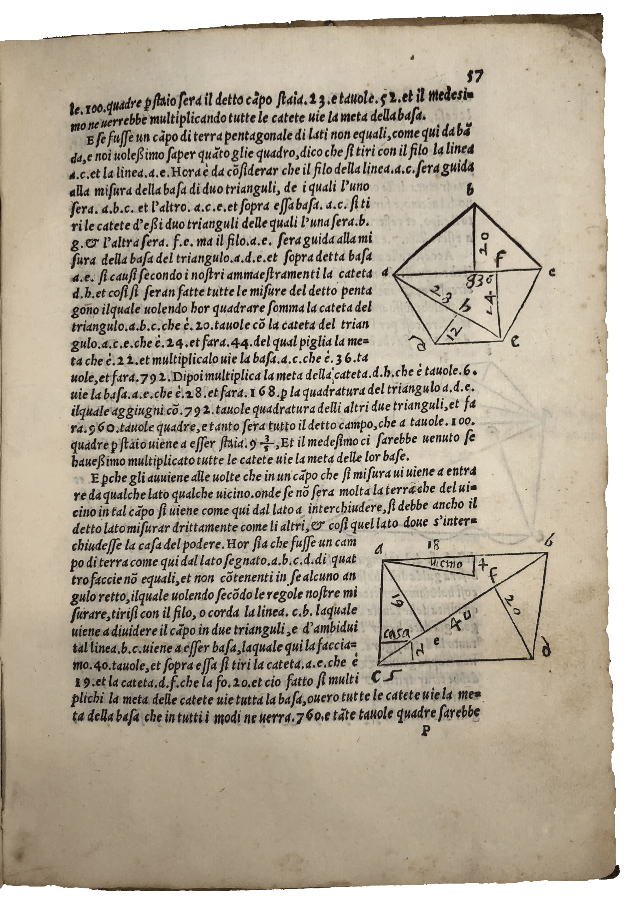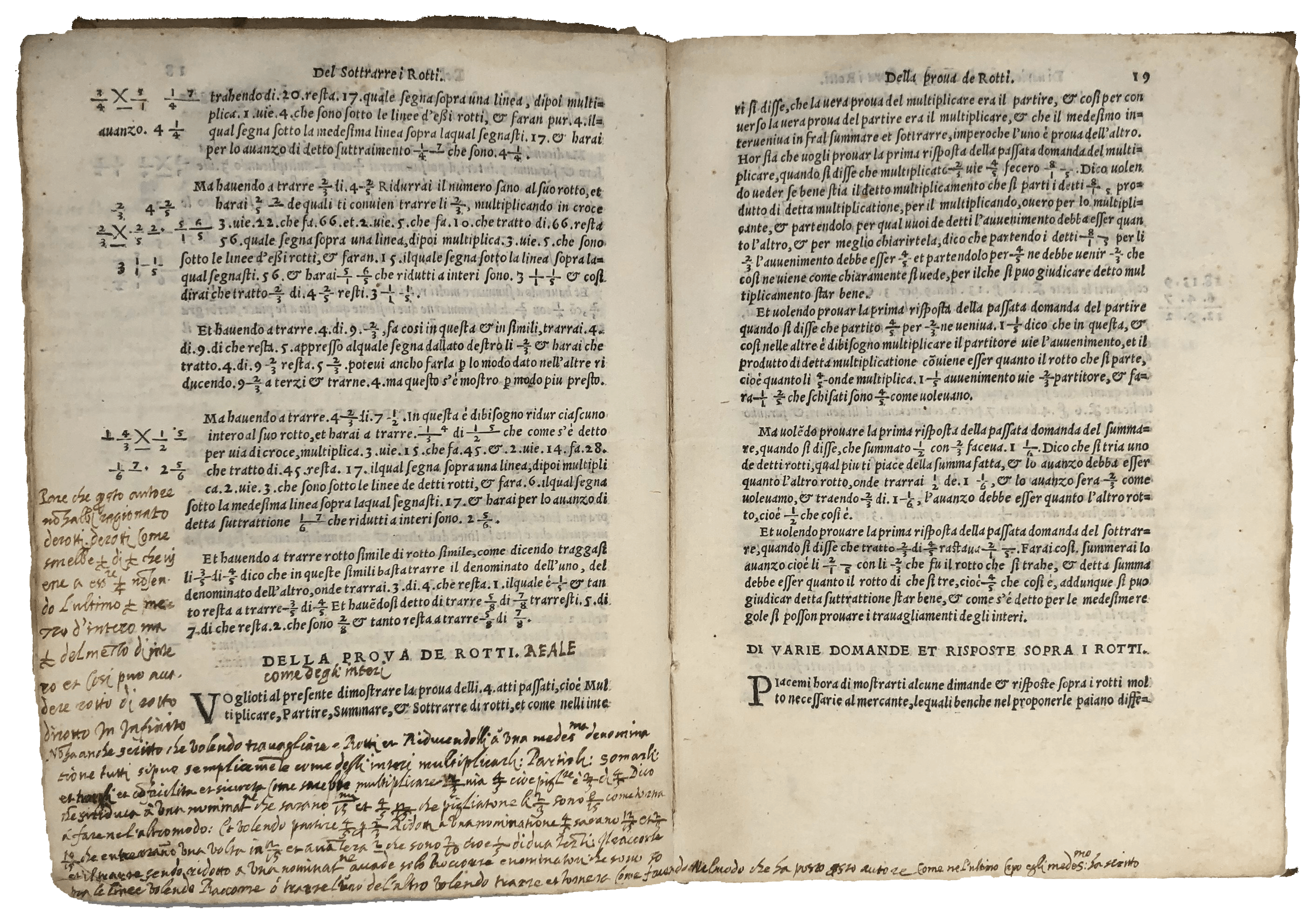 A most appealing copy of the first edition of this influential treatise on arithmetic and geometry—‘fairly practical and in many respects in advance of its time’ (Smith, ‘Rara’, 242). Pietro Cataneo (1510-74) was a mathematician from Siena with a side interest in architecture. ‘Le pratiche’ provides fundamental knowledge of arithmetic and geometry for accounting. The first part discusses the four mathematical operations (addition, subtraction, multiplication and division) including their applications in the counting of currency of different value and weight as well as applied problems based on real life—e.g., the three jealous husbands who want to cross a river with their wives on a boat which can only hold two people at a time. The second is concerned with basic geometry, with a thorough examination of geometrical triangulation applied to measuring and subdividing allotments. The Florentine influence of his background surfaces in the choice of the word ‘biricuocolo’ to mean multiplication (Smith, ‘Rara’, 242). The slightly later annotator of this copy wrote on the final blank the procedure to extract the square and cube root of specific numbers. He also highlighted sections concerning gold and silver—e.g., calculating the number of carats before and after refinery, and the proportion of precious metals in alloys. He was probably a teacher. For a couple of sections—on the calculation of the quantity of wool as compared to the bags to transport it, the quantity of silver in coins and the payment of house rents—he added his own alternative method, calling it ‘better’ or ‘clearer for beginners’. In another, on fractional subtraction, he said it seemed to him that ‘the author had not considered’ the issue of what are known today as ‘continued fractions’, a study of which did not appear in print until 1579.