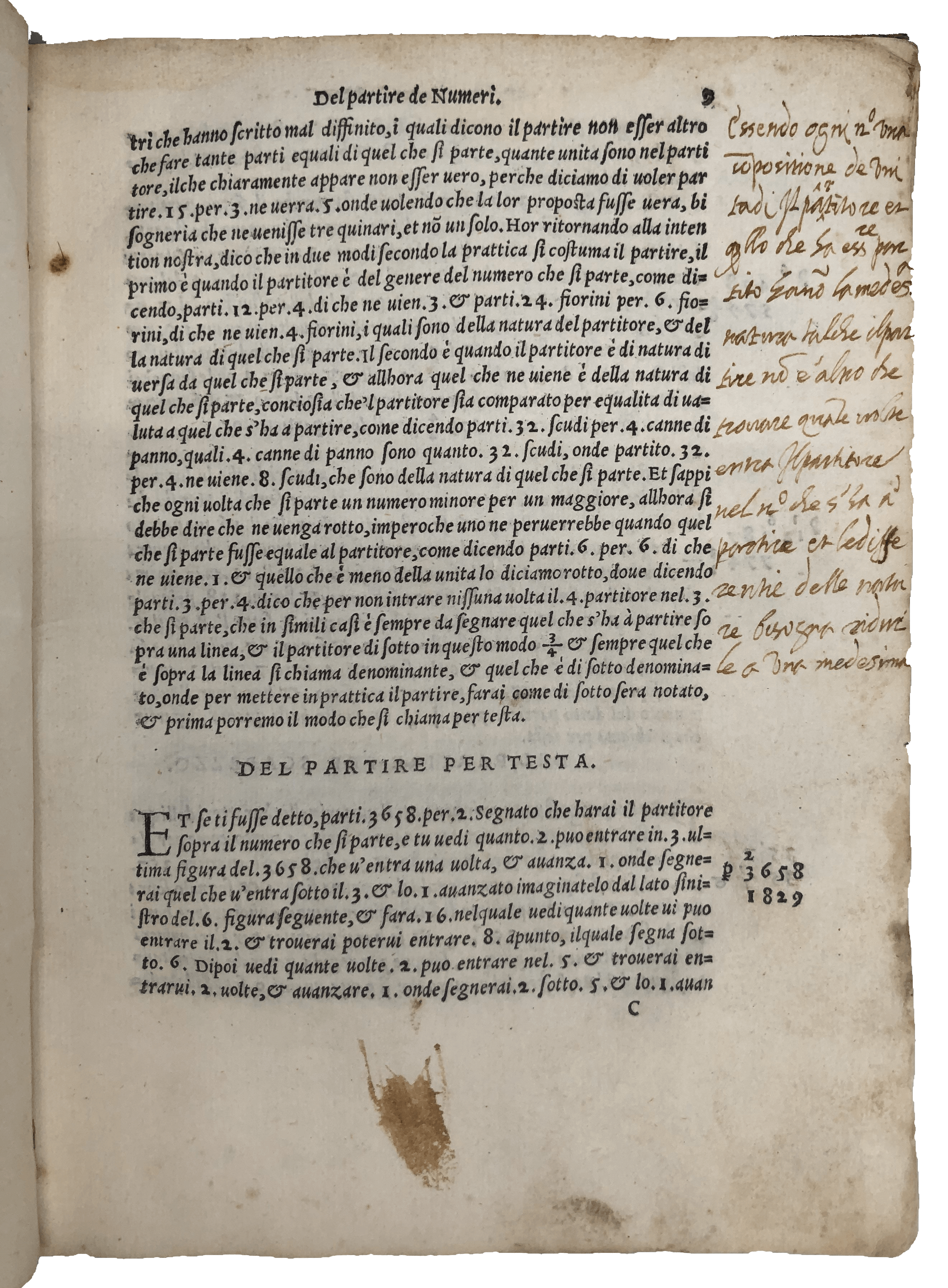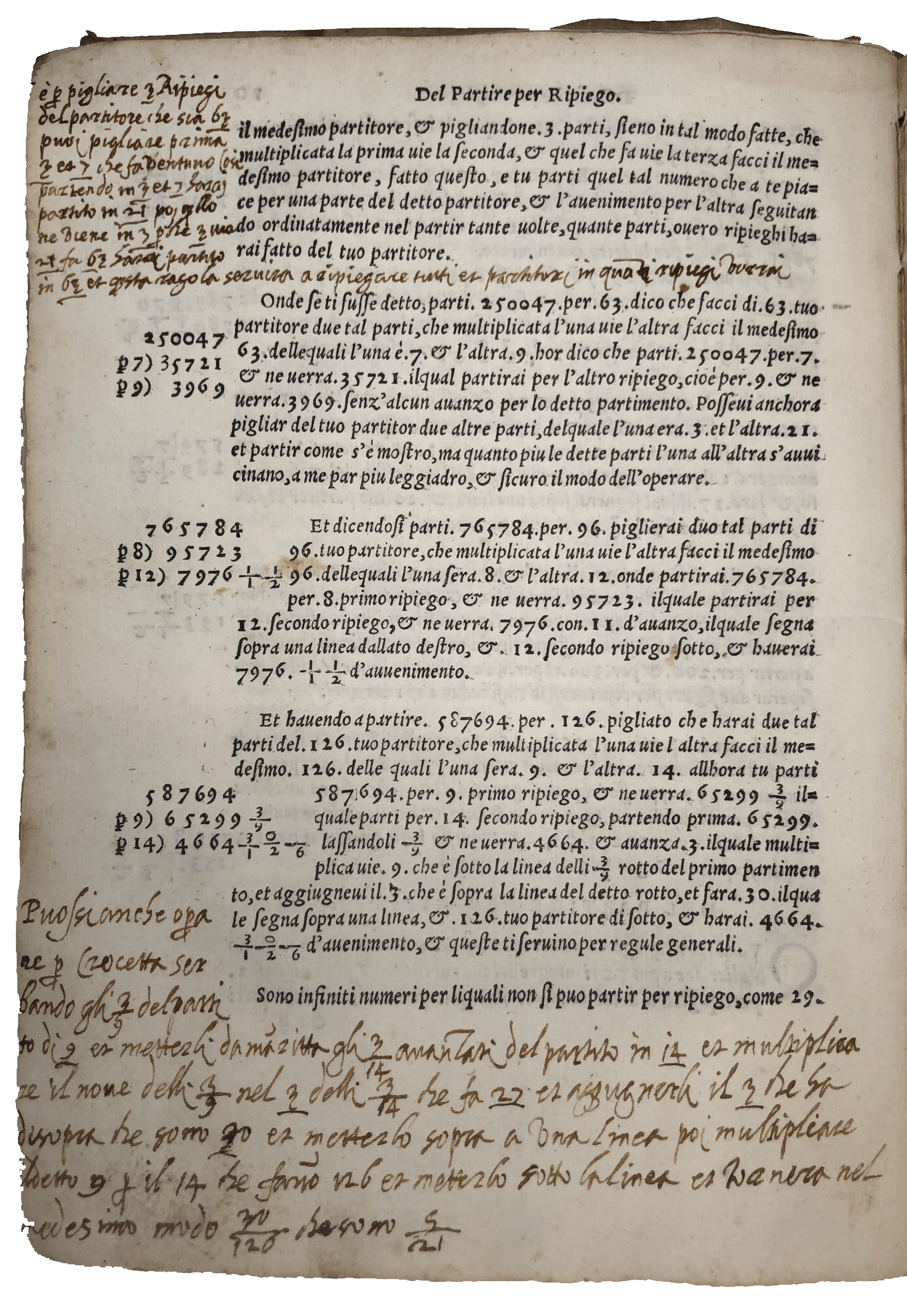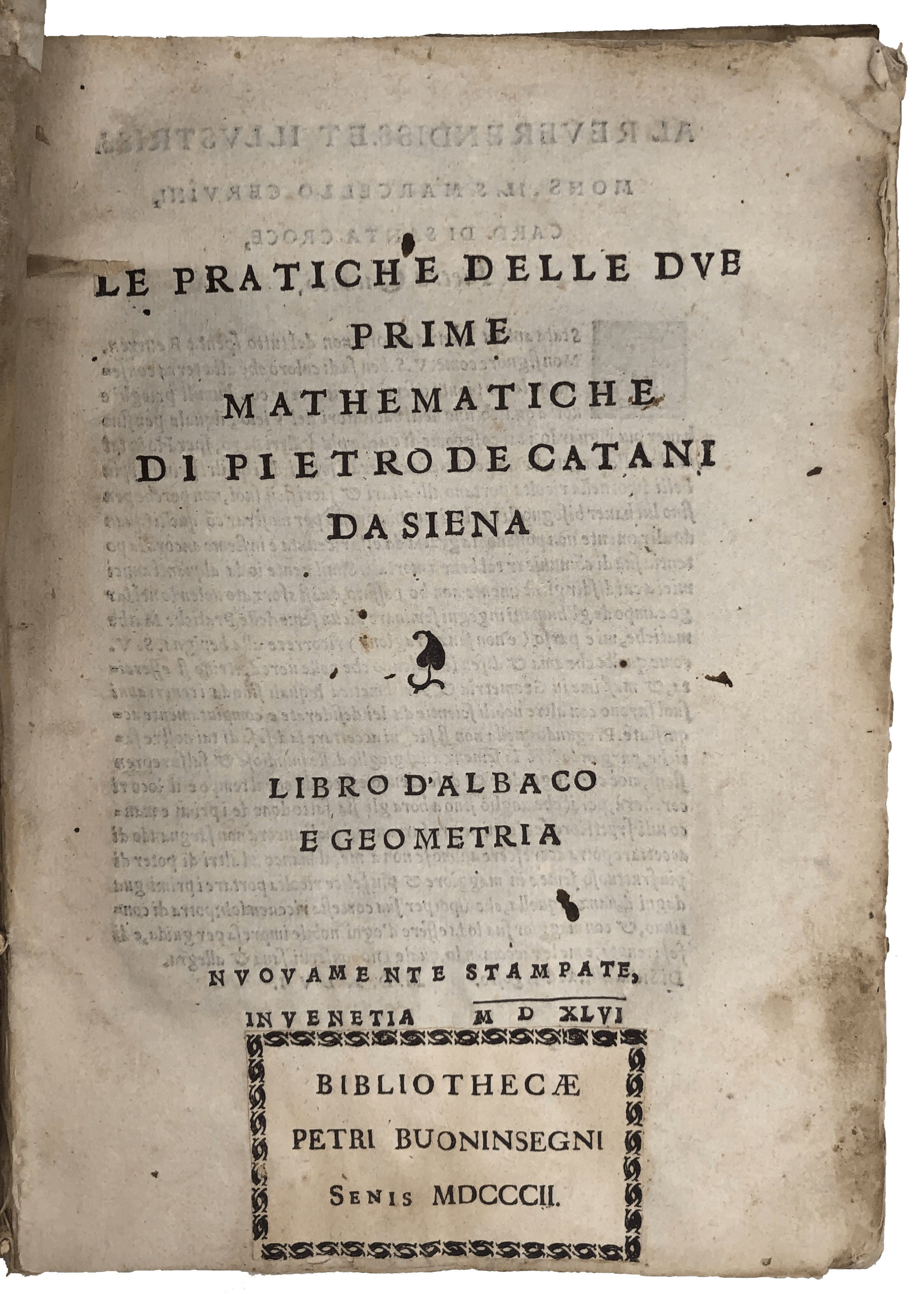 FIRST EDITION. 4to, ff. 64, final blank added for annotation. Italic letter, little Roman. Geometrical diagrams, decorated initials. T-p a bit dusty and frayed at fore-edge, faint waterstain to upper margin in places, little thumbing and marginal spotting, marginal oil stain to few outer corners, extensive slightly later ms. correction and mathematical annotation. A very good copy in contemporary vellum, traces of ties, spine reinforced with C18 patterned paper. Bookplate of Pietro Buoninsegno, Siena, 1802.