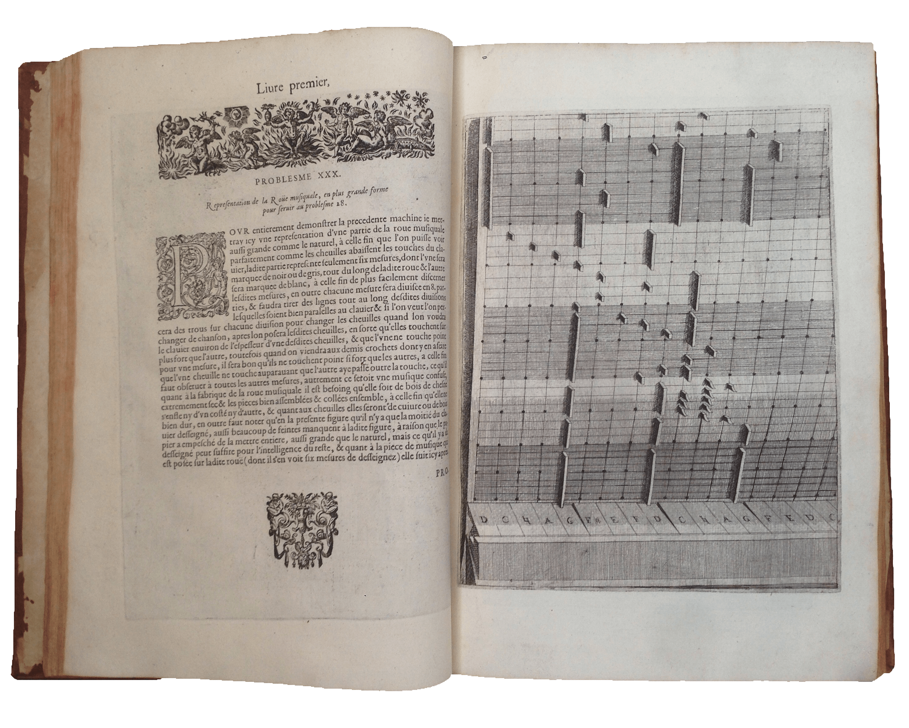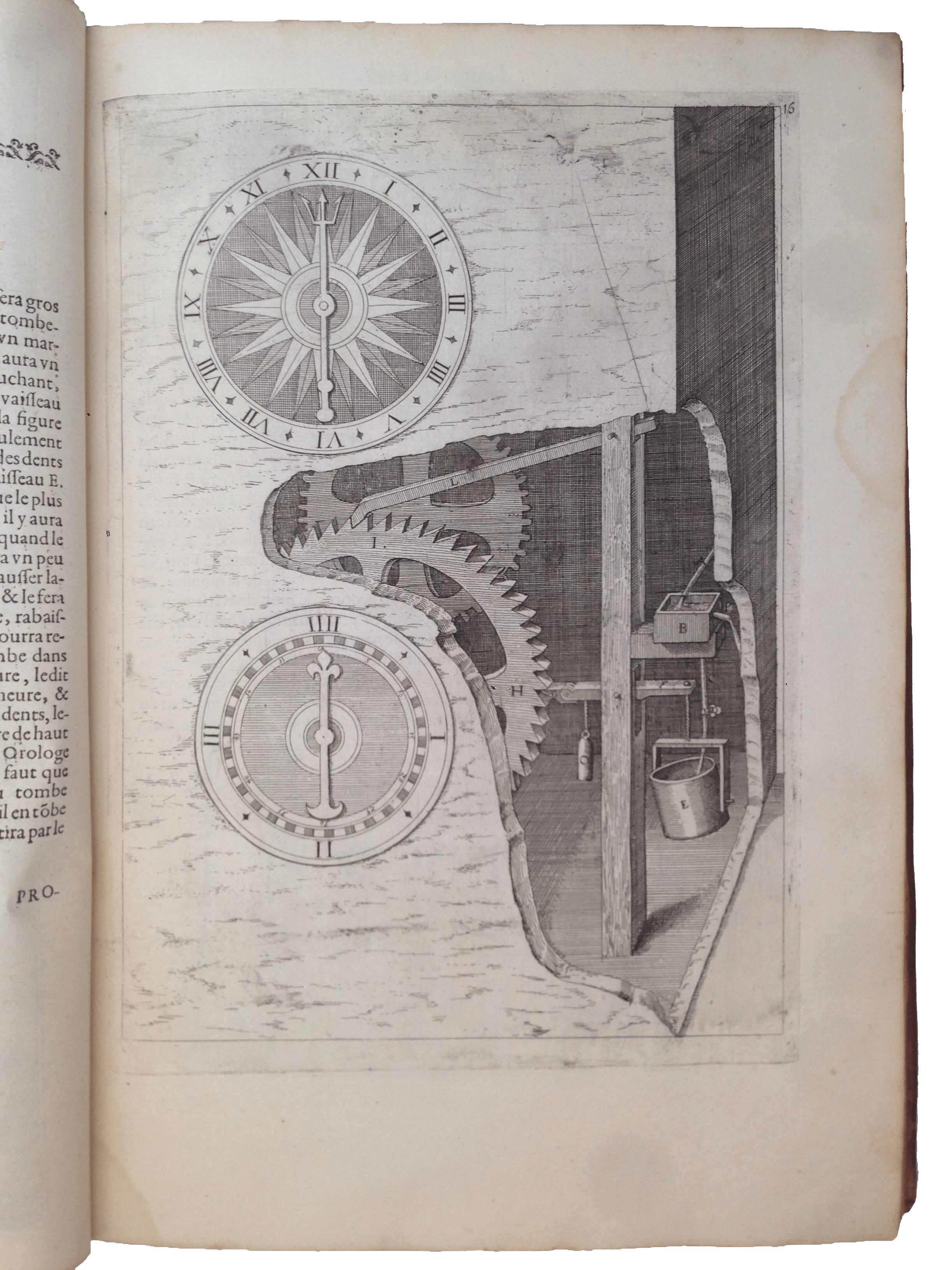 Second edition, enlarged with extra plates, of this beautiful and extravagantly illustrated volume of ingenious hydraulic solutions to engineering problems produced by the Huguenot architect, inventor, garden designer and engineer, Salomon de Caus. The work deals with the physics of movement, with a range of technical applications, encompassing fields as diverse as energy, gardening and music. Book I describes the first machines to be operated by solar power, powered by sunlight striking closed air reservoirs, and one of the earliest uses of steam power. Scholars have proposed that De Caus as an early re-discoverer, or post-Classical inventor, of the principle of steam being used as a propelling force. He was deeply interested in garden design, mechanical fountains and speaking statues, and worked in the service of several great Renaissance princes. His masterpiece was the spectacular garden known as the ‘Hortus Palatinus’ at Frederick’s palace at Heidelberg. “He applied himself at an early age to the study of the mathematical sciences, his favourite writers being Archimedes, Euclid, and Vitruvius. After a visit to Italy he came to England as mathematical tutor to Henry, prince of Wales, and in 1612 published a work entitled ‘La Perspective avec la raison des ombres et Miroirs’; in the dedication of this work to that prince, dated at Richmond, 1 Oct. 1611, he states that he has been two or three years in the service of his royal highness. He seems also to have been employed as drawing-master to the Princess Elizabeth. After the death of the young Prince of Wales, De Caus was, in 1613, employed by the elector palatine, Frederick V, then recently married to the Princess Elizabeth, to lay out the gardens at the castle of Heidelberg…. While at Heidelberg De Caus published in 1615 ‘Institution Harmonique, ..’ In the dedication of this work to Anne, queen of Great Britain, dated 15 Sept. 1614, he says that his experiments in the mechanical powers of water were commenced while in the service of the late Prince of Wales. In the same year, 1615, he published his most important work, ‘Les Raisons des Forces Mouvantes avec diverses Machines.’ This work is divided into three parts, all copiously illustrated: I. ‘Les Théorèmes et Problèmes des Forces Mouvantes;’ II. ‘Des Grotes et Fontaines pour l’ornement des Maisons de Plaisance et Jardins;’ III. ‘De la Fabrique des Orgues.’ The second part contains, as he himself says in the dedication to Princess Elizabeth, many designs formerly made at Richmond for the adornment of the palace, or the entertainment of his master, the Prince of Wales. In the first part occur his enunciations of the theorems of the expansion and condensation of steam, and of the elevation of water by the application of heat, which have gained for him in some quarters the honour of being the first inventor of the steam engine, though De Caus seems only to have utilised them for fountains and other waterworks and claims no originality. It is almost certain that Edward Somerset, second marquis of Worcester, to whom this honour has also been ascribed, and later engineers, knew and developed the principles enunciated by De Caus.” DNB.