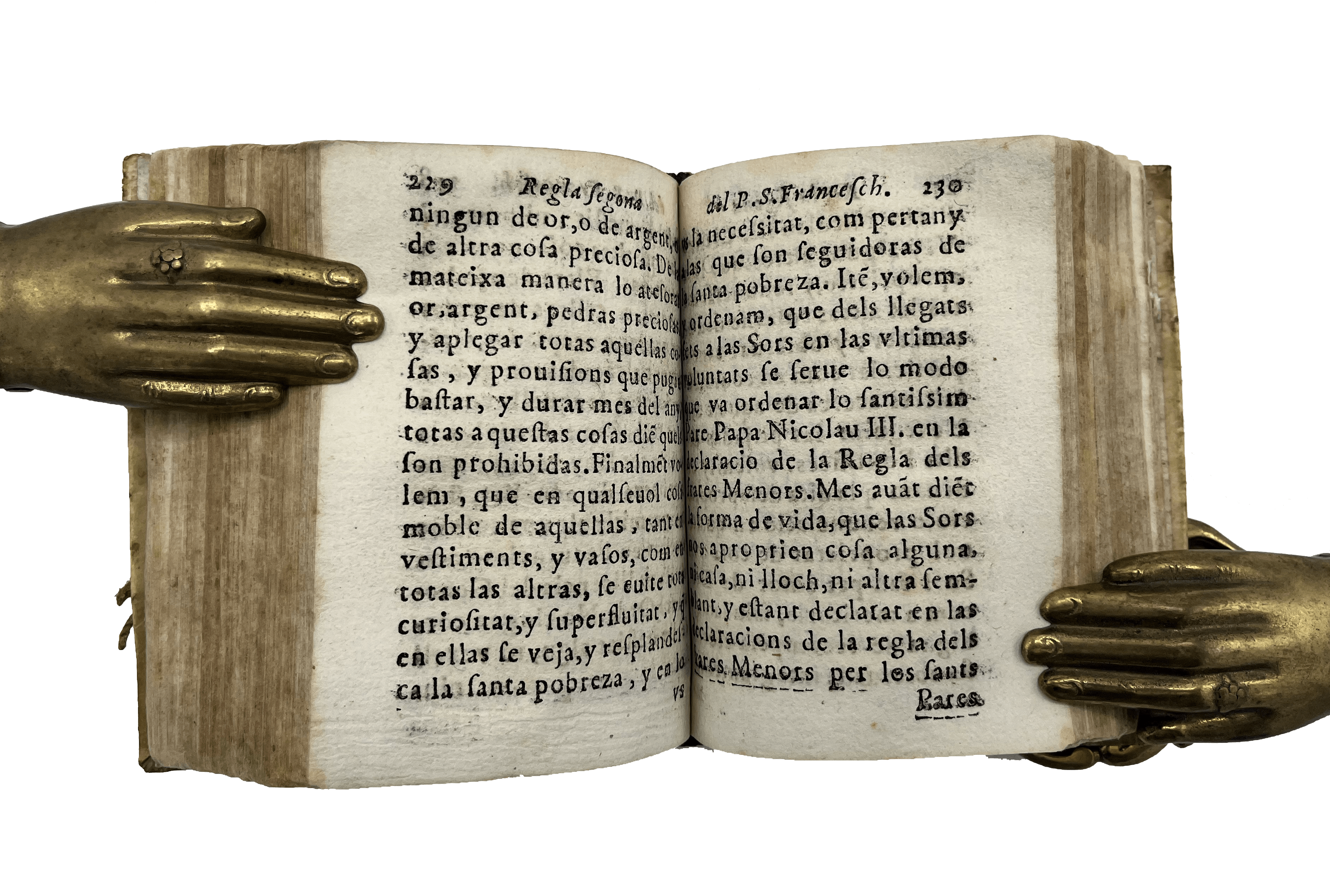 Aimed at a Franciscan Capuchin community of nuns known as Poor Clares, this book contains the Franciscan rule as communicated to Saint Clare or Chiara of Assisi, and written by her, and so begins with her testament and rule, covering the election of abbesses, the practice of poverty and observance of silence, work, visitation, etc. There follows the main rule of St. Francis, covering habits and dress, abstinence, confession, enclosure, discipline and obedience, hours of sleep and eating, etc. The divine offices of the day are also described in detail, with prayers and orders of services to be used. Also contained here are a papal bull and apostolic letters by Clement VIII and Paul V confirming the monastery’s authority.