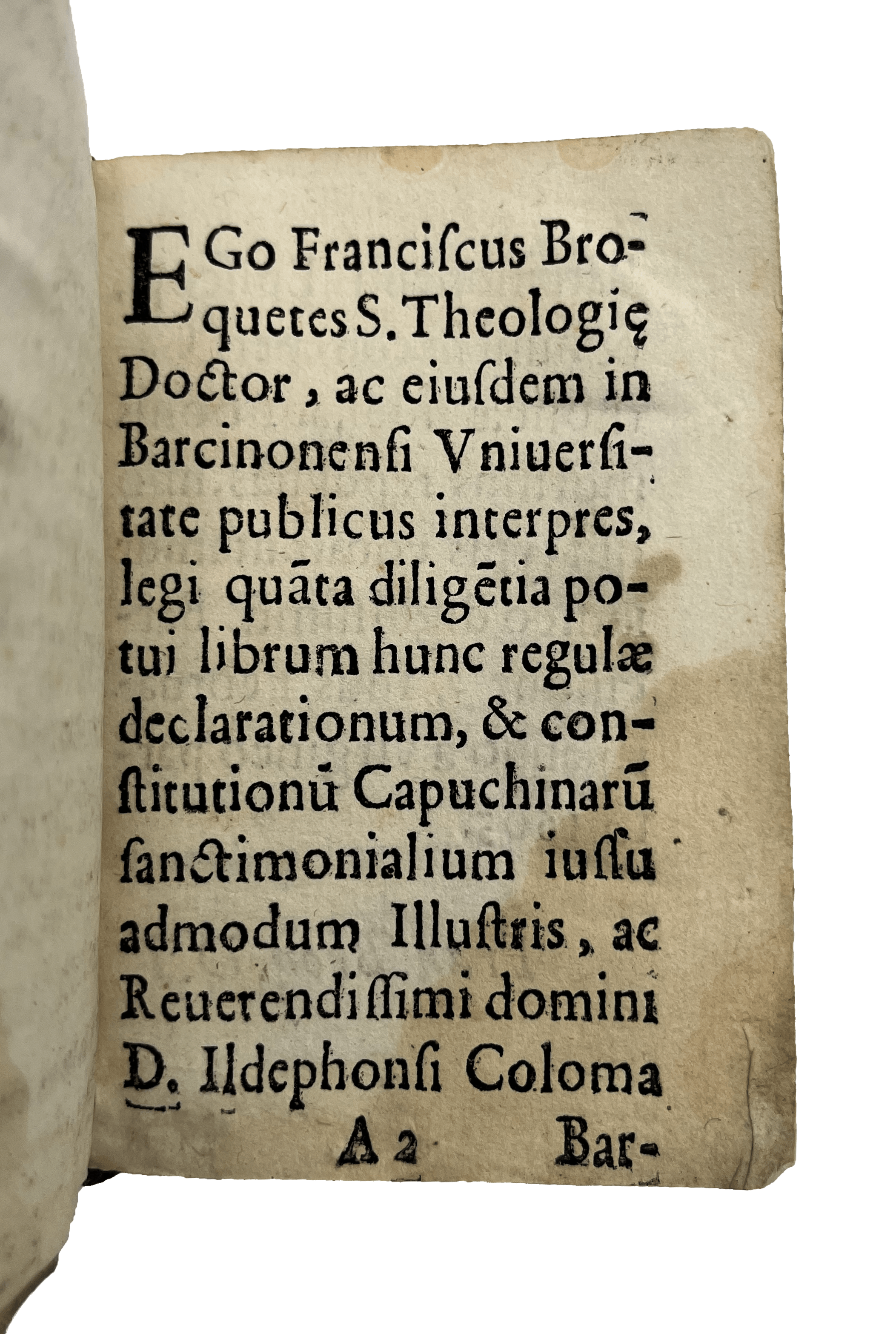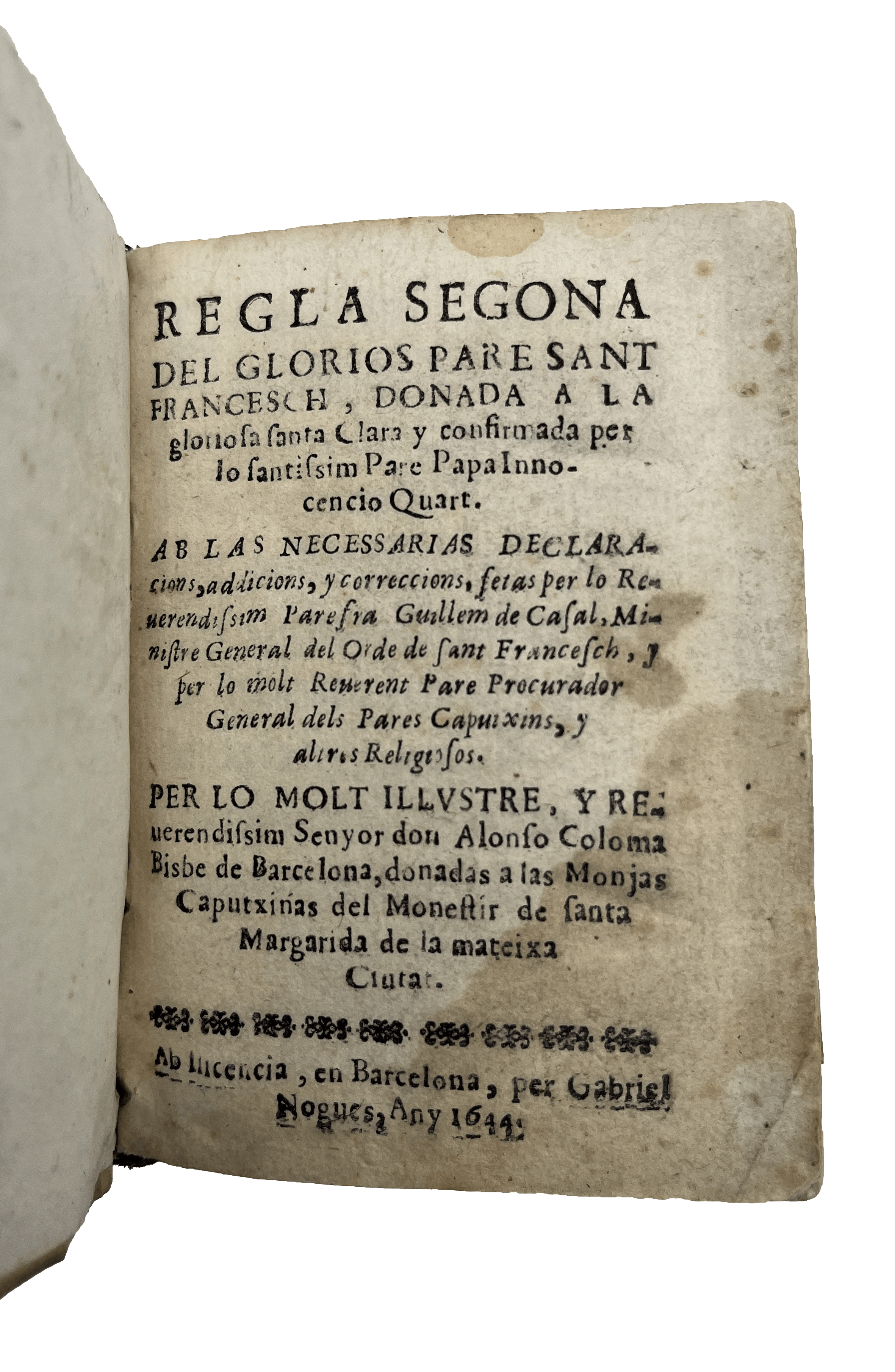 Rare third edition, first published 1604, of this extremely scarce spiritual guide to the Franciscan rule in Catalan, written for the Capuchin community of Poor Clares of the Monastery of Santa Margarida la Reial in Barcelona. The author, who also went by Ildefons de Coloma i Melo, was Bishop of Barcelona and Cartagena. The son of a Catalan poet, Joan Coloma, Alonso also produced poetry in Latin and Catalan.
