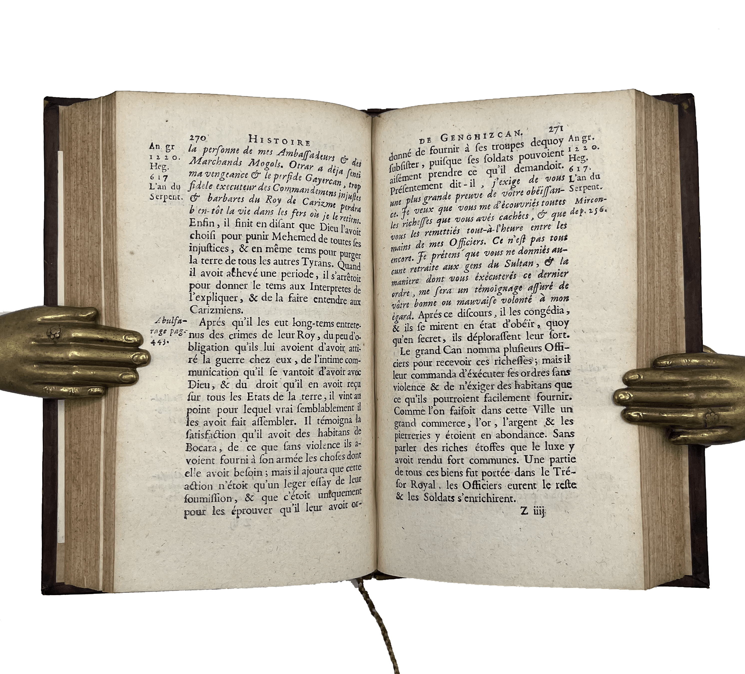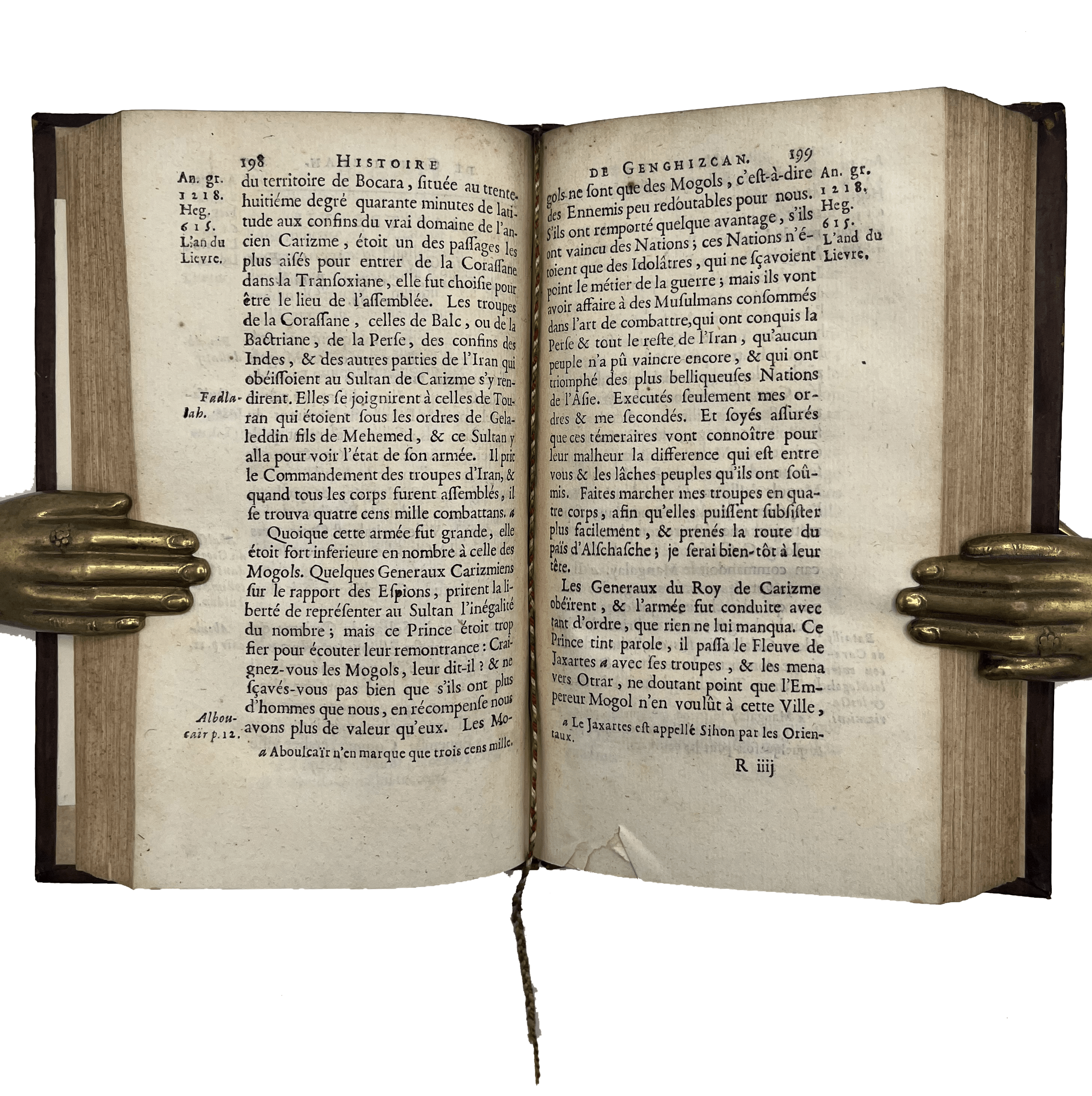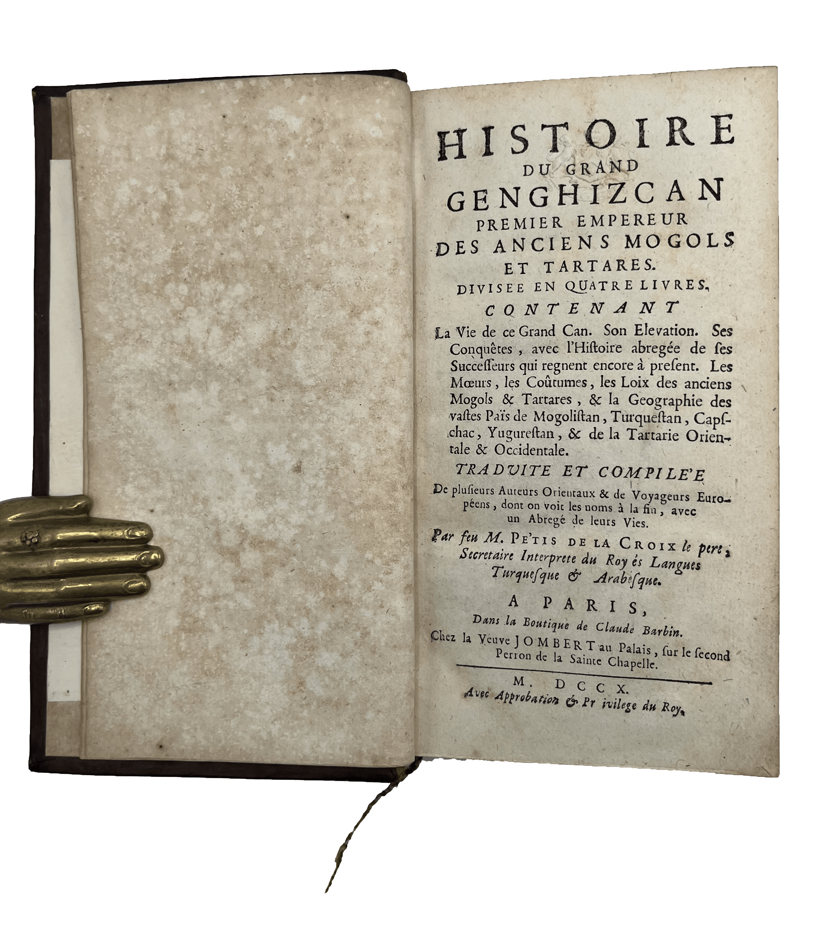 First edition of this French history of the rise, conquests, and succession of the great medieval Mongol emperor Genghis Kahn, conqueror of China, Central Asia and much of Europe, and creator of the Mongol Empire, in which the French orientalist and Arabist De la Croix (1653-1713) describes Mongol and Tartar costume, customs and laws, as well as the geography of Central Asia. De la Croix translated and compiled his history from Arabic accounts mostly by Turkish authors and from European authors, both medieval and modern, whose travel accounts and works are said to prove and verify the facts in De la Croix’s history. In several cases De la Croix provides the shelfmarks of manuscripts in the French Royal Library or gives the dates of the printed edition that he was using. A bibliography of De la Croix’s sources, with biographies, concludes the volume.