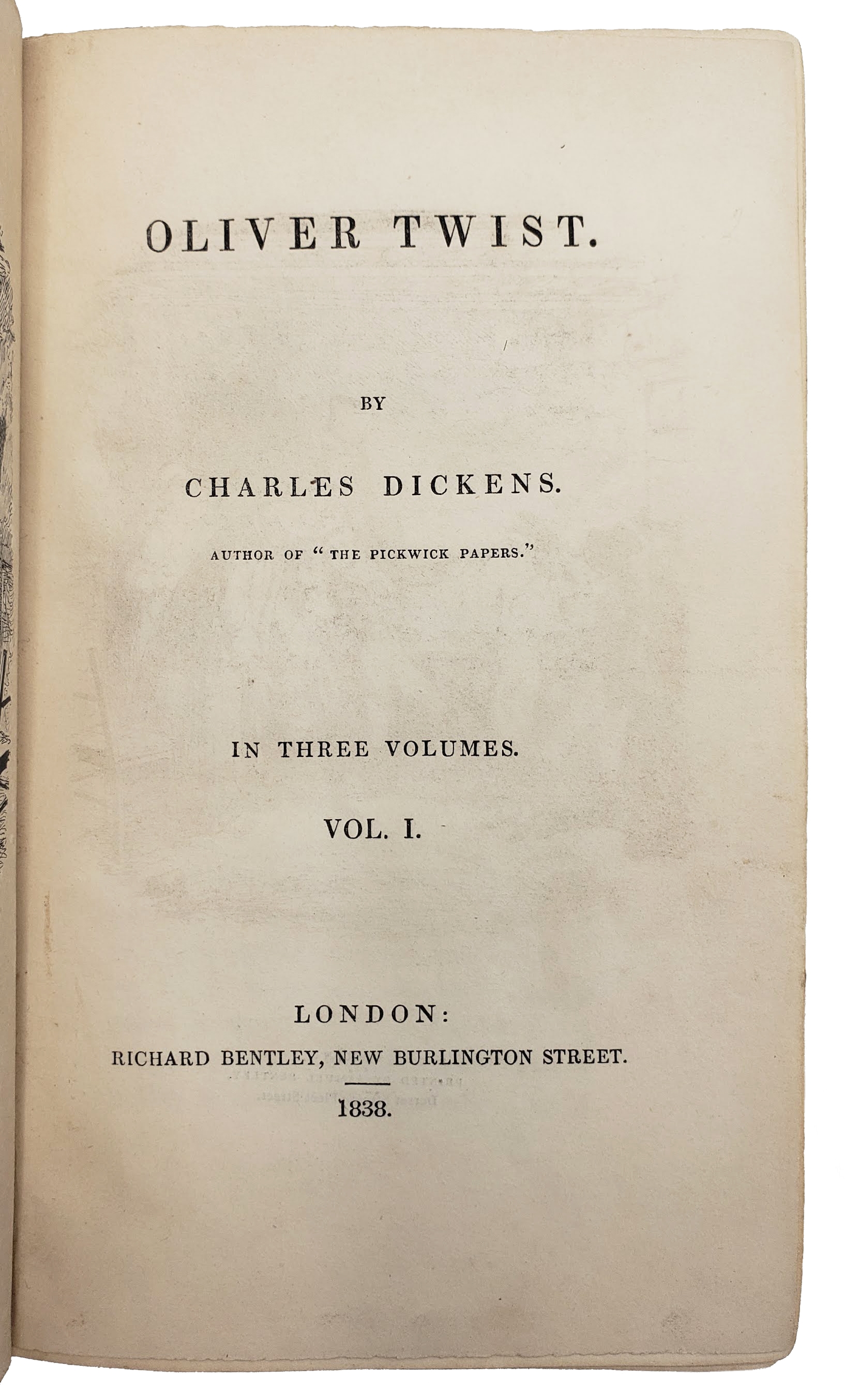 8vo. Three volumes. Pp. 331; 307; 315, with advertisements, illustrated. Original publisher’s cloth with spine title: “Oliver Twist. Boz. Vol I [III]. London. Bentley.” Clean and well preserved, largely untrimmed, minor spine repair, in box.