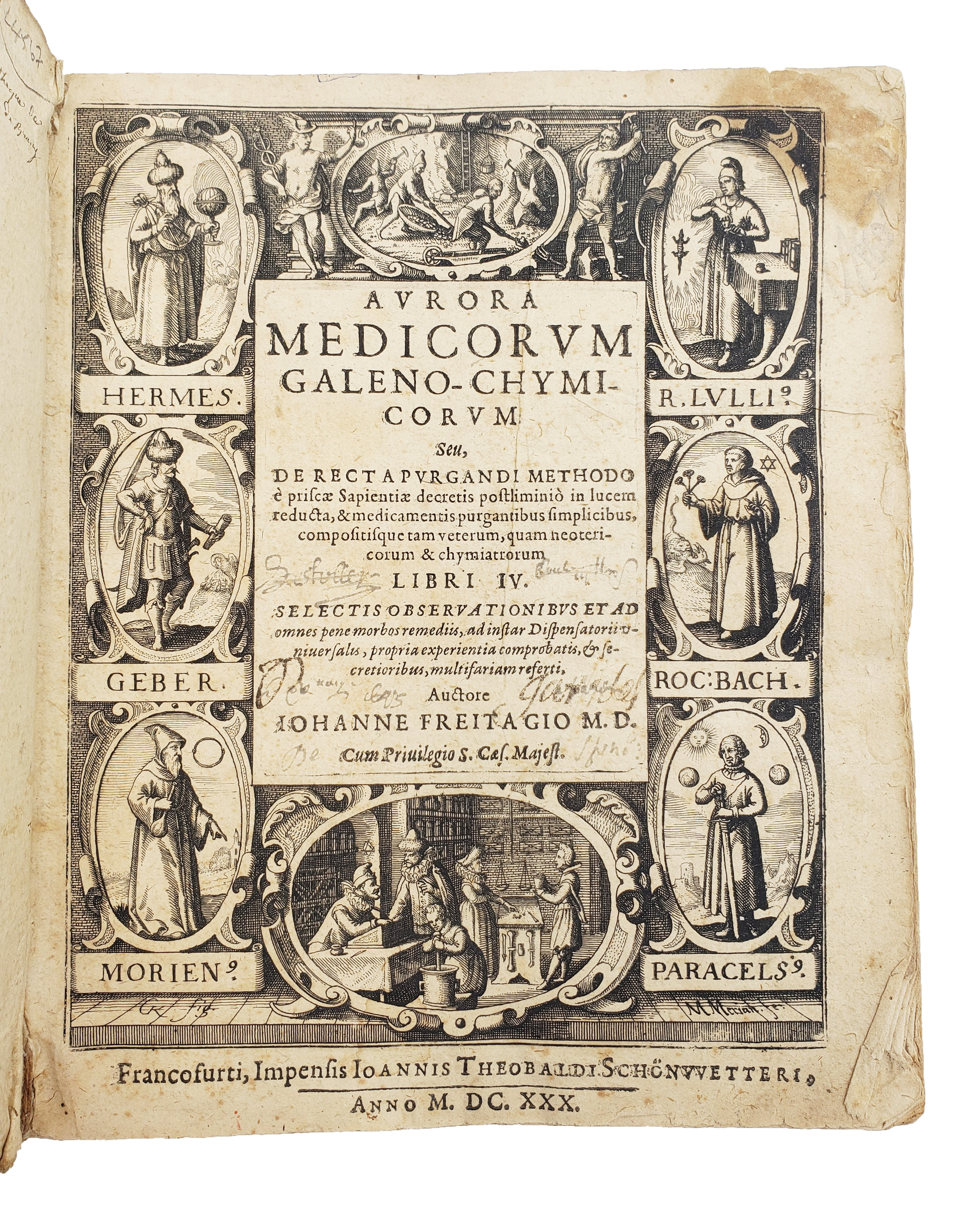 FIRST EDITION. 4to. pp. (xvi) 642 (xxx), wanting final blank. Roman letter. Engraved t-p by Matthäus Merian the Elder depicting famous alchemists and proponents of chemical medicine, including Paracelsus, miners at work and an apothecary’s shop. Woodcut initials, head- and tailpieces, typographical headpieces. Small repair to verso of t-p at upper corner, offsetting. Paper flaw to Ll2 affecting one word and side note. Single small wormhole to inner margin and gutter beginning Xxx4, wormtrack from Ffff, mostly marginal but affecting a few words and sidenotes, wormtrack to upper margin of quire Bbbb, affecting running header. Some ll. browned, some spotting and oxydisation (very poor quality paper), the odd ink or oil stain. A perfectly reasonable copy in original vellum, sprinkled edges, contemp. ms. geometrical diagram to upper cover. Autograph to t-p, ‘De stuller(?),’ another in a different hand dated 1695, C18 autographs to t-p and front pastedown of ‘P. (?) Garidel,’ possibly the French botanist Pierre Joseph Garidel (1658-1737), late C18 or early C19 inscription to front pastedown, ‘Bibliothèque de M. le Baron de Bruny,’ almost certainly Jean-Baptiste Jérôme Bruny, Baron de la Tour d’Aigues (1725-95)’ with (sale?) number. Occasional contemp. ms. marginal marks and manicules.