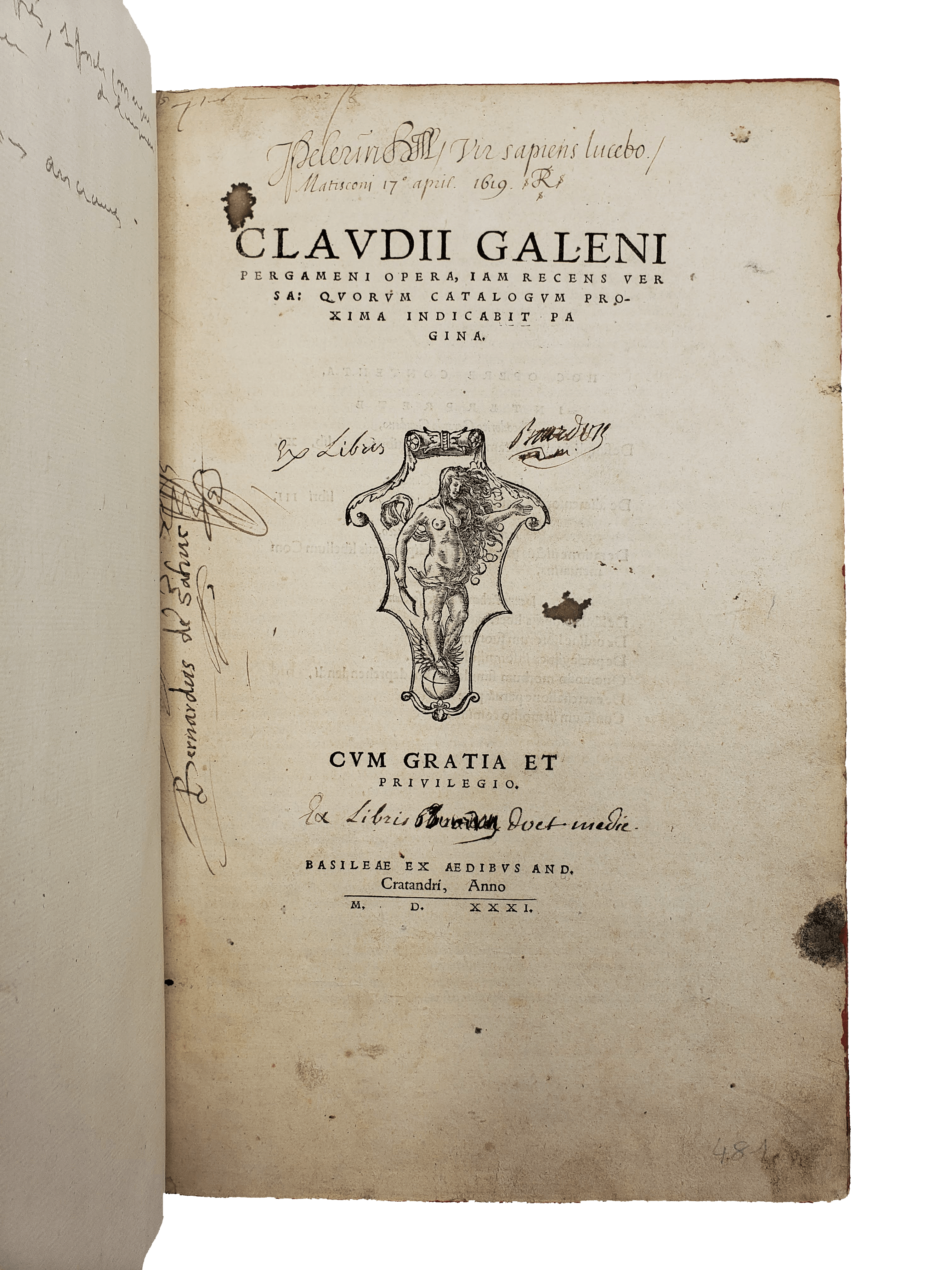 A scarce early edition of Galen’s works, including unusual ones like his auto-bibliographies, with numerous early annotations. The titlepage autographs indicate continuous medical use from the C16 to the beginning of the C19.