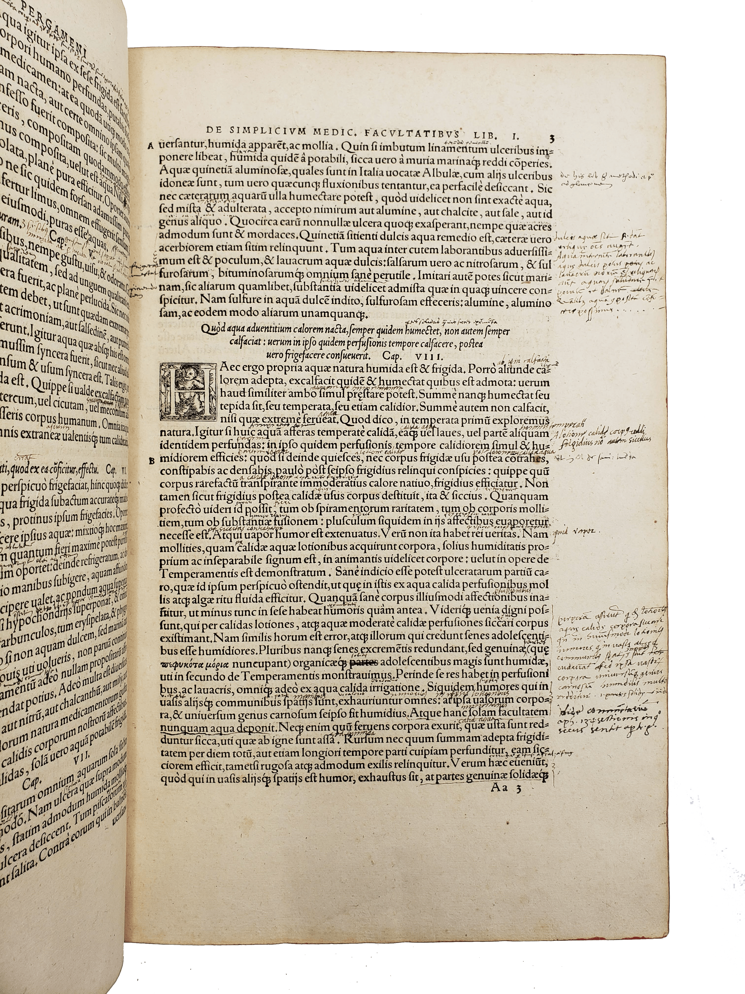 Folio. ff. [6], 172 [i.e., 171], [1]. Roman letter, little Italic or Greek. Woodcut printer’s device to title and last recto, decorated initials. Uniform very light browning, title margins a little dusty, marginal ink splash to Ii6, last leaf with printer’s device mounted on blank verso. A good copy in late C17 sheep, gilt label to spine, a.e.r. C16 ms autograph ‘Bernardus de Sahuc’, ms ‘Pelerin (?) / Vir sapiens lucebo / Matisconi [Macôn] 17 April 1619 R’, and two later ms ex-libris to title (both doctors), extensive marginal ms annotations in at least two C16 hands.