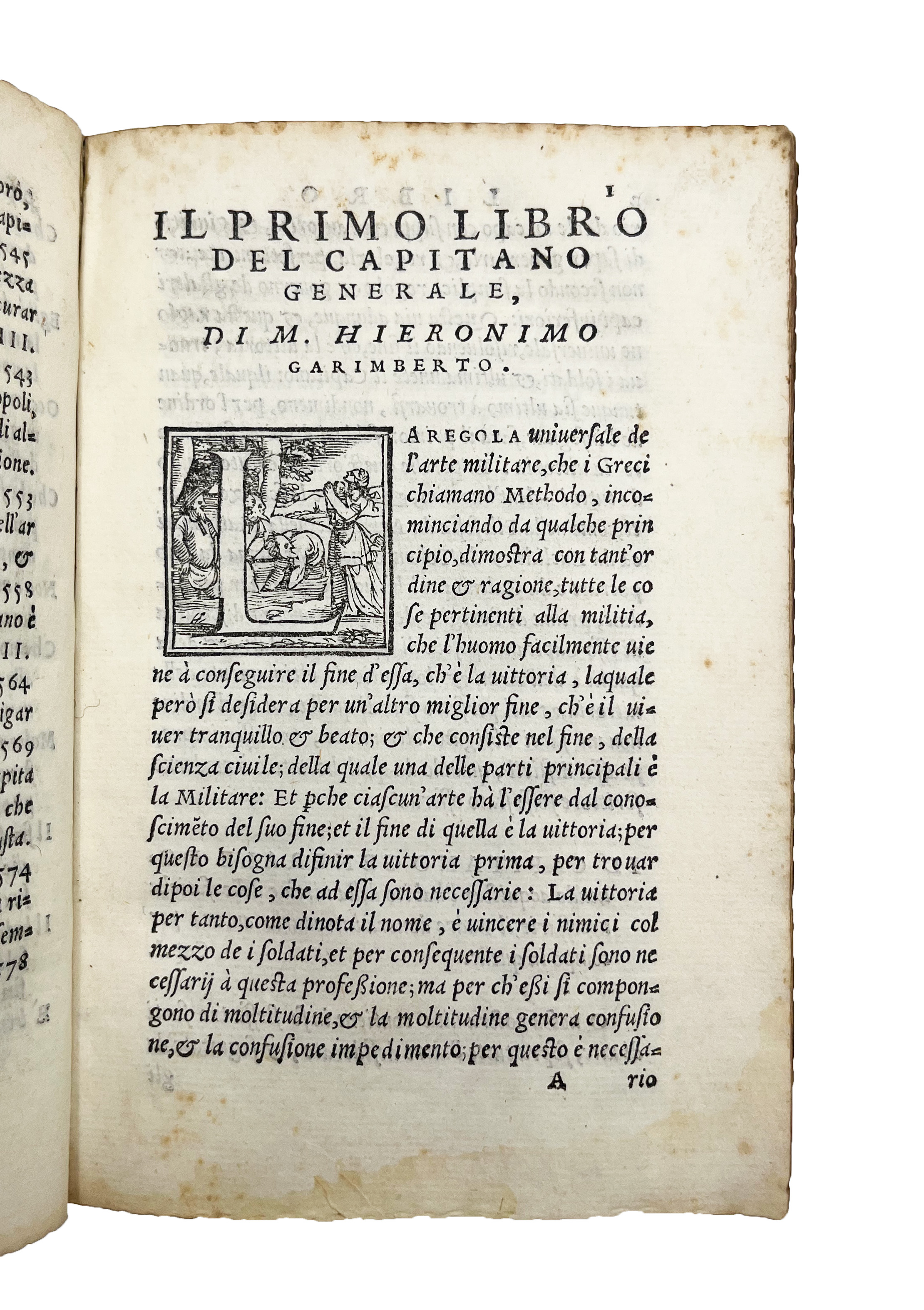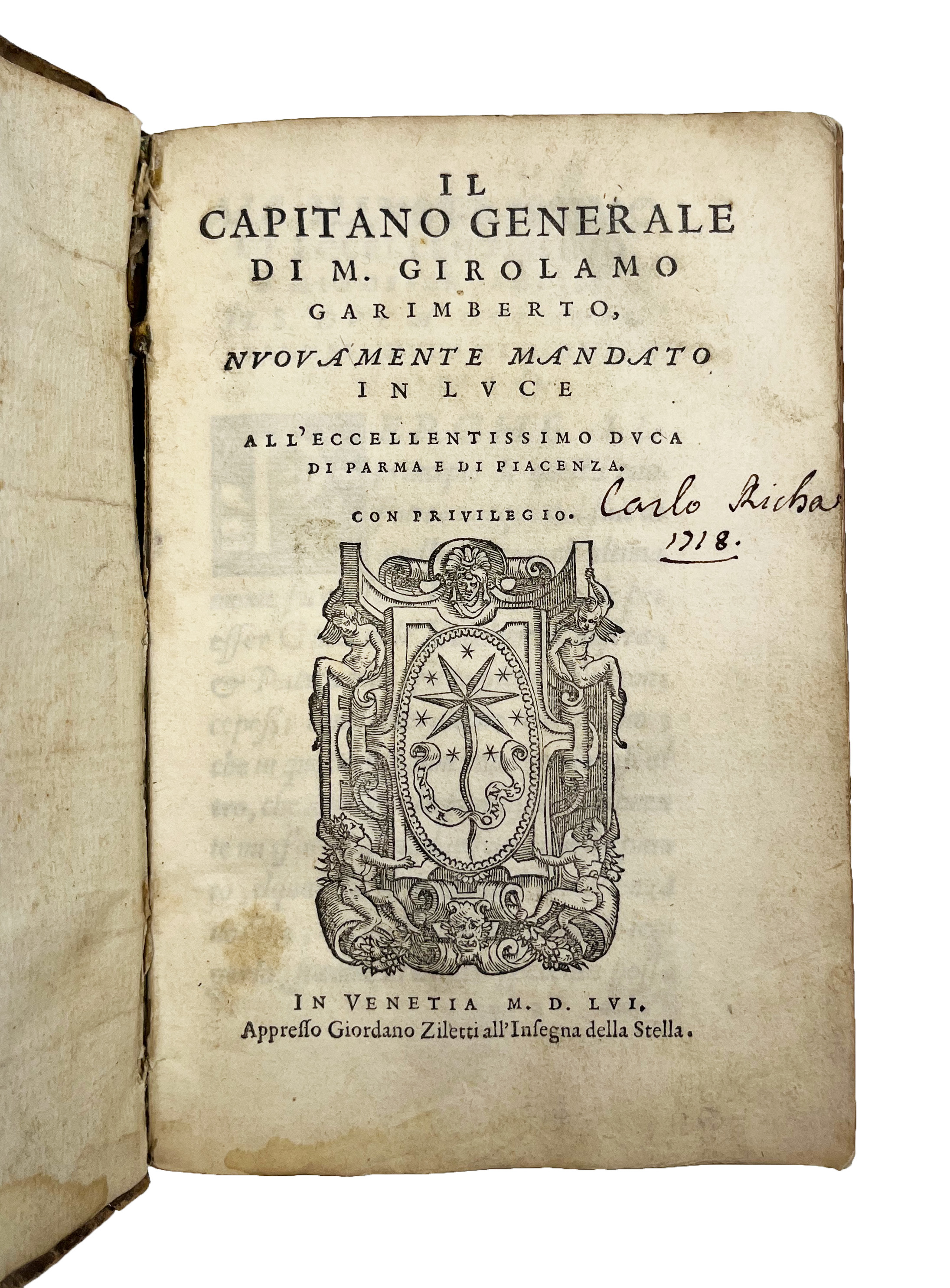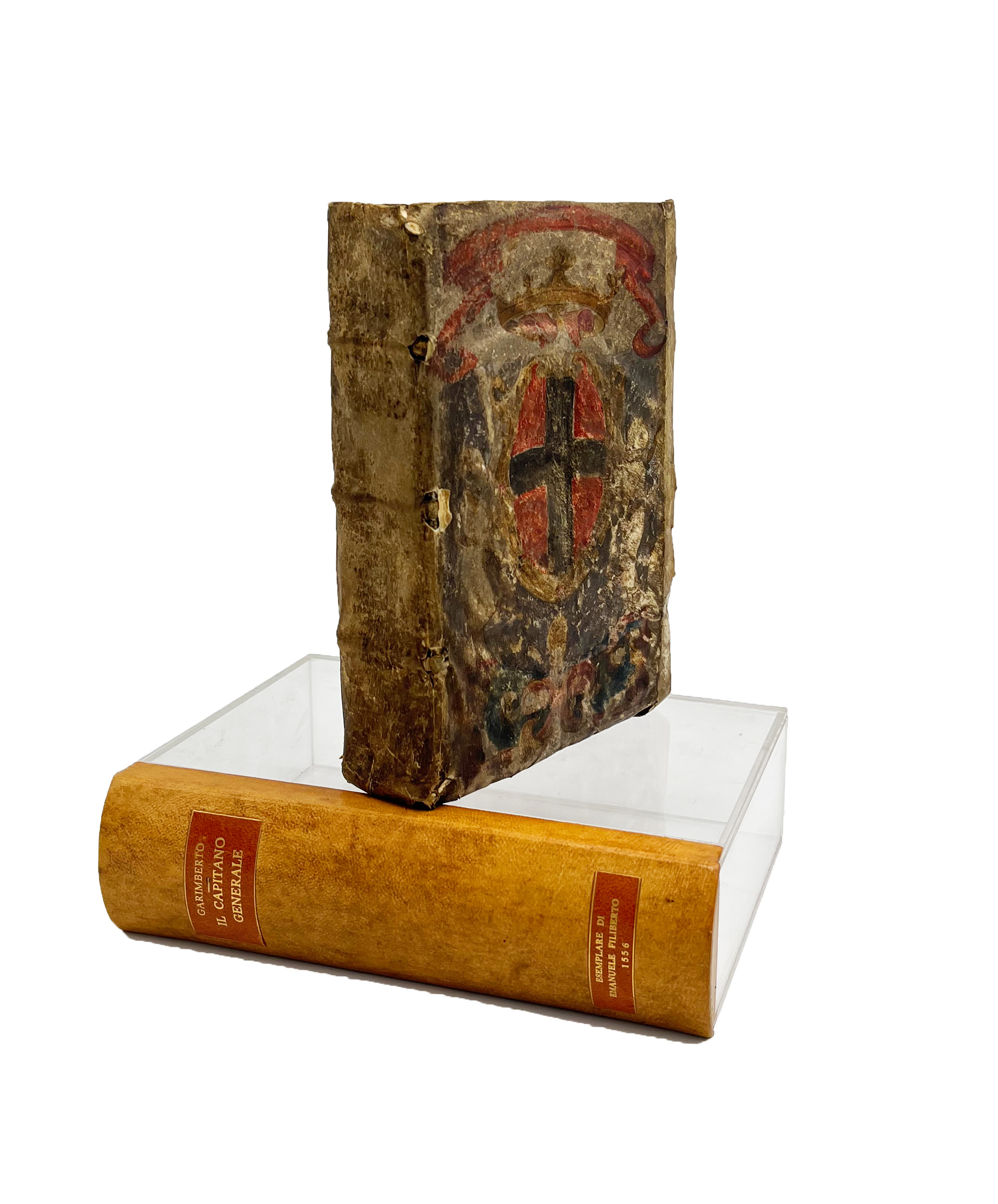 First edition of Garimberto’ s important treatise on the art of warfare with the splendid and most appropriate provenance of Emanuele Filiberto, Duke of Savoy, and a particularly rare example of a painted binding with the Duke’s arms; a few examples are at the Bibliotheque Nationale; none, it appears, in Turin, or elsewhere in Italy. On the death of his brother Louis (1536), Emanuele Filiberto became successor to the throne of Savoy. He inherited in 1553, an almost empty honour, as the vast majority of his hereditary lands had been occupied and administered by the French since 1536. He started a most distinguished military career in 1543 when he entered the service of his uncle Charles V, with the aim of recovering his Duchy, and took part in the imperial victories in Ingolstadt (1546) and Mühlberg (1547). He later joined his cousin Philip II in Spain participating in the defence of Barcelona from French maritime attack in 1551 and he served with Ferrante Gonzaga in the guerrilla war between the Spanish and French in Piedmont. He was also a suitor to the future Queen Elizabeth I. In 1553 he was appointed lieutenant-general and supreme commander of the Spanish army in Flanders, and in 1556 governor of the Netherlands. In 1557 he won a decisive and brilliant victory against the French troops led by Anne de Montmorency and Gaspard de Coligny. In the subsequent Treaty of Cateau-Cambresis (1559) Emanuele Filiberto was rewarded with the return of his estates. The peace was sealed by his marriage to Margaret, daughter of Francis I. A skilled political strategist, he took advantage of various squabbles in Europe to slowly regain territory from both the French and the Spanish, including the city of Turin which he made the capital of his new Kingdom. He is considered one of the chief founders of the state of Savoy.