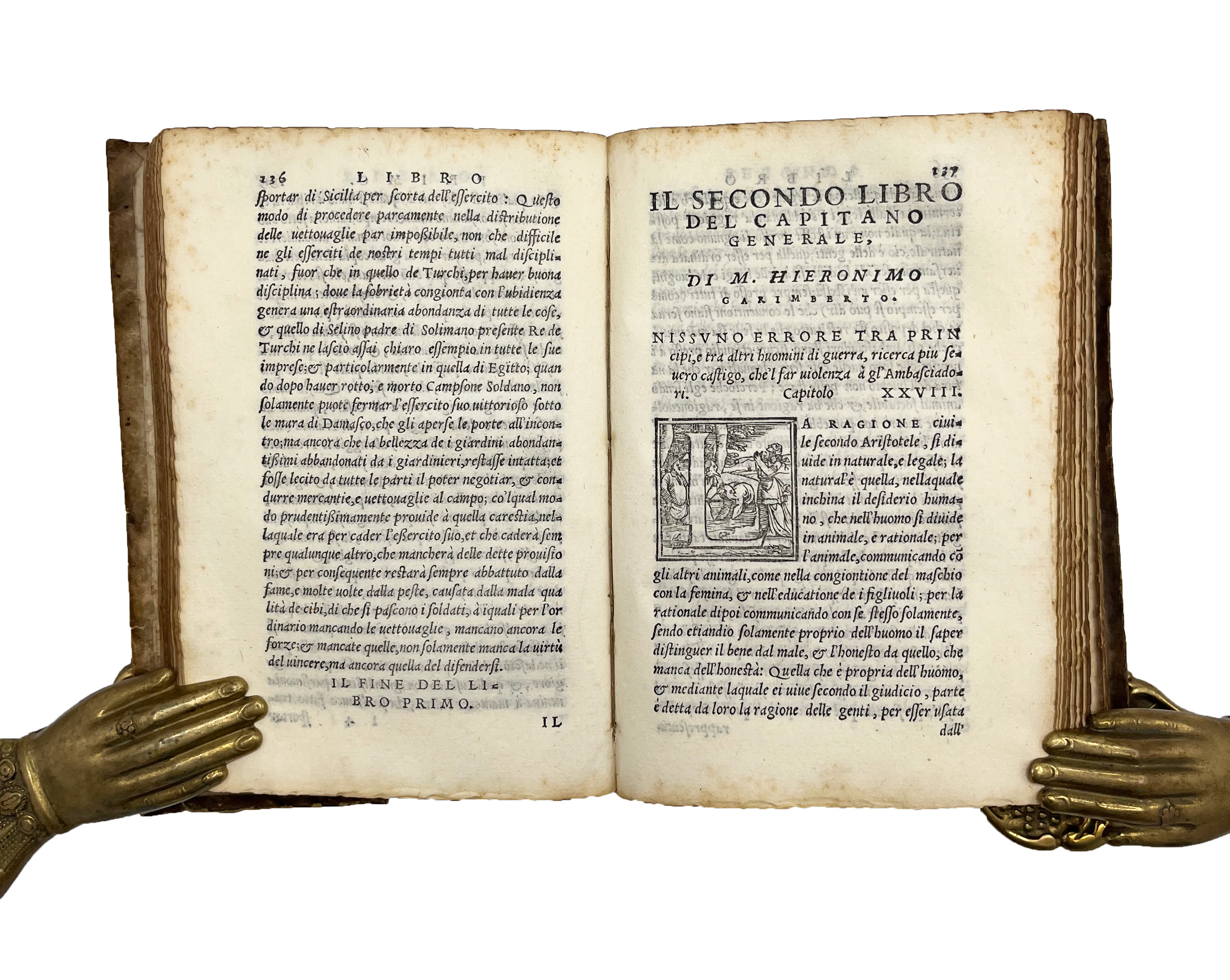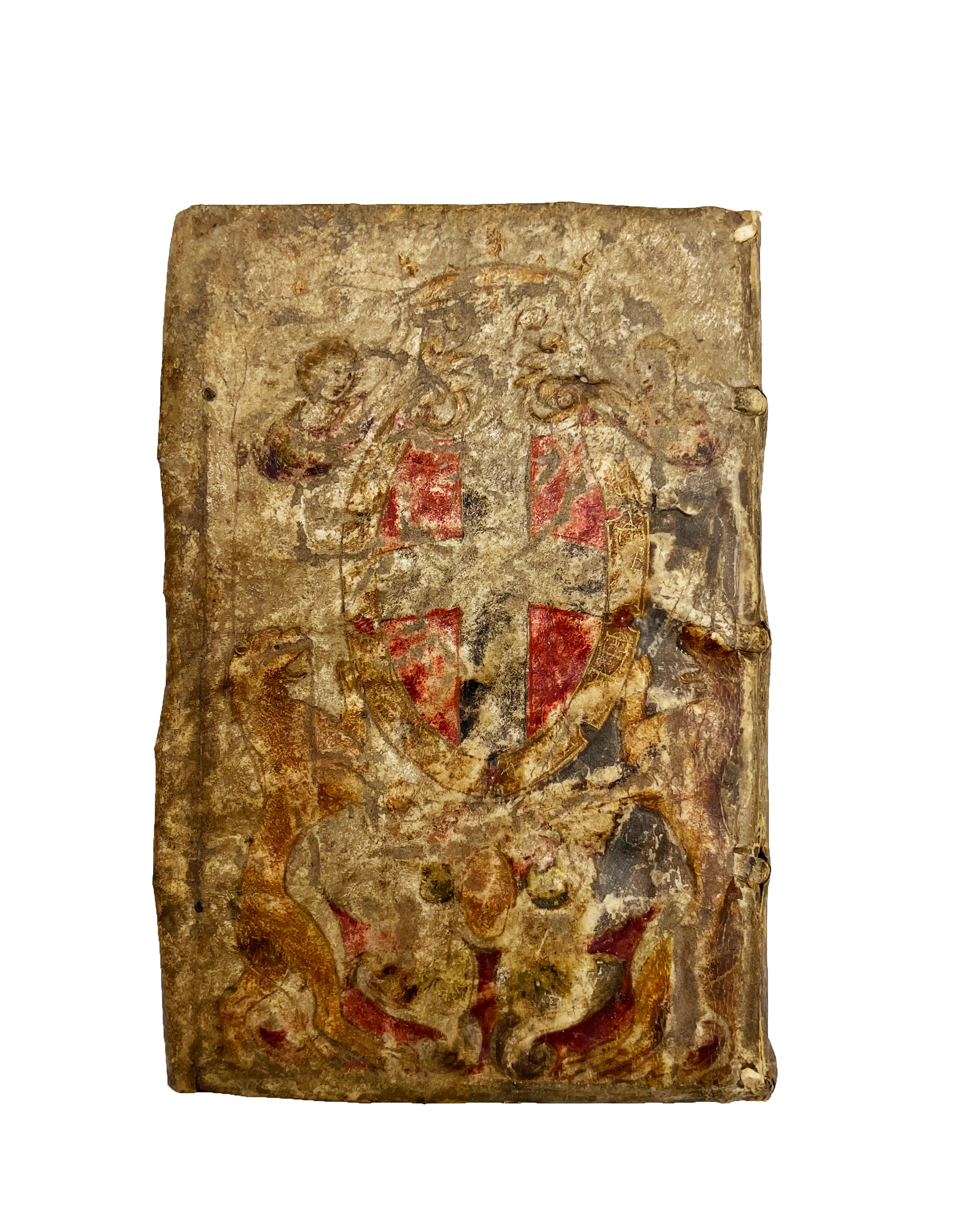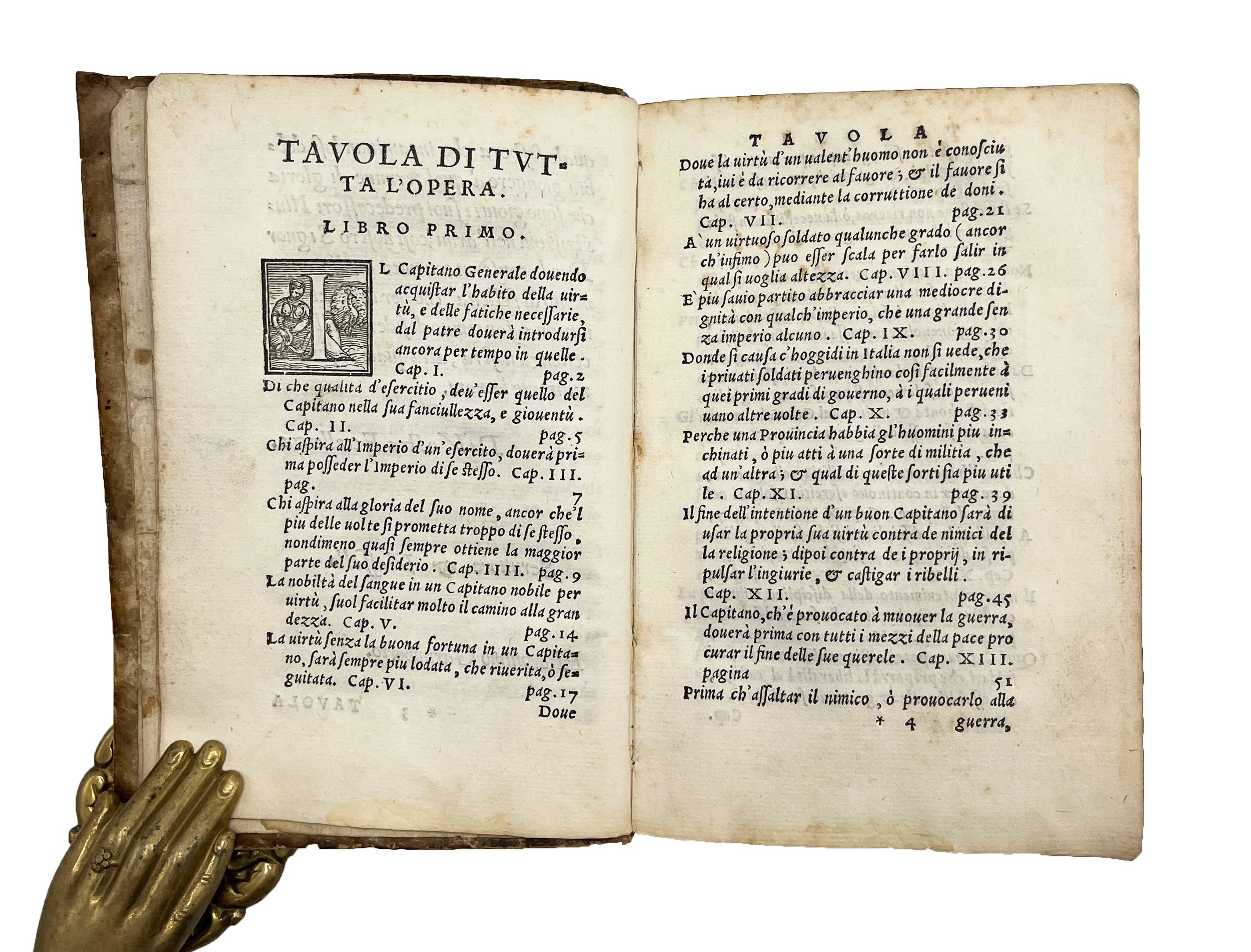First edition of Garimberto’ s important treatise on the art of warfare with the splendid and most appropriate provenance of Emanuele Filiberto, Duke of Savoy, and a particularly rare example of a painted binding with the Duke’s arms; a few examples are at the Bibliotheque Nationale; none, it appears, in Turin, or elsewhere in Italy. On the death of his brother Louis (1536), Emanuele Filiberto became successor to the throne of Savoy. He inherited in 1553, an almost empty honour, as the vast majority of his hereditary lands had been occupied and administered by the French since 1536. He started a most distinguished military career in 1543 when he entered the service of his uncle Charles V, with the aim of recovering his Duchy, and took part in the imperial victories in Ingolstadt (1546) and Mühlberg (1547). He later joined his cousin Philip II in Spain participating in the defence of Barcelona from French maritime attack in 1551 and he served with Ferrante Gonzaga in the guerrilla war between the Spanish and French in Piedmont. He was also a suitor to the future Queen Elizabeth I. In 1553 he was appointed lieutenant-general and supreme commander of the Spanish army in Flanders, and in 1556 governor of the Netherlands. In 1557 he won a decisive and brilliant victory against the French troops led by Anne de Montmorency and Gaspard de Coligny. In the subsequent Treaty of Cateau-Cambresis (1559) Emanuele Filiberto was rewarded with the return of his estates. The peace was sealed by his marriage to Margaret, daughter of Francis I. A skilled political strategist, he took advantage of various squabbles in Europe to slowly regain territory from both the French and the Spanish, including the city of Turin which he made the capital of his new Kingdom. He is considered one of the chief founders of the state of Savoy.