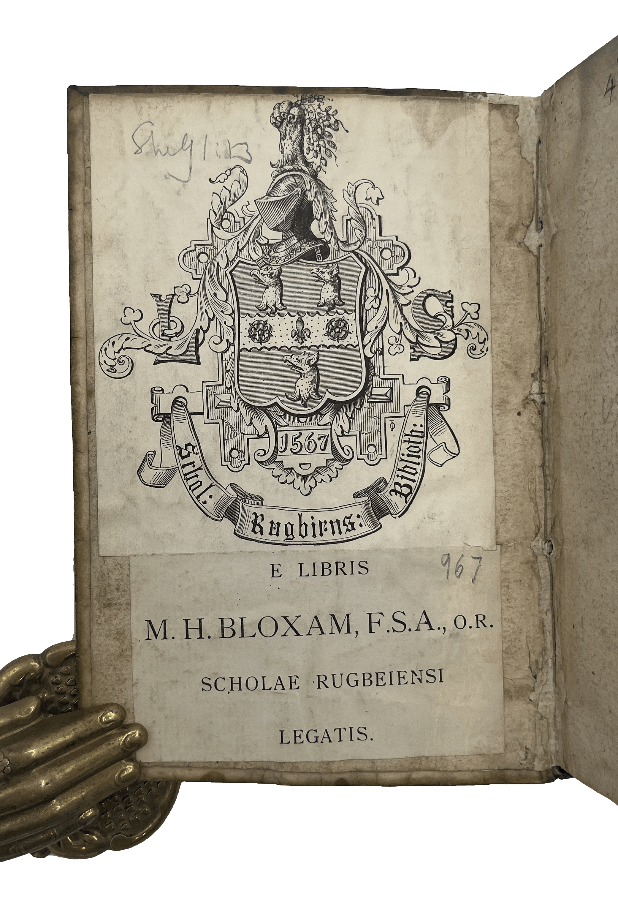 FIRST EDITIONS. 8vo. pp. (88); (vi) 162. Roman letter. Woodcut initials. T-p of first work with C17 inscriptions, one trimmed and another crossed through, ex libris of John Disney, Lincoln, 1717, ffep with contents, price note 1691 and inscription of Matthew H. Bloxham, his C19 bookplate and donation label to Rugby School to front pastedown. Woodcut decoration to t-p of second work, a little dusty and with smudging, not affecting text, single small wormhole to first few ll. affecting a few letters, very light waterstain to blank outer margin of last few ll., slight paper browning, especially to second work, but very good copies in late C16 or early C17 vellum, slightly soiled.