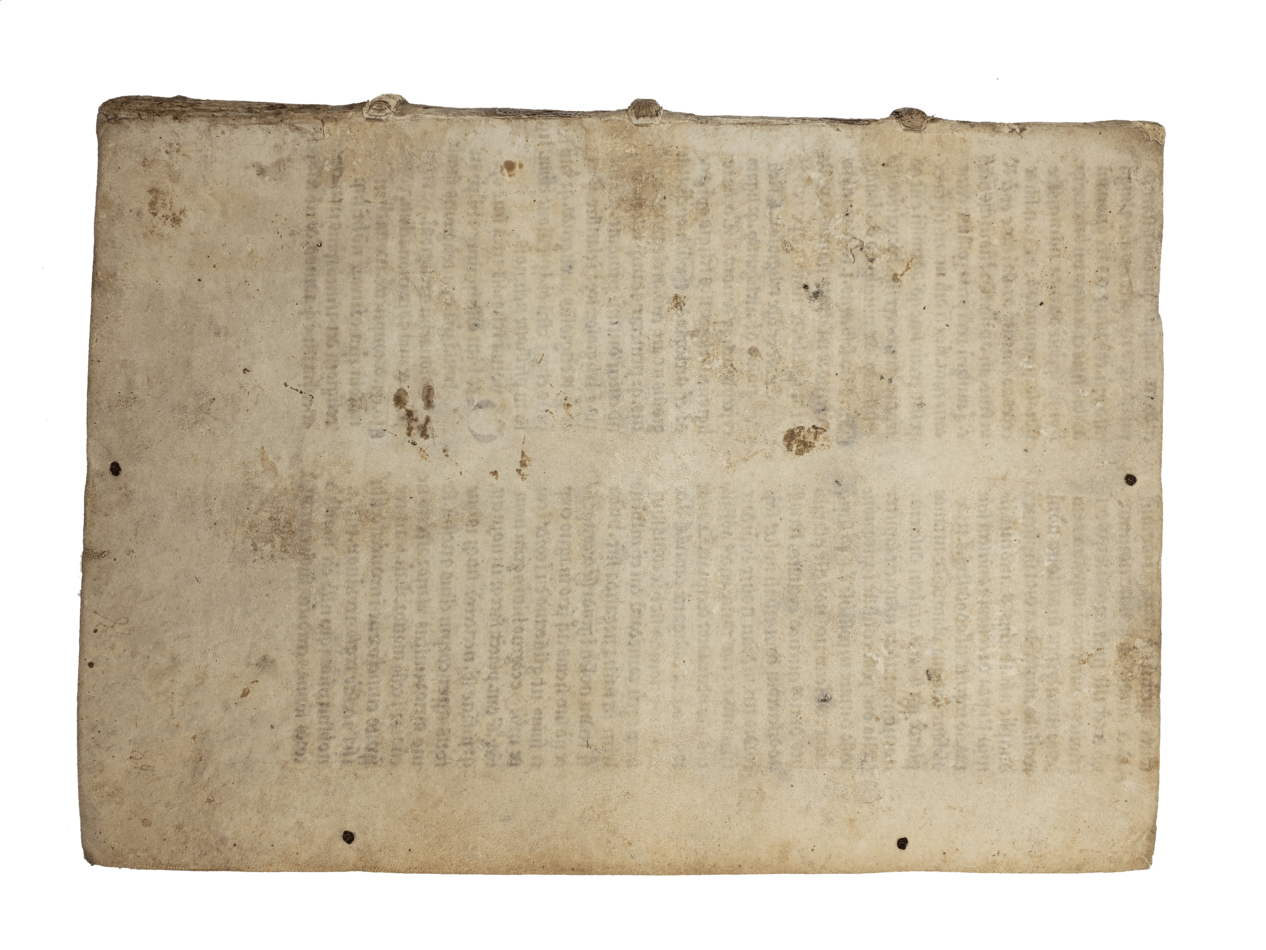 An interesting, genuine example of inexpensive mid-C16 binding, obtained from a C15 ms bifolium, reversed to hide the text and with the gutter positioned over the spine to provide blank space for the ms title. The slotted spine and band covers are ‘an entirely Italian phenomenon, probably northern Italian’ (see Ligatus). This binding also testifies to the evolution of storage methods during the C16: the various ms titles show this book was stored both horizontally and vertically, with the spine or lower edge facing the viewer.