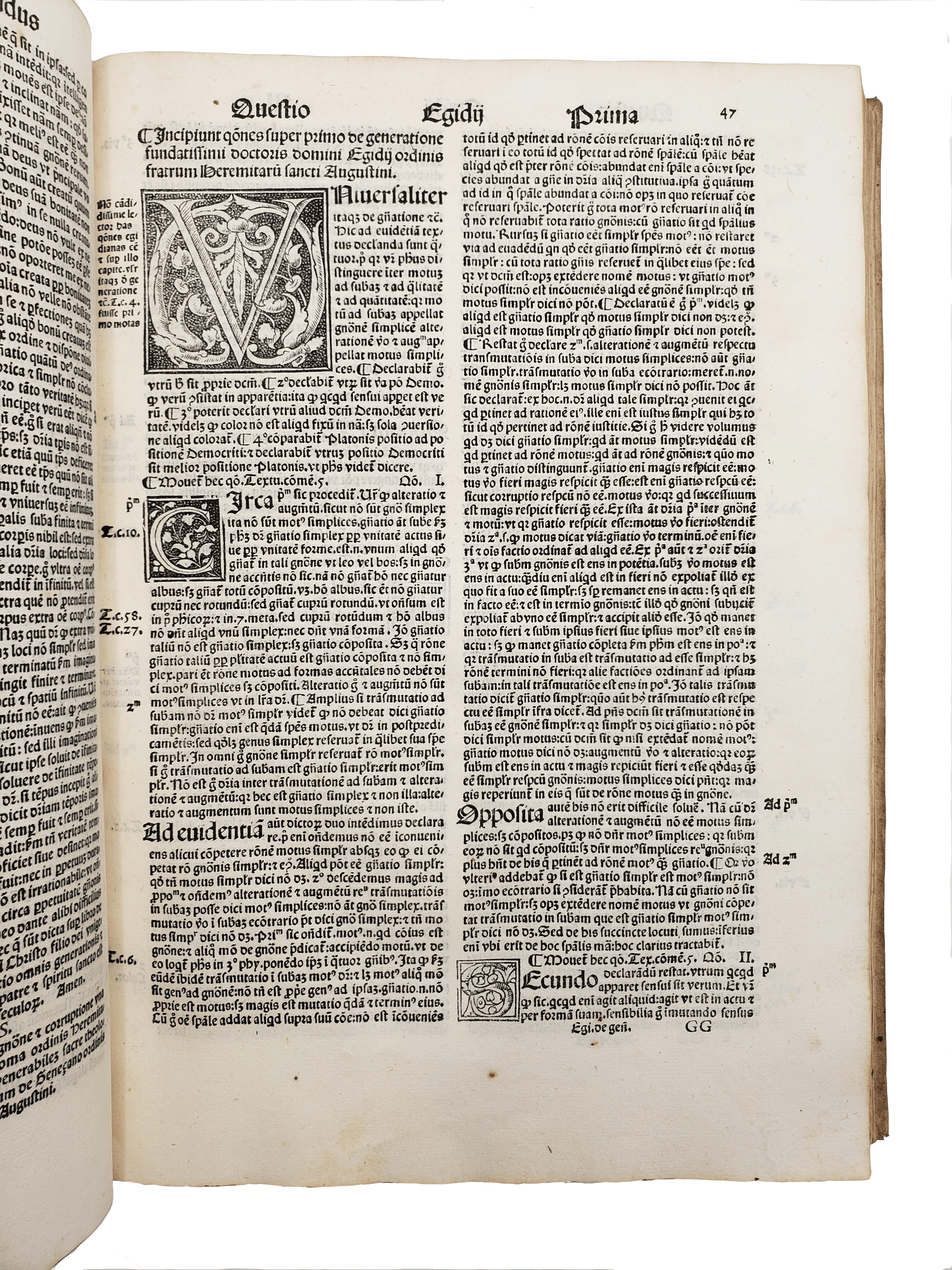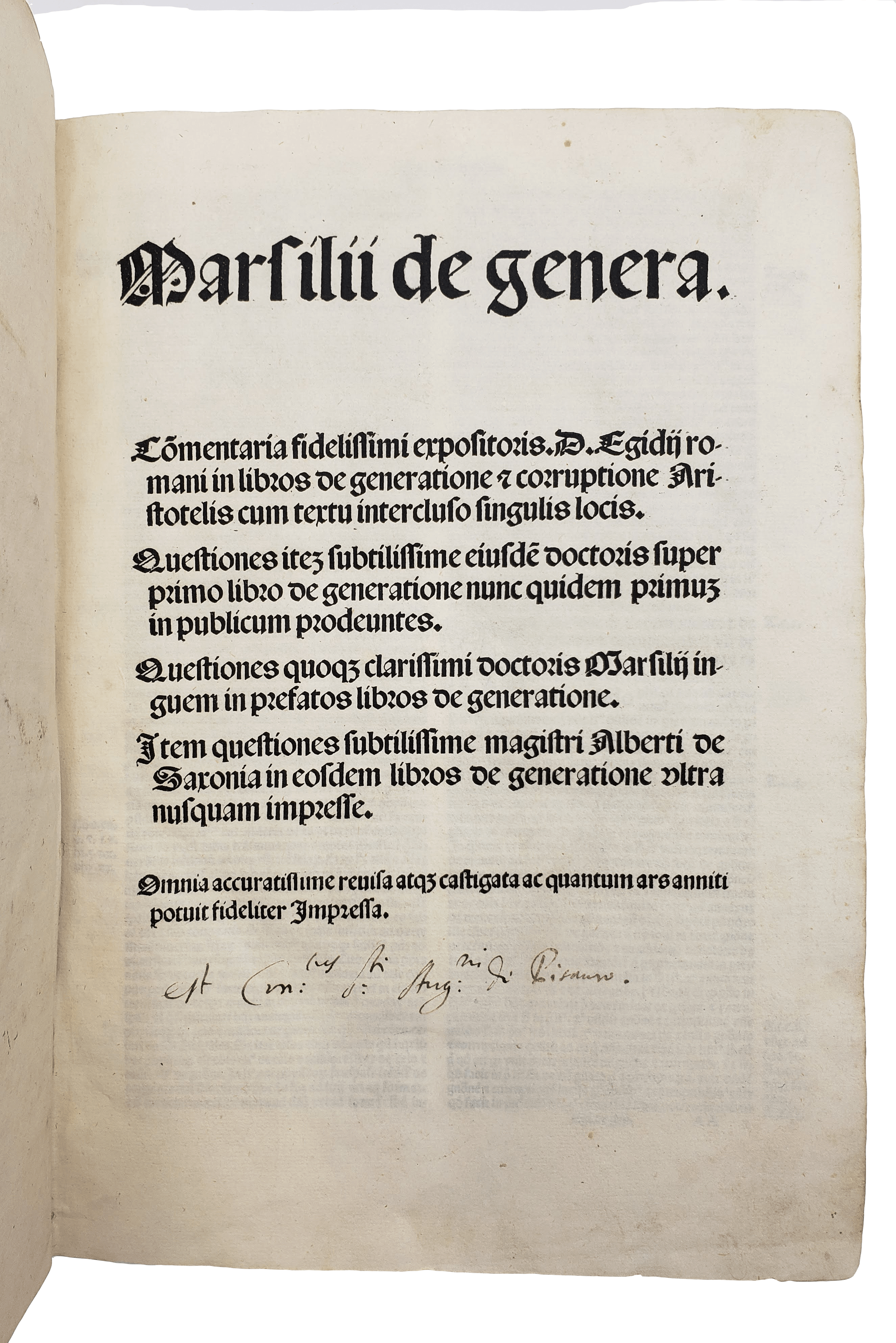 Excellent, clean copies of early medico-philosophical commentaries on Aristotle. The first gathers together four medieval commentaries on Aristotle’s ‘De generatione et corruptione’, by Marsilius van Ingen, a C14 Dutch Scholastic philosopher, Aegidius Columna, a C13 Augustinian theologian and philosopher, and Albert of Saxony, a C14 German philosopher and mathematician. ‘As far as we know, most of these commentaries were written for use in a university setting. As a consequence, the choice of texts commented upon and the degree of detail given to a certain passage is often due, at least in part, to its use in a classroom, a universitarian debate or its relevance for exams’ (Stan. Enc. Phil.). One of Aristotle’s most empirical writings, ‘De generatione et corruptione’ examines how natural substances come into being or come to be dissociated/destroyed. He provides a definition of the Four Elements, which had long-lasting influence on philosophy, astrology, medicine and physiology well into the early modern period. Aristotle also analyses the difference between generation (ex-novo) and alteration (change that transforms one substance into another, without destruction), and substance mixtures. Structured traditionally in the form of quaestio and expositio, the commentaries of Marsilius van Ingen and Albert of Saxony were generally published together, especially in Italy. The second work, by Aegidius Columna, is a commentary on Aristotle’s ‘De anima’, which has been called the first book of scientific psychology. It was read by medical students to understand how a creature could be defined as ‘living’ or ‘having a soul’, the nature and kinds of soul (vegetative, animal, rational, etc.), reproduction, nutrition, the senses and the concept of sensation, the intellect, and movement according to the number of senses possessed. These fundamental questions were argued by physicians, for instance, when determining whether/when a foetus was ‘alive’ or how movements are generated through the brain and nerves. The C16 annotator of this copy was a careful scholar who noticed and corrected mistaken references to chapters and sections, cross-referenced other works by Aristotle or John Scotus, and noted Averroist readings. He glossed sections on the substance of the soul, and its connection with the body, and in the intellect, among others.