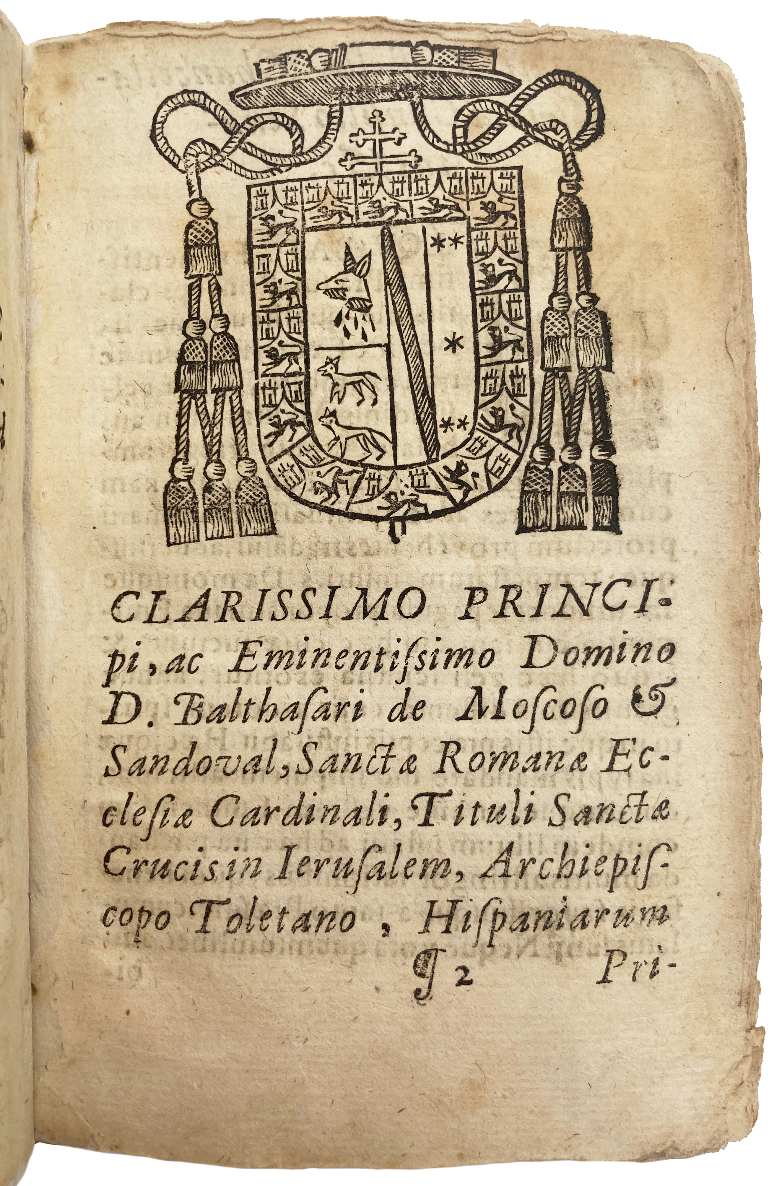 Two issues of this ed. are recorded, priority not established. The first (e.g., this one and BNE) with 8 ll. of preliminaries, and the woodcut arms of the bishop Baltasar de Moscoso y Sandoval (mentioned in the title); the second with 12 ll. and the arms of the Marquis de Lapilla. As Lapilla shared one of his shields with bishop Baltasar, they were probably related and Lapilla became the new dedicatee at some point, for reasons unknown.
