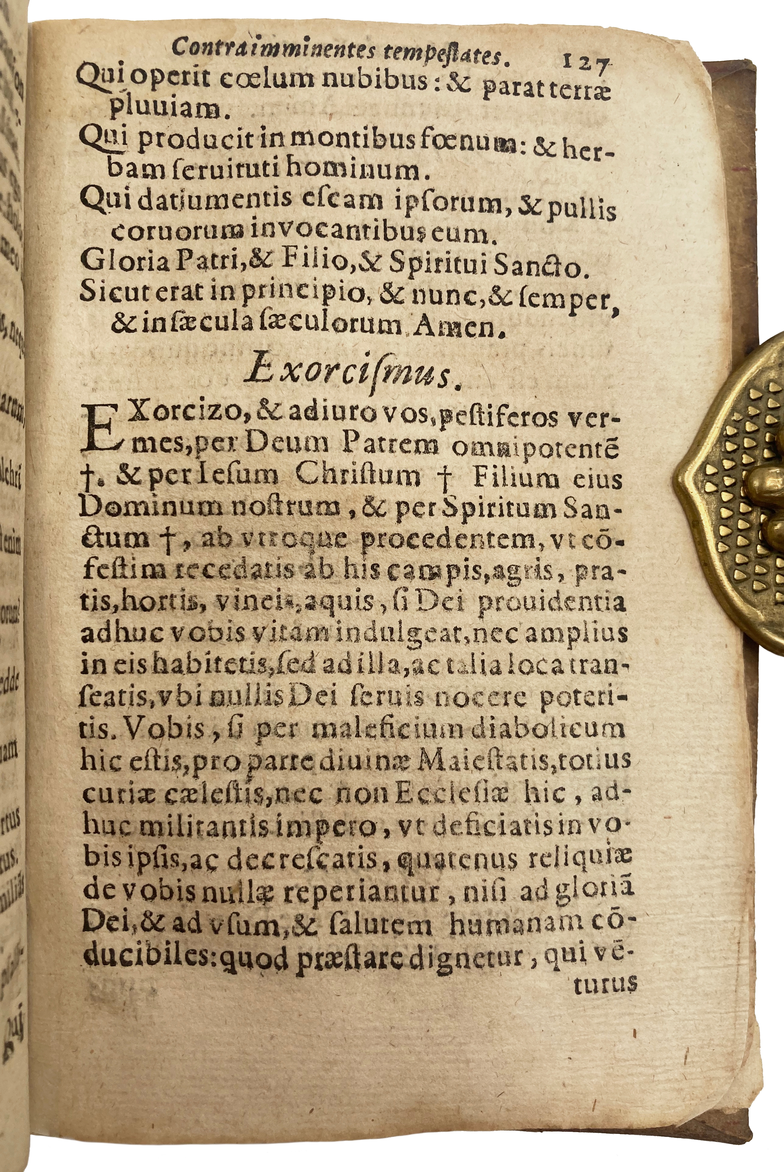 The first edition of this very scarce, pocket-size vademecum for exorcists, in its original ms binding. All we know about Pedro Jimenez (or Ximenez) de Arellano survives on this titlepage, which states he was a lawyer of the Royal Senate, previously a priest. ‘Manuale’ begins by examining the requisites of a good exorcist – strong faith, true humility, virtues – and how he should prepare before an exorcism, e.g., that he should dress in a certain manner, bring a crucifix, have candles lit, and recite specific prayers. There follow sections with instructions for exorcism in connection with specific issues – e.g., tempests, thunder, lightning, and hail, as well as other calamities and great misfortunes; using litanies of the Virgin Mary, invocation of the saints, or the mysteries of the Holy Trinity; against poisonous or possessed animals or pests (e.g., snakes, caterpillars, mice and rats, locusts); infected water; the plague and fevers; haunted houses, and so on. It also features blessings such as of candles, incense, branches, herbs (on St John’s and St Laurence’s days), and litanies designed to work in variety of circumstances. Each section explains all the gestures the exorcist or priest should make, and all the orations, conjurations, and prayers he should recite. This manual is a most interesting instance of the way Counter-Reformation techniques were used to maintain control over popular rituals – e.g., in case of severe weather, illness, dangerous circumstances or inexplicable events – substituting the prayers of the Holy Church to those of the folkloric tradition. A scarce and very interesting work.