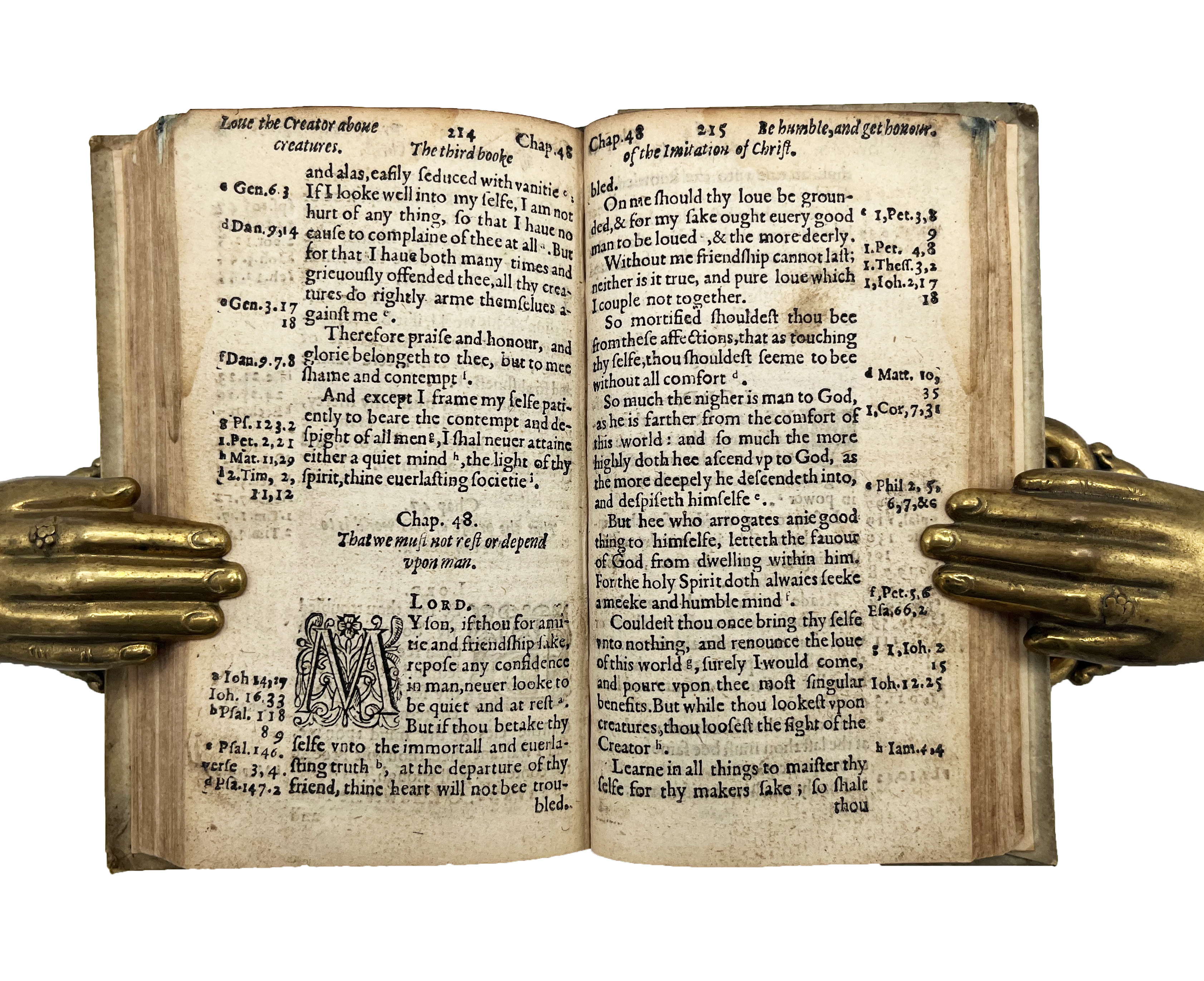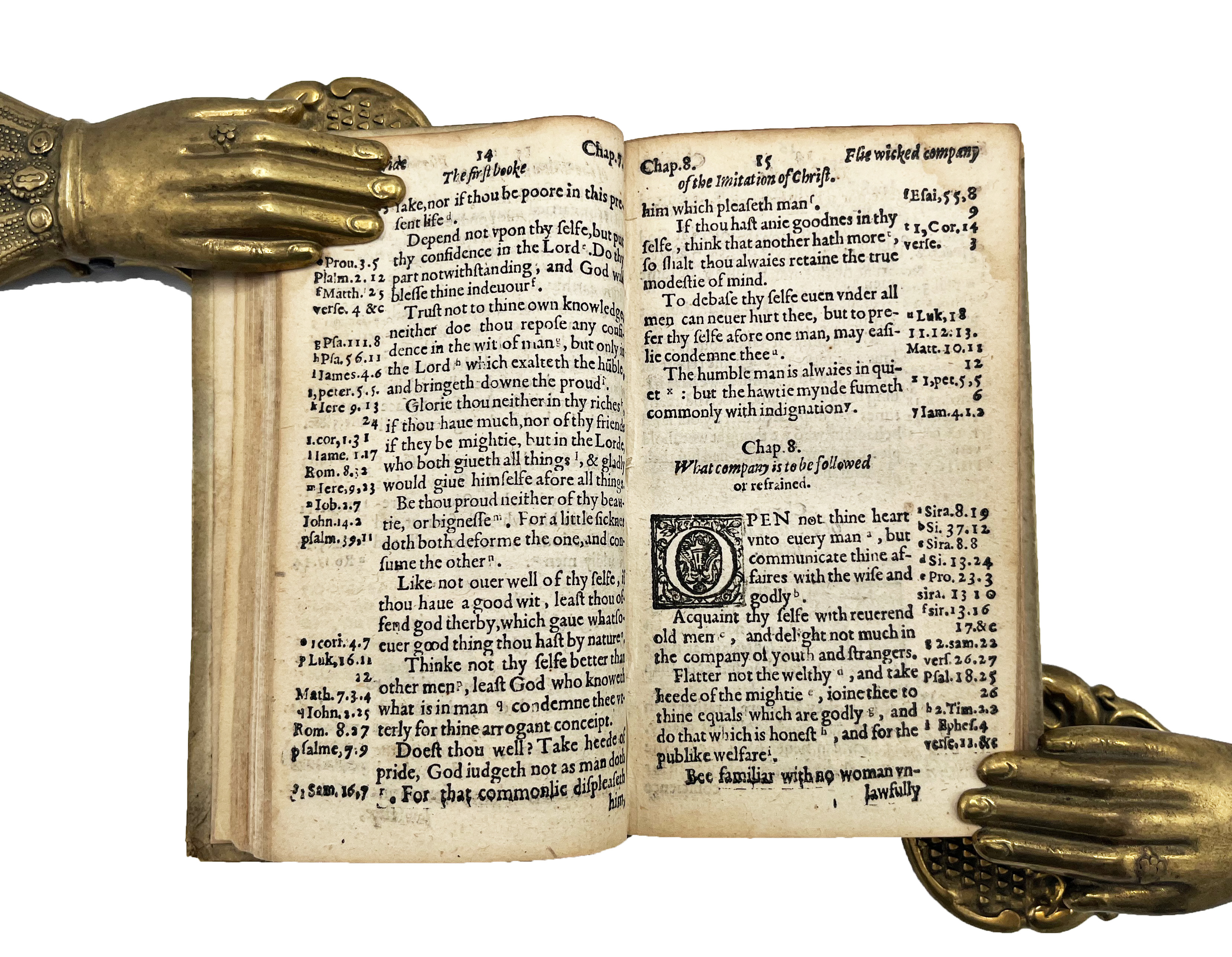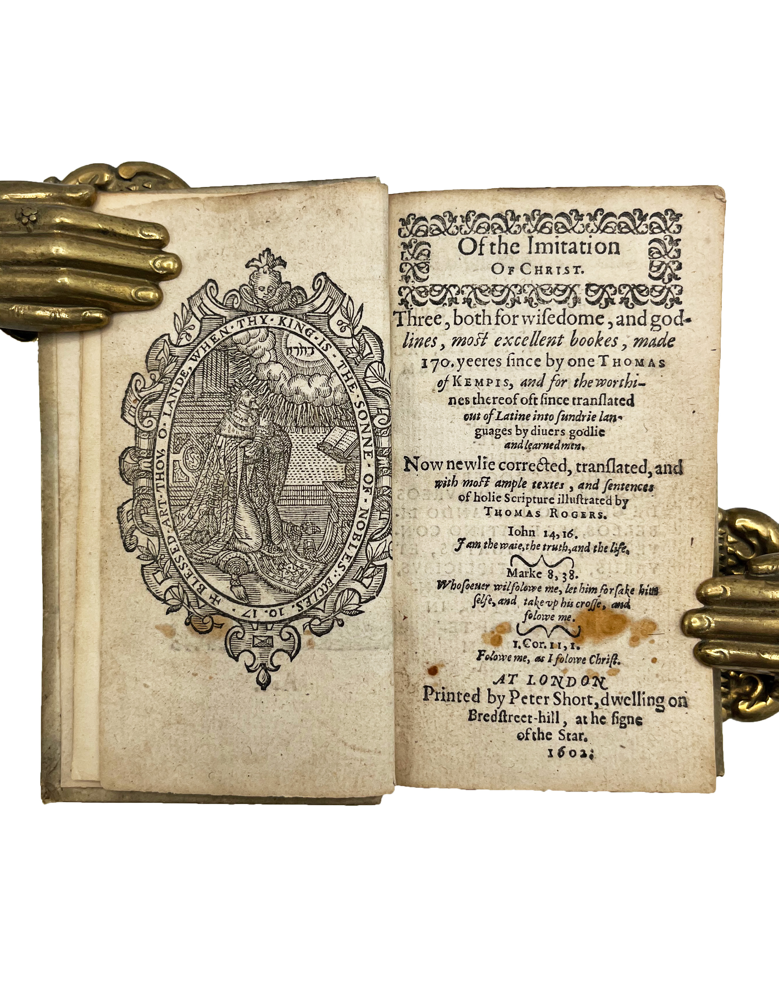 A rare and lovely English edition of the first three books of Thomas à Kempis’s hugely influential spiritual guide, the popular translation of Thomas Rogers (d. 1616), first published 1580. Rogers published a translation of the fourth book, the Soliloquium animae, in 1592.
