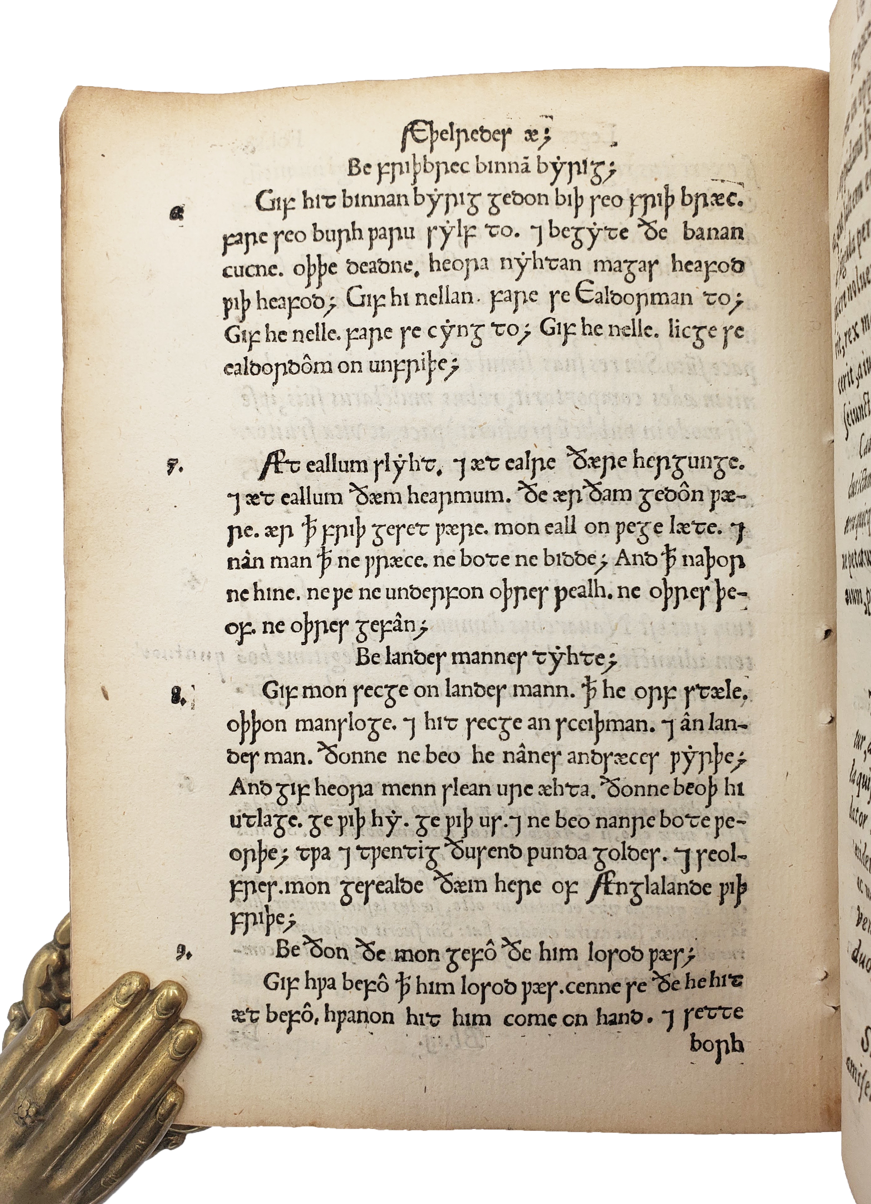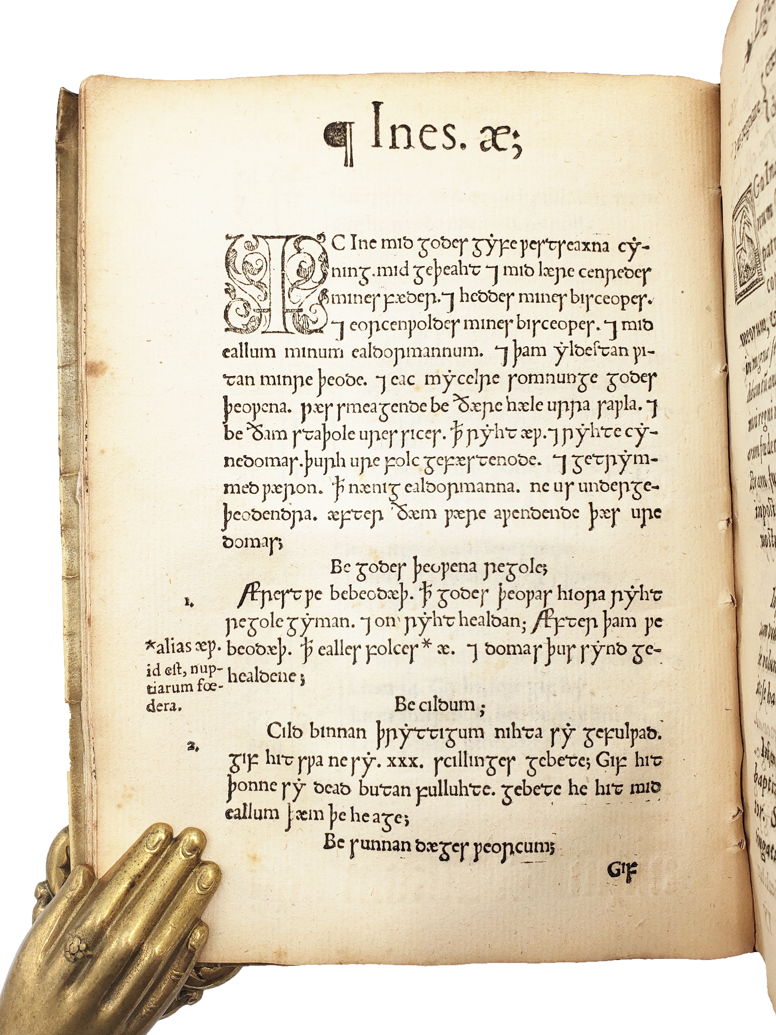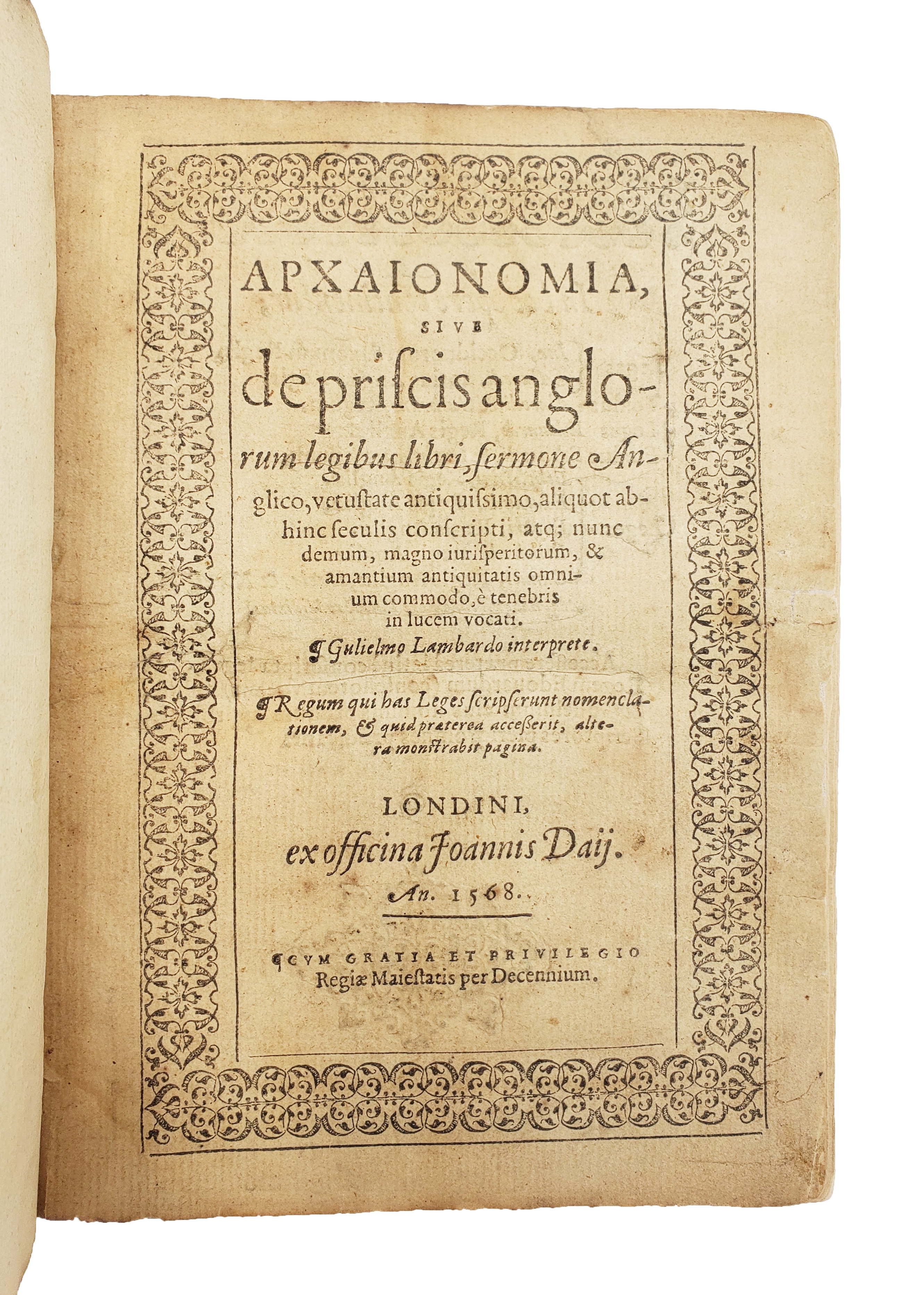 Continuing work by, and using the manuscripts of, the antiquarian Lawrence Nowell, Archaionomia was published as part of Archbishop Matthew Parker’s project to identify a cohesive and independent Anglo-Saxon church that could be used to advance the legitimacy of the Elizabethan Settlement of 1559. It was felt that publishing Anglo-Saxon royal legal codes would promote the image of a royally sanctioned, primitive English church that had existed before the corruptions of medieval Catholic canon law and papal authority. Equally the use of John Day’s recently introduced Anglo-Saxon type was part of a linguistic project to advance the use of the vernacular in the English church, preceded by Day’s printing of Parker’s Testimonie of Antiquitie, which reproduced a sermon in Old English with modern English translation.