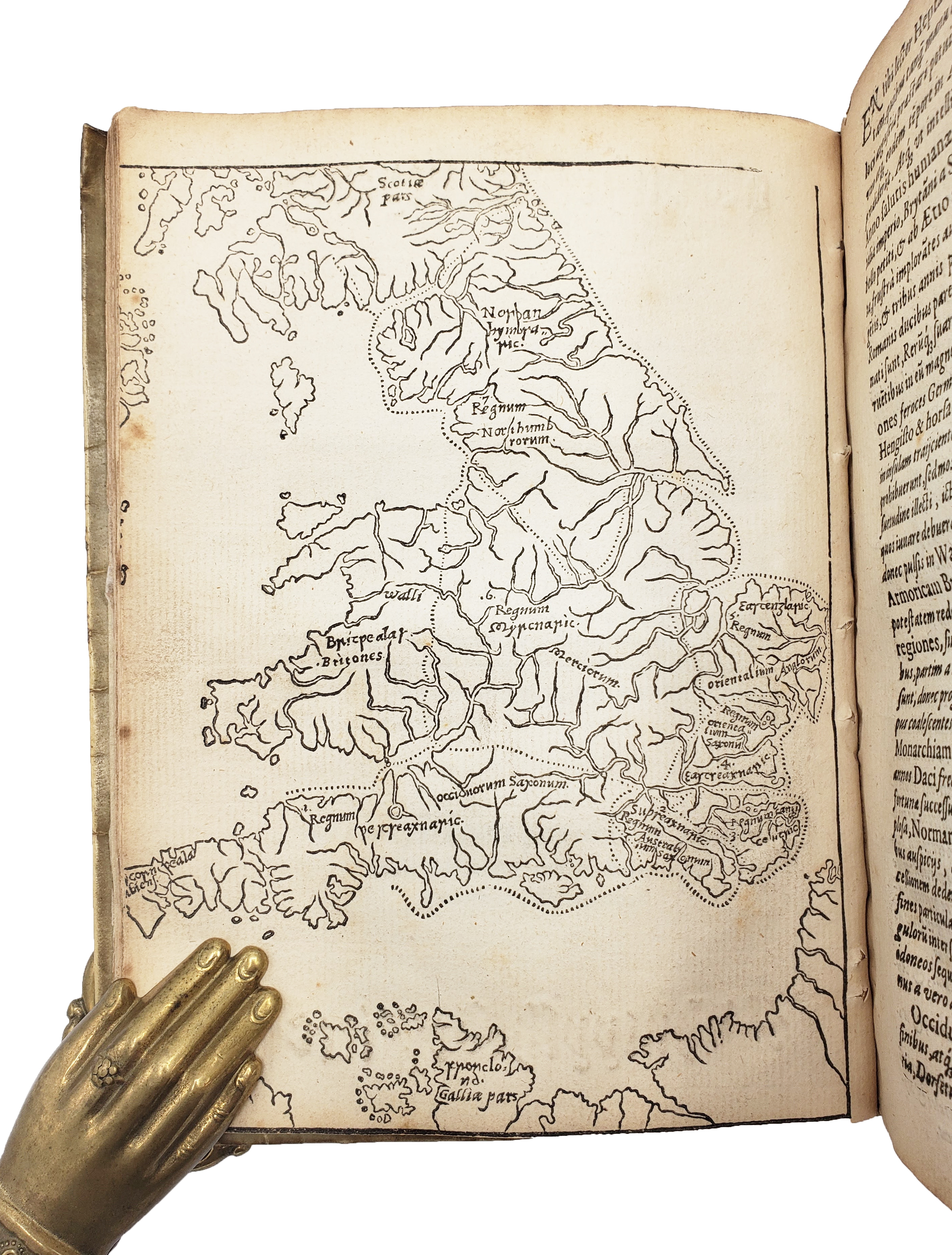 FIRST EDITION. 4to. ll. (xix) 140 (iii). Roman, italic and Anglo-Saxon letter. T-p within typographical border. Full-page woodcut map of England and Wales. Woodcut initials, typographical head- and tailpieces. Contemp. limp vellum, remains of ties, spine with later gilt lettering. One or two contemp. ms. annotations in ink, contemp. inscription in a different hand to rear fly: ‘At the returne of this booke I am to repay 10s – Lawrence Sadler.’ First quire browned, and t-p repaired at fore edge, second quire with light waterstain to lower half, occasionally recurring, waterstain to margin of Gg3. Last few quires with very faint intermittent wormtracks to upper margin, not affecting text. Light yellowing and spotting, a good copy.